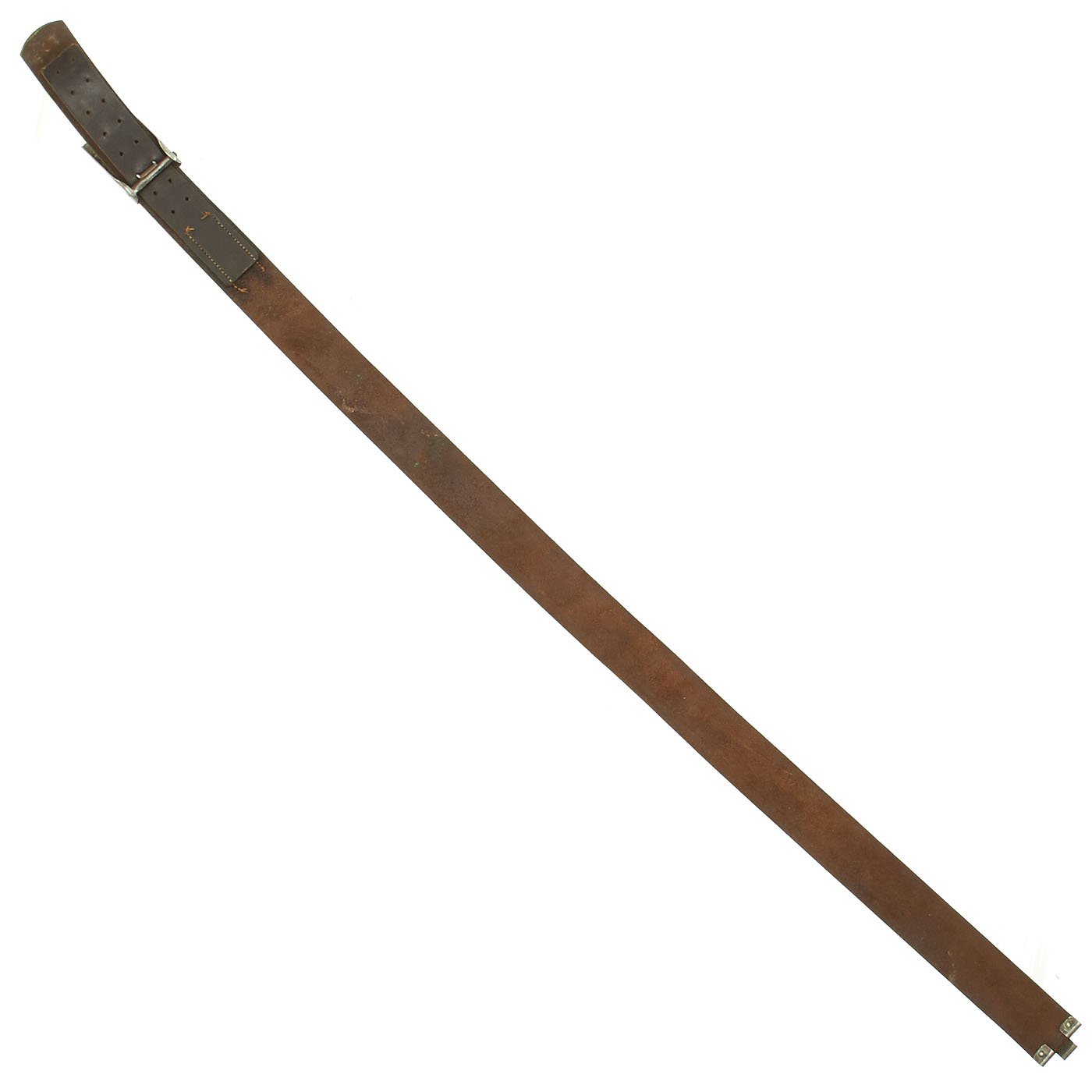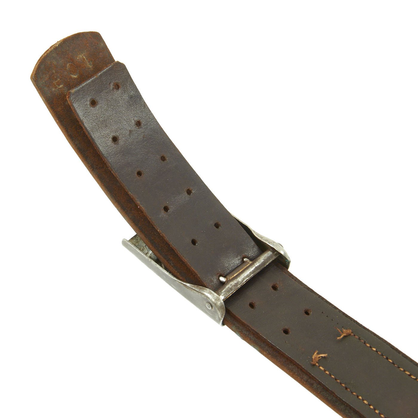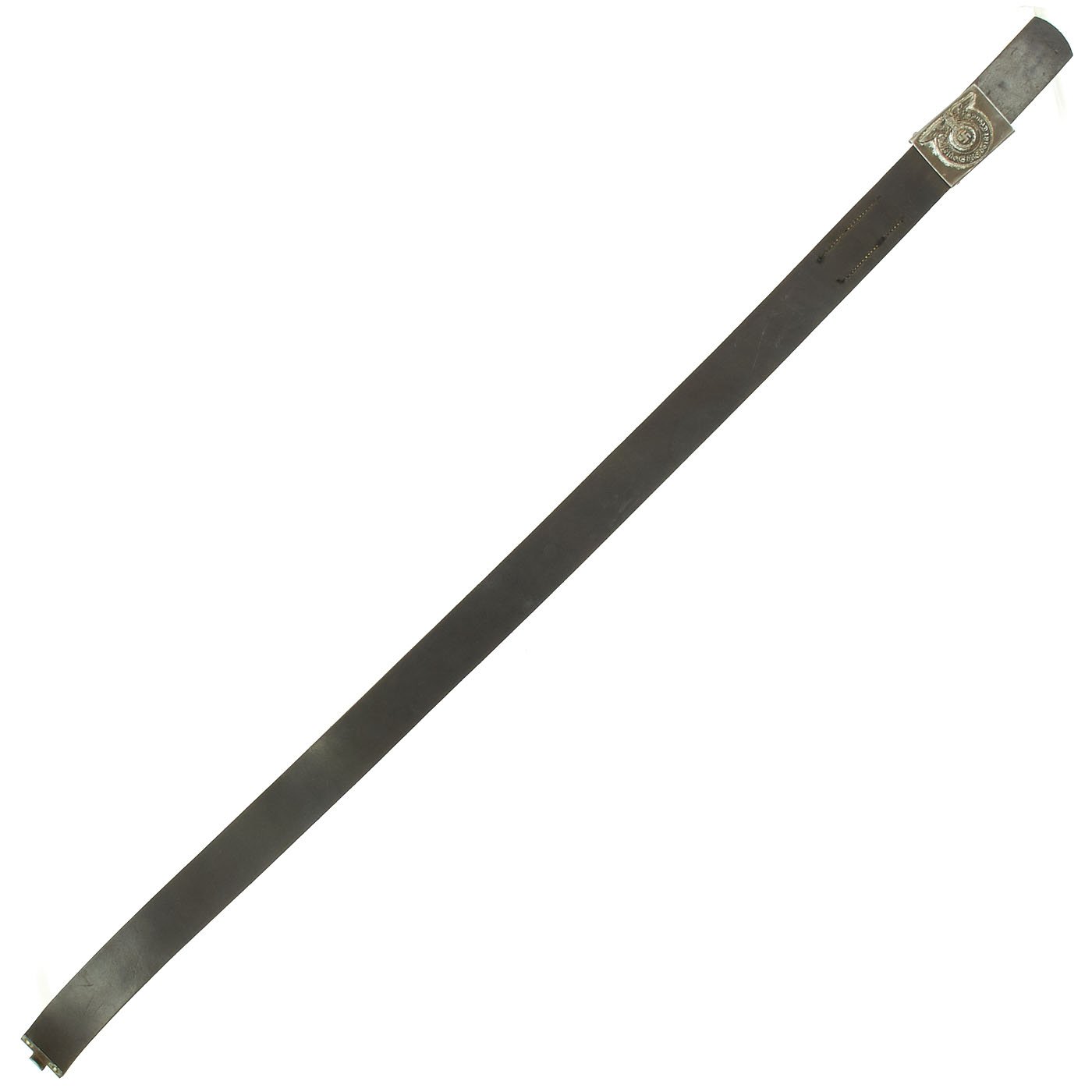 Original Item: Only One Available. This is a very nice WWII German Schutzstaffel (SS) EM/NCO's Steel Painted Belt Buckle (Koppelschloß) with correct leather belt. It is embossed with a high relief, embossed, central motif pattern consisting of an SS style national eagle with out-stretched wings, clutching a wreath, encompassing a static swas. The swas and wreath are in turn encompassed by a circular, simulated, twisted rope border with the Gothic script motto, Meine Ehre heißt Treue!, (My Honor is Loyalty!). The original aluminum paint finish on the buckle is unfortunately quite worn on the outside surface, but a lot of the paint is retained on the interior. This is typical of a belt used in service.