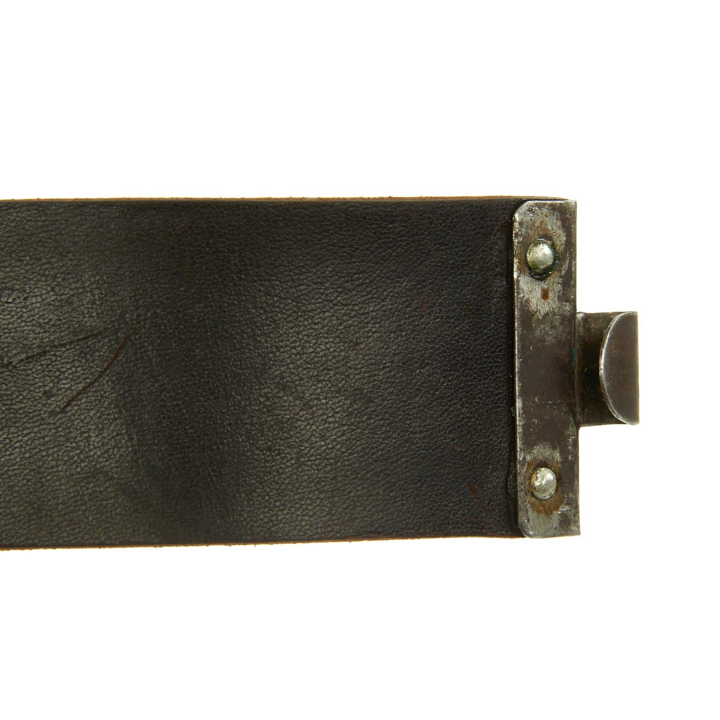 The belt itself measures 44” when fully extended, and is marked 108 on the buckle end (108cm is about 43 inches). The leather is somewhat worn, but condition is solid with no holes or tears, and leather is soft and pliable. The leather of the belt is in quite good condition, with a lot of the original textured black finish present. The steel end hook is the correct style for an SS belt, and also has traces of the original aluminum paint.