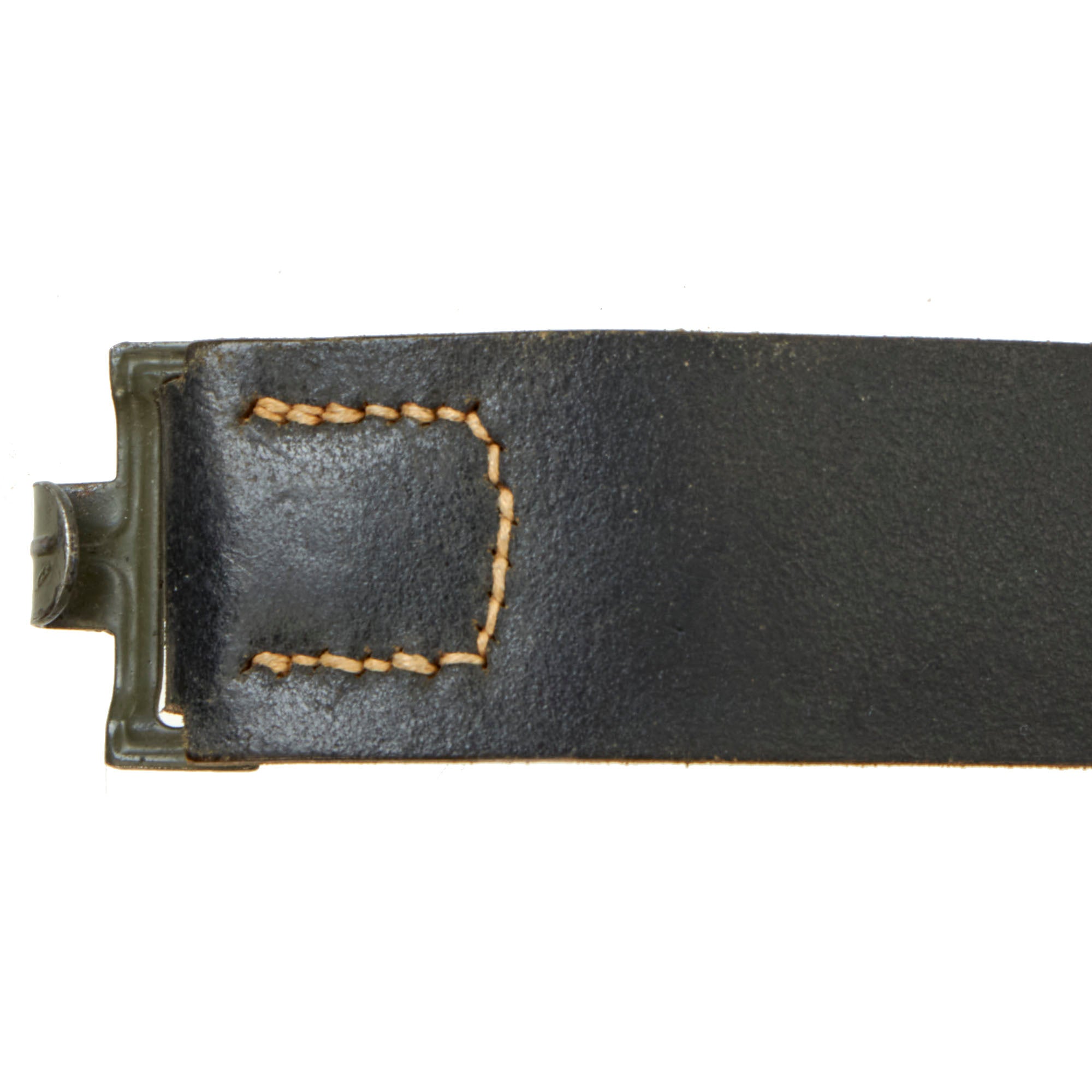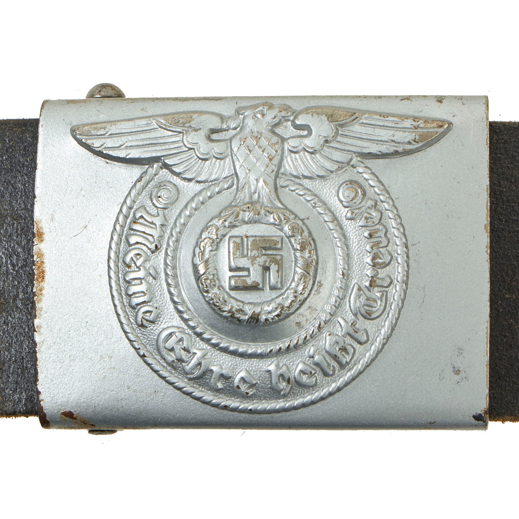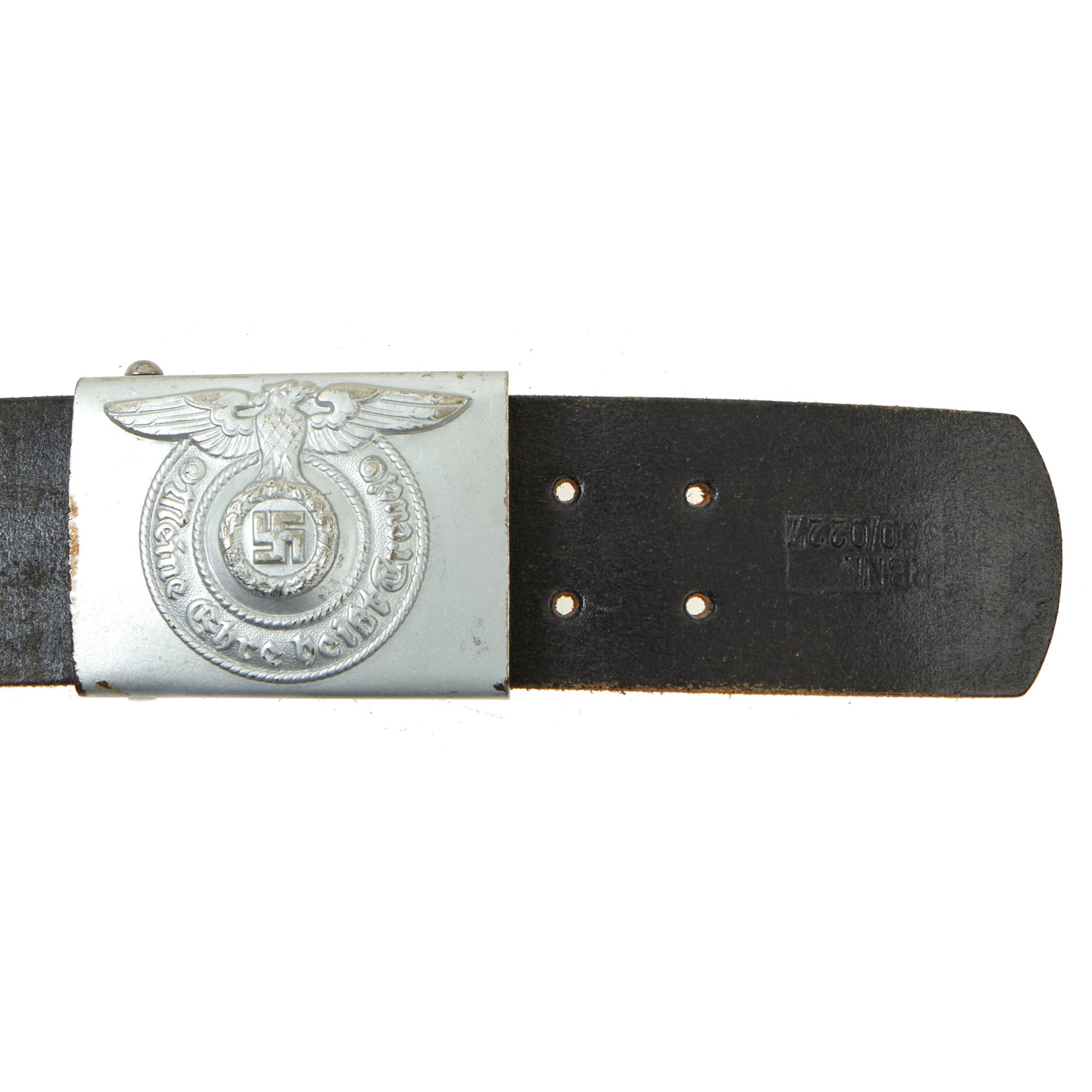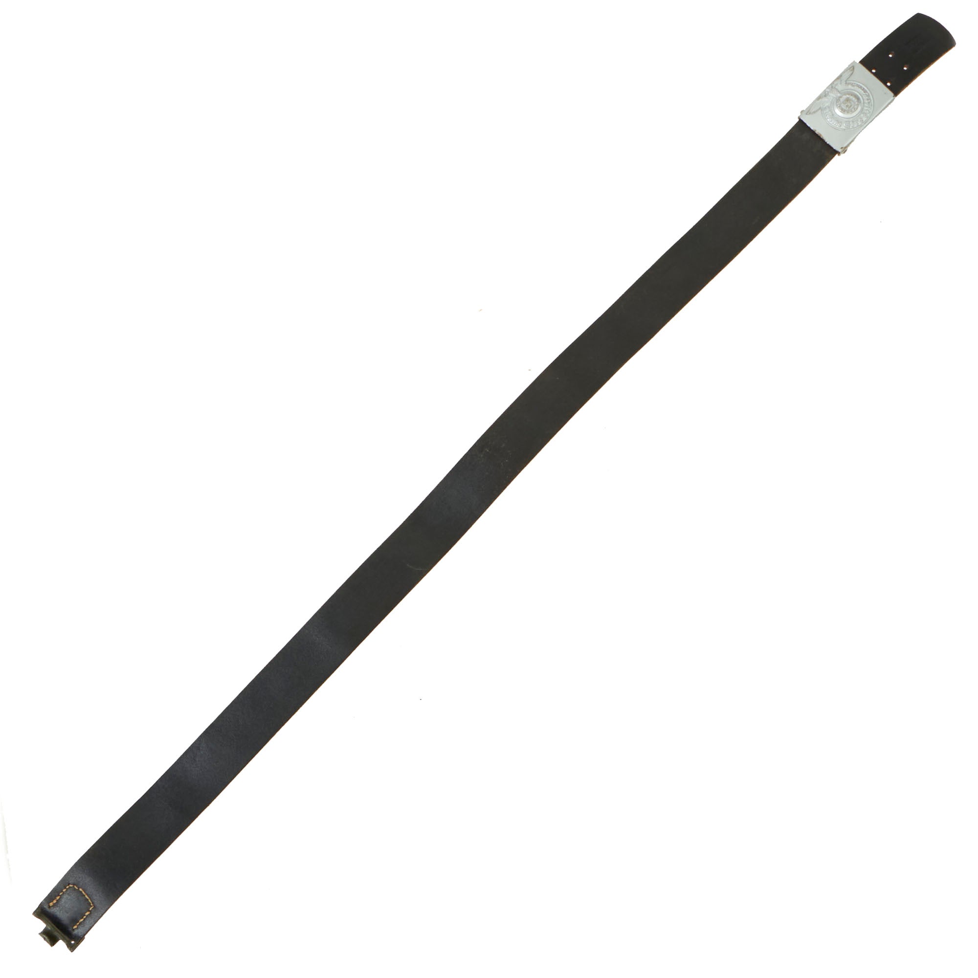 Original Item: Only One Available. This is a lovely black leather SS belt, with a very good condition WWII German Schutzstaffel (SS) EM/NCO's Steel Painted Belt Buckle (Koppelschloß). It is the correct stamped steel box type with an embossed with a high relief, embossed, central motif pattern consisting of an SS style national eagle with out-stretched wings, clutching a wreath, encompassing a static swas. The swas and wreath are in turn encompassed by a circular, simulated, twisted rope border with the Gothic script motto, Meine Ehre heißt Treue!, (My Honor is Loyalty!).