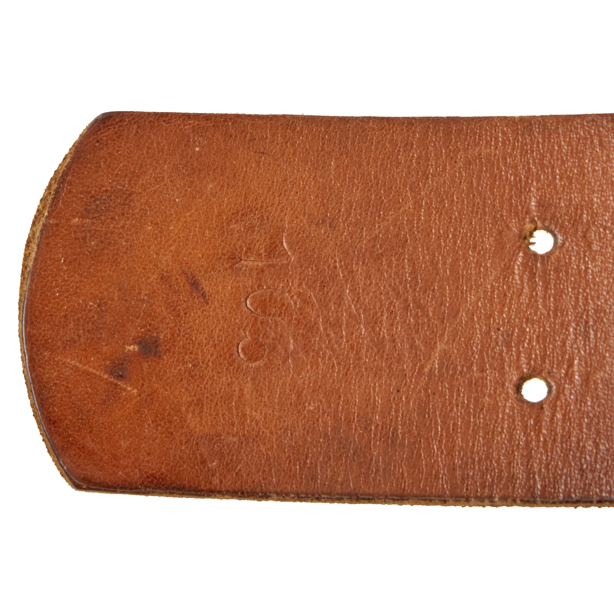 The included belt is in excellent condition, and shows only signs of light use. It has a partial RBNr. stamped on the front, and is the type that has the length adjustment holes punched directly into the belt itself, not on a separate leather tab. It has a bit of oxidation and wear on the end clip, but nothing major. It measures about 41 inches in overall length, and is stamped with 105 on the end, for 105cm (41.3in.)