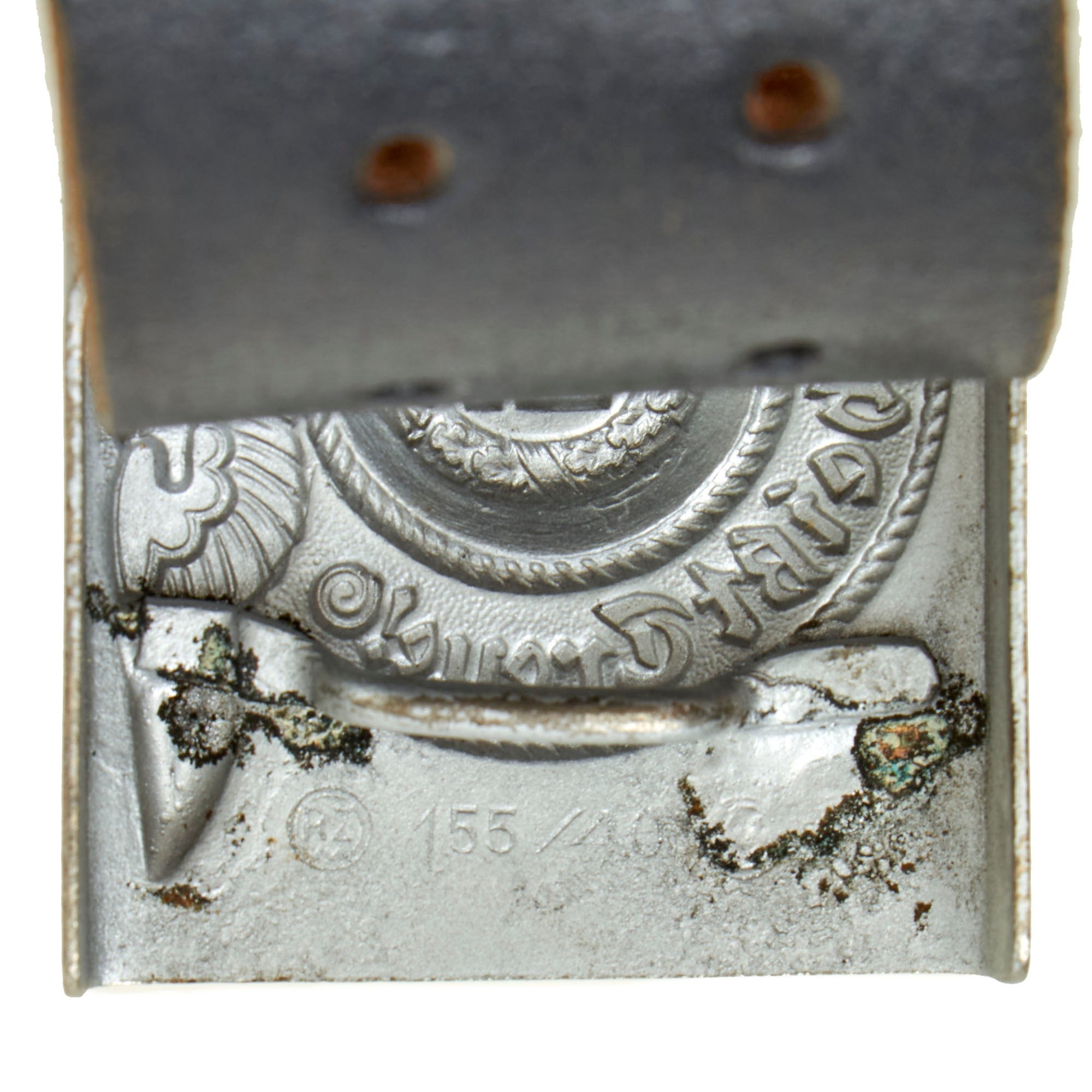 This example looks to originally have been made with a nickel plated finish, but was refinished with aluminized paint and possibly repaired during the war, after which it was put back into service, acquiring additional wear. You can see some of the original nickel plating on the insignia where the paint has worn through. The rear of the buckle is marked ((RZM)) 155/40 ((ᛋᛋ)), indicating 1940 manufacture by F. W. Assmann & Söhne of Lüdenscheid, a well-known manufacturer of buckles and other accoutrements. This was after the change to steel manufacture.