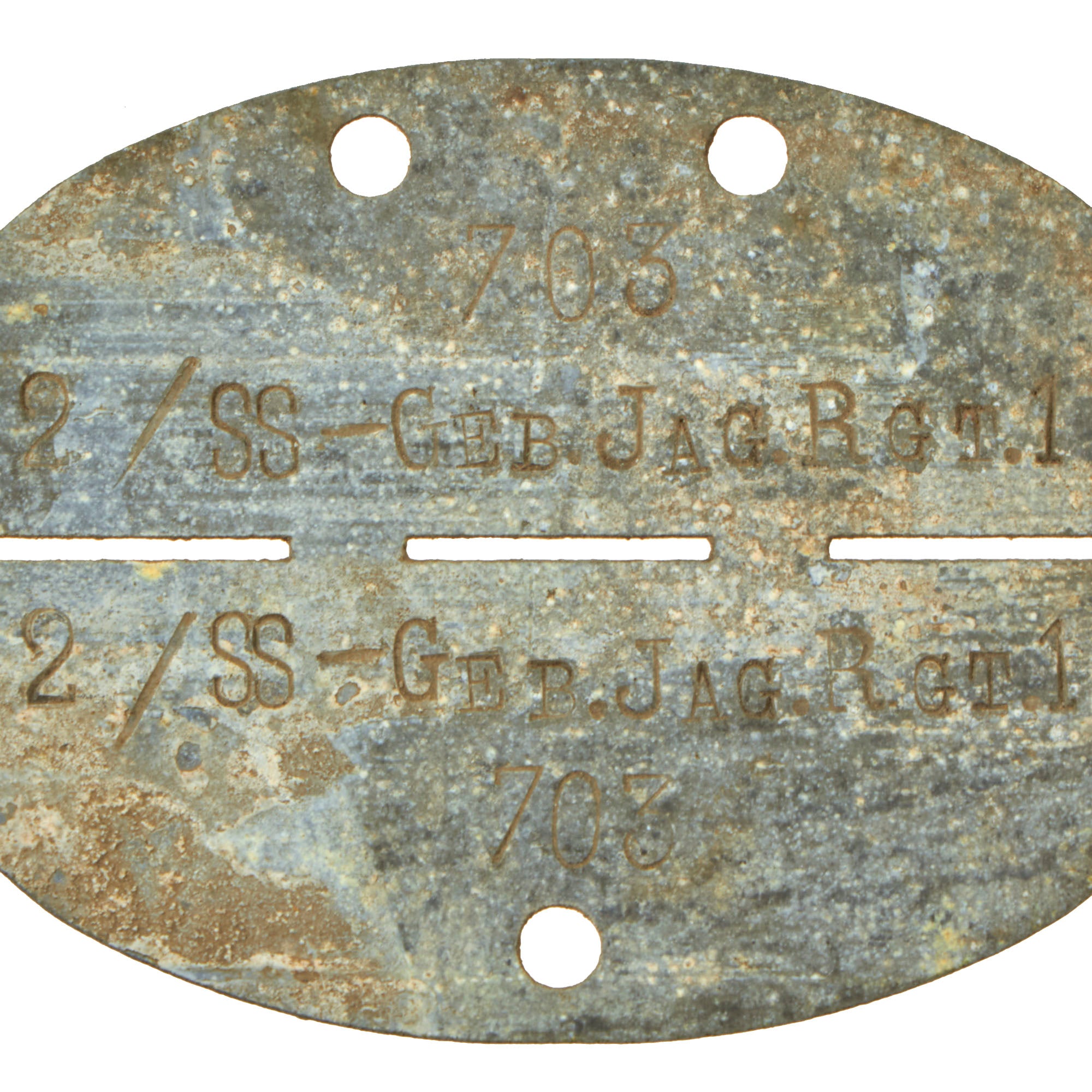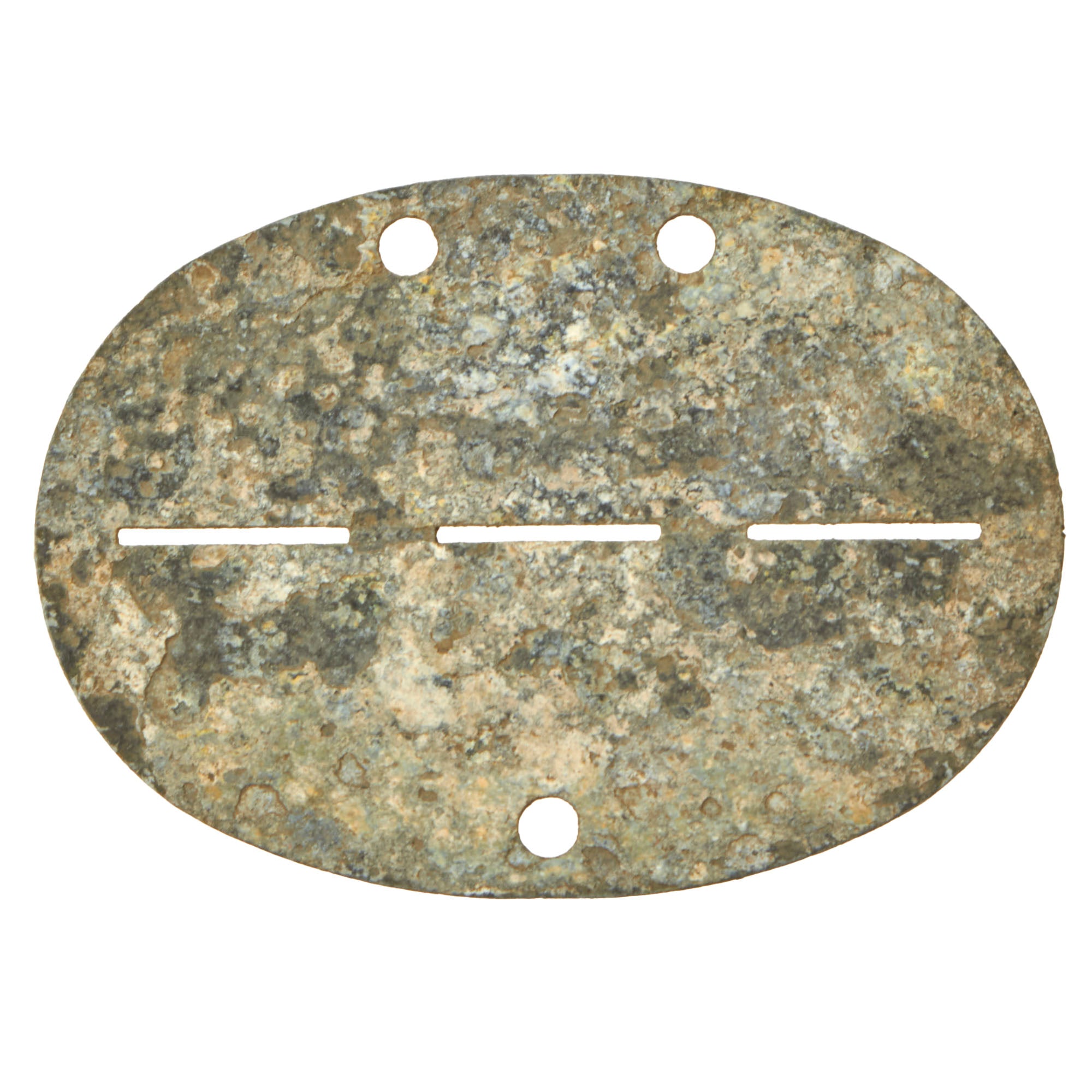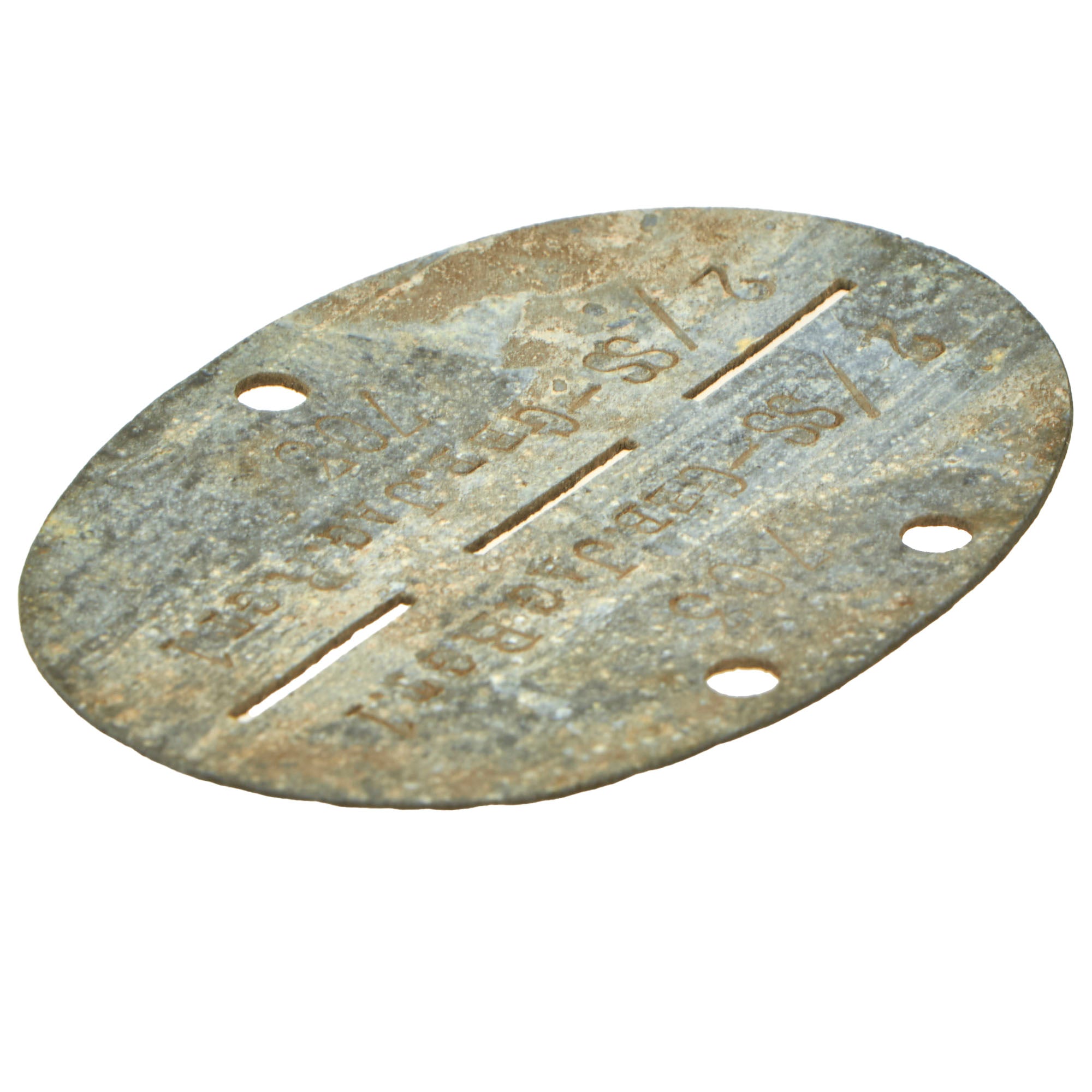 Original Item: One-of-a-kind. This is a genuine German WWII SS identity disc (aka; Dog Tag) Erkennungsmarke, used to identify soldiers in the field. These were made of plated steel, aluminum, or zinc, and were designed so that if a soldier died, the bottom half of the tag would be broken off, while the other half remained with their body.
