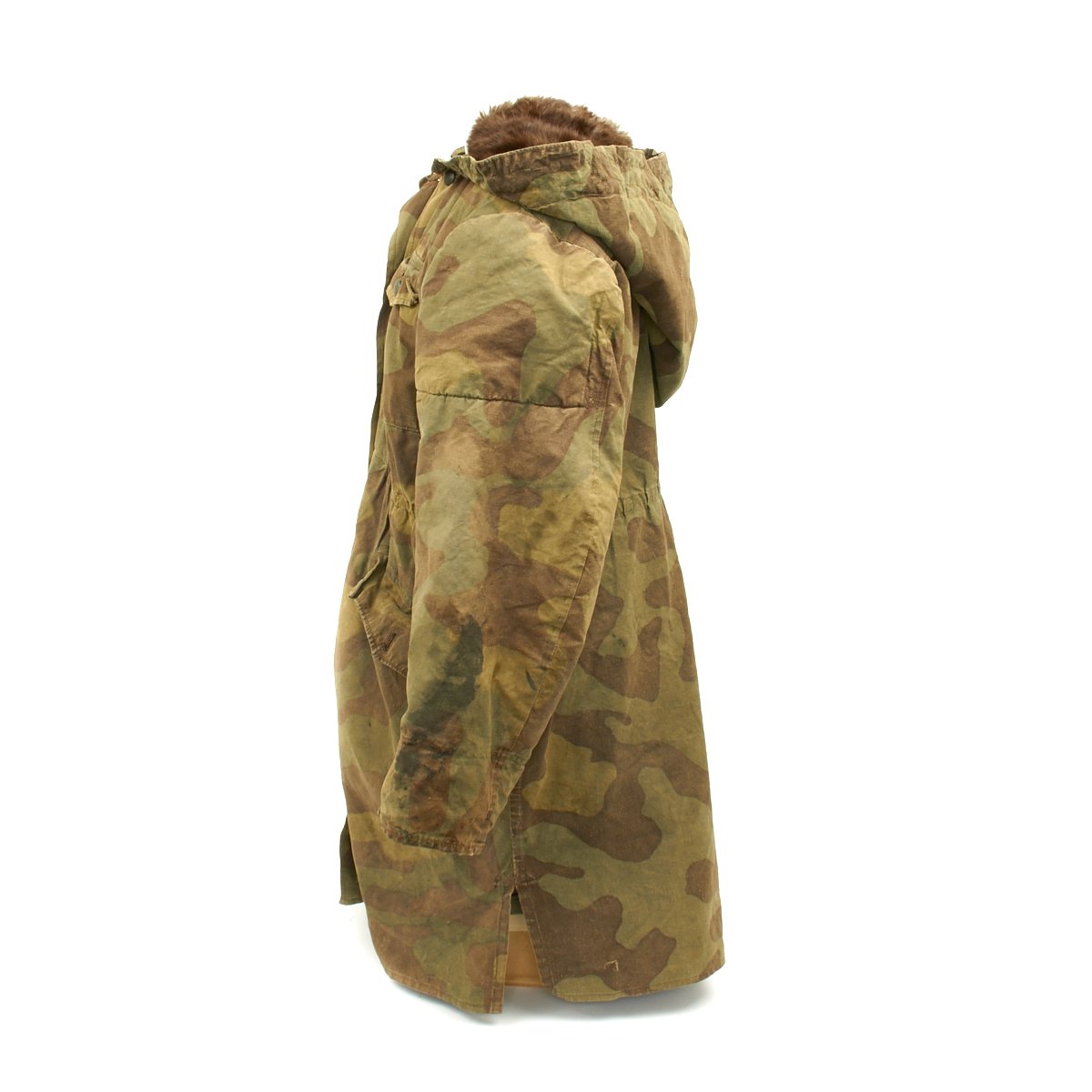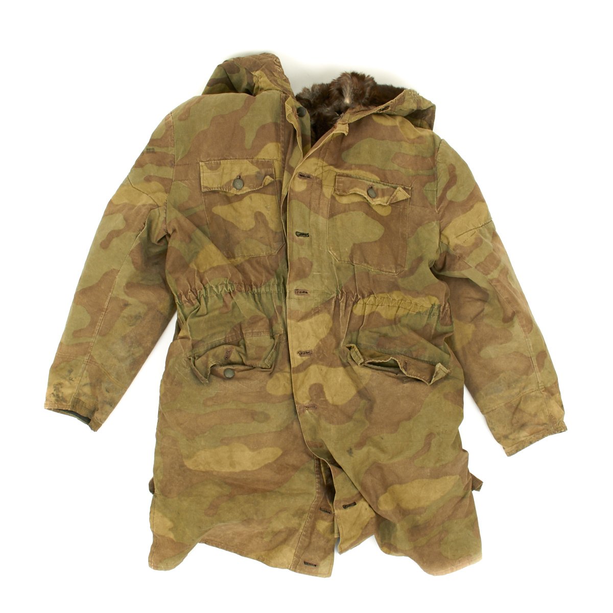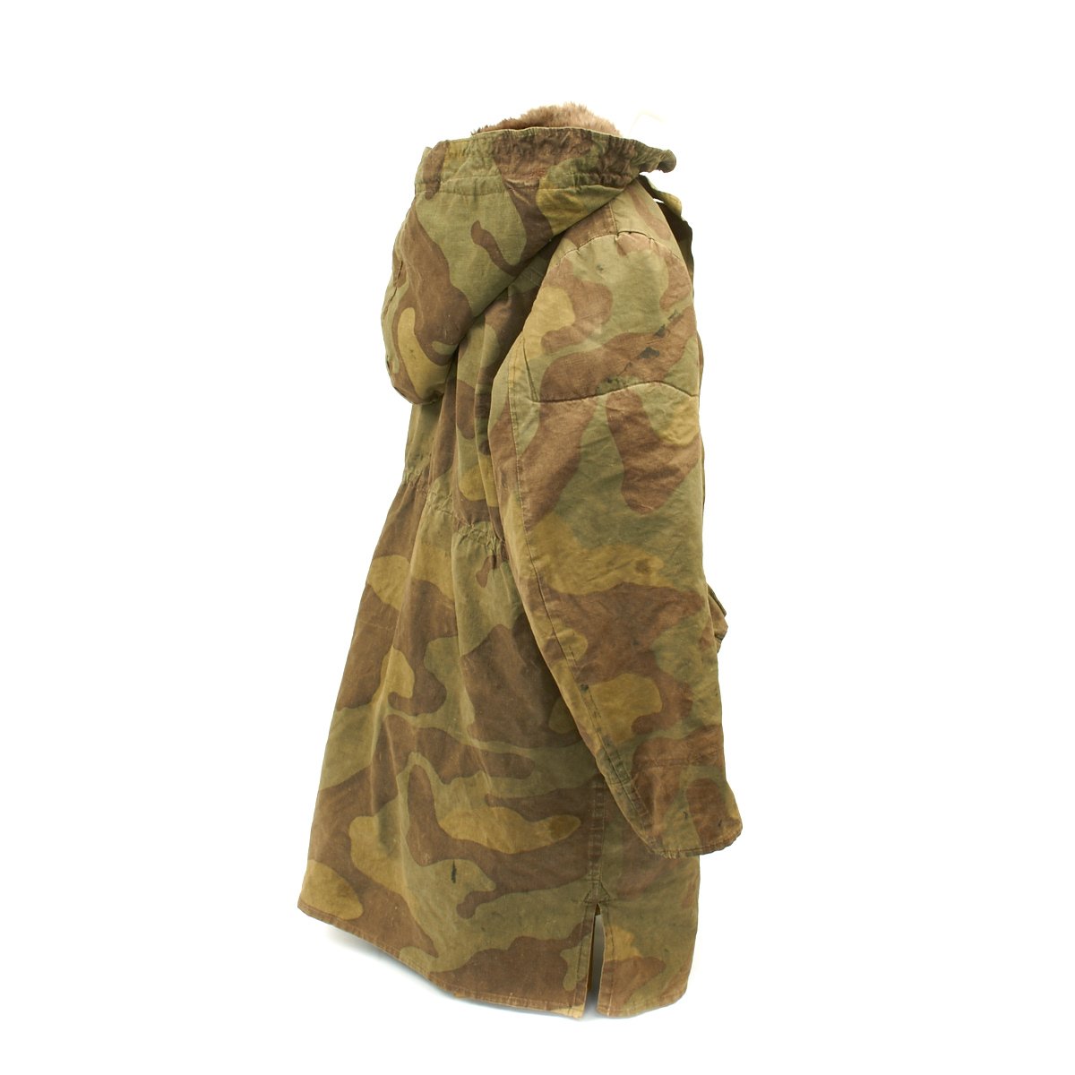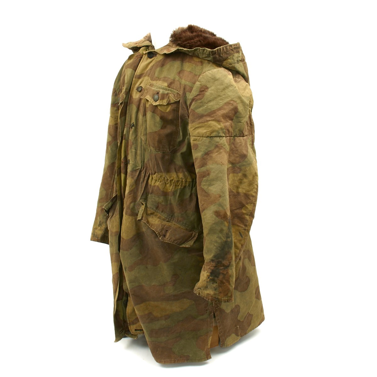 The M43 fur-lined winter parka was designed in mid 1943 and featured with a full length button up front closure, it was introduced in early 1944. This Italian camouflage M43 Khakrov parka was made from spare fabric that the Germans liberated from Italian Army camps. The Khakrov Parka was so named as it was used by SS units fighting in the Cold winter of the Russian front .