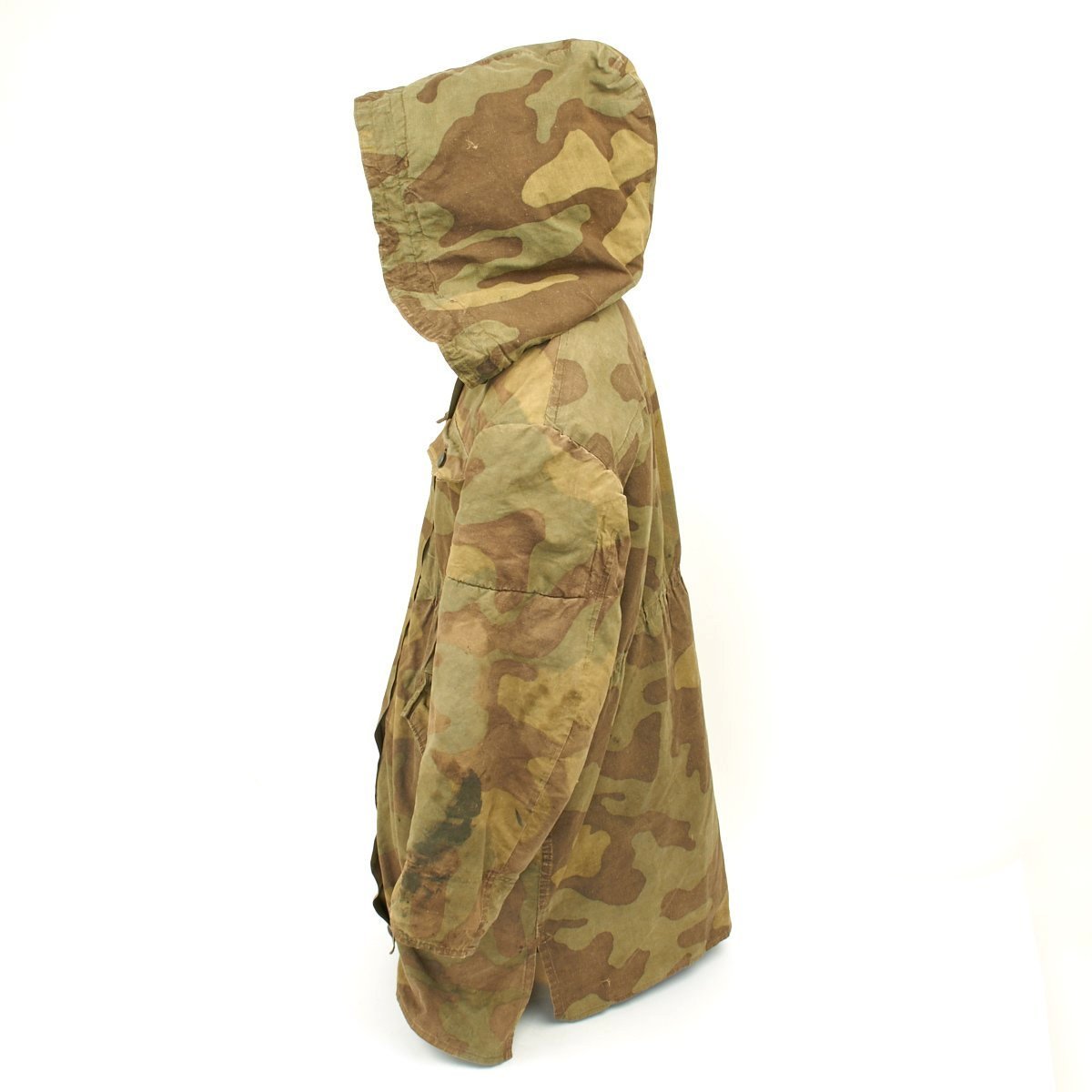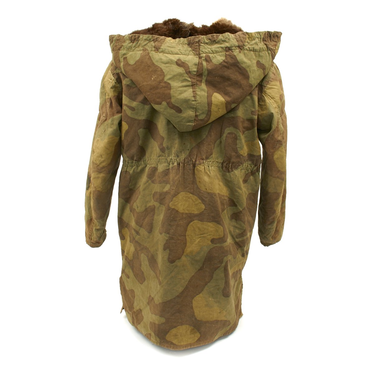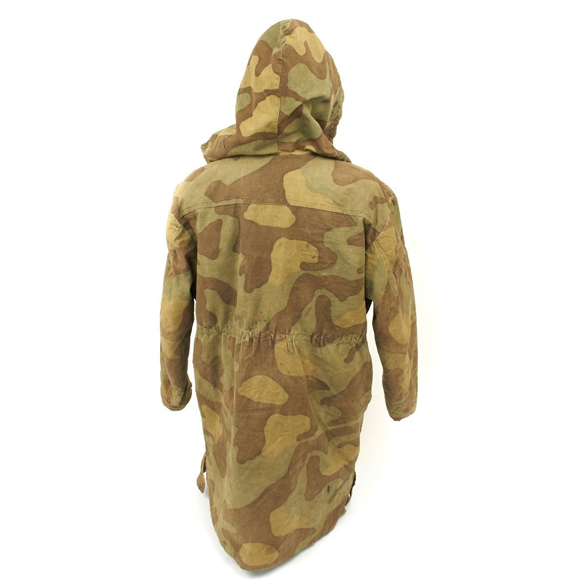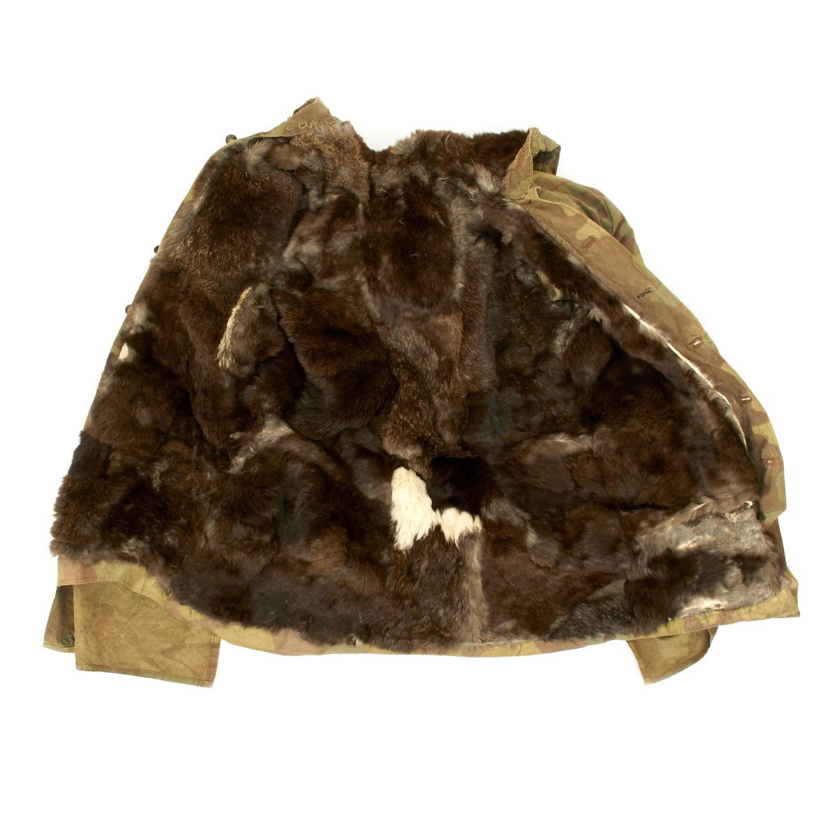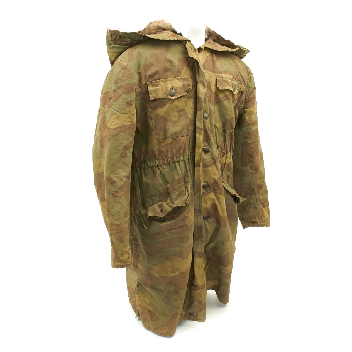 The M43 fur-lined winter parka was designed in mid 1943 and featured with a full length button up front closure, it was introduced in early 1944. This Italian camouflage M43 Khakrov parka was made from spare fabric that the Germans liberated from Italian Army camps. The Khakrov Parka was so named as it was used by SS units fighting in the Cold winter of the Russian front .