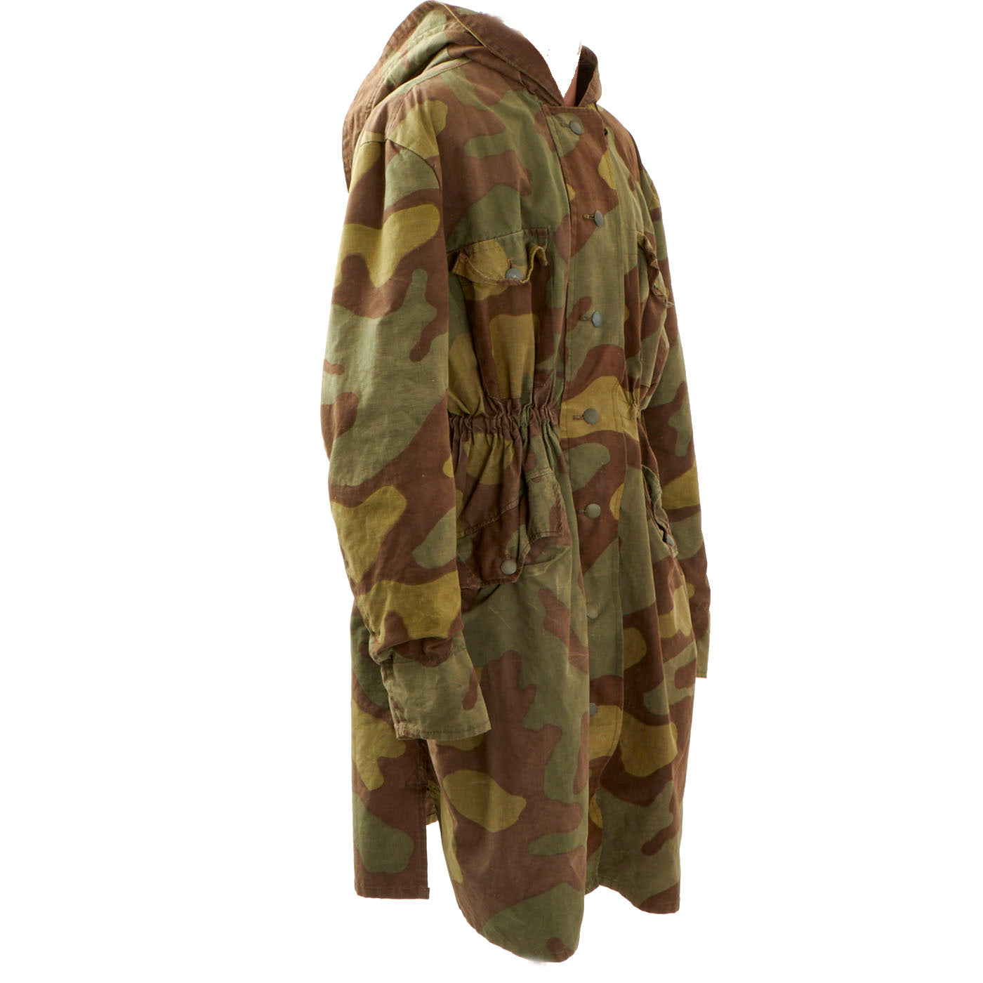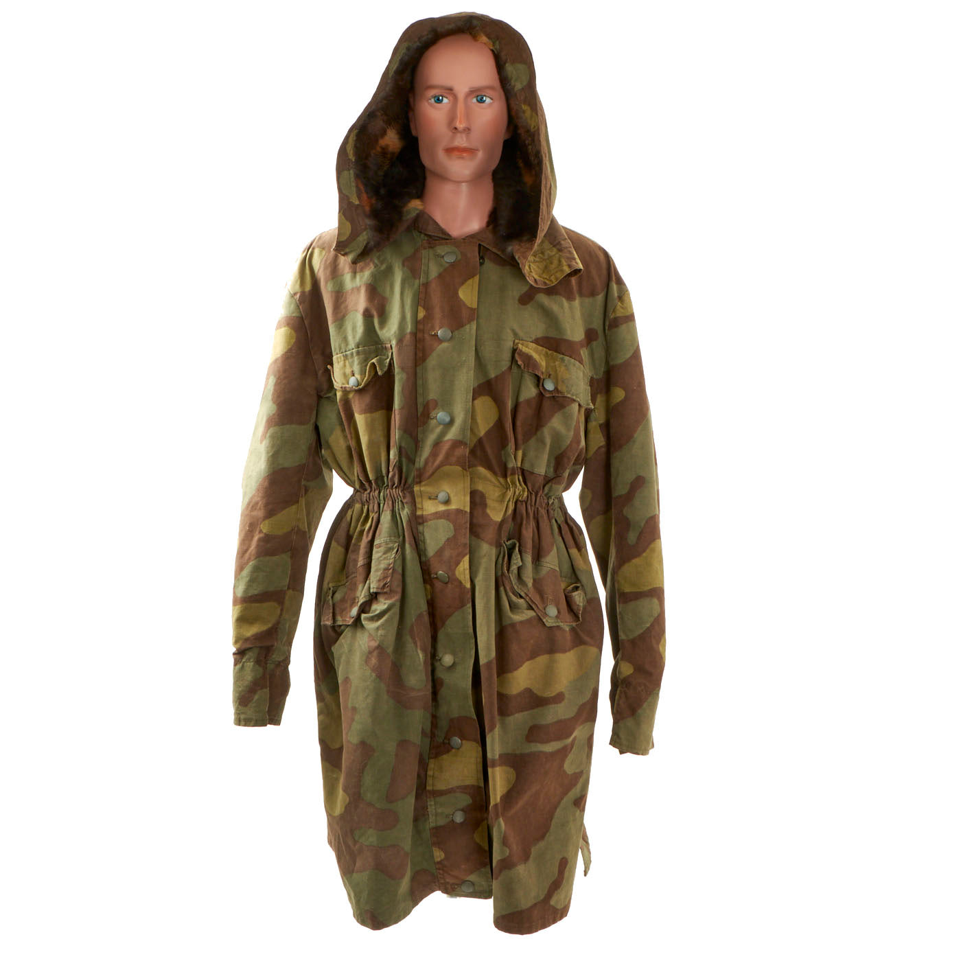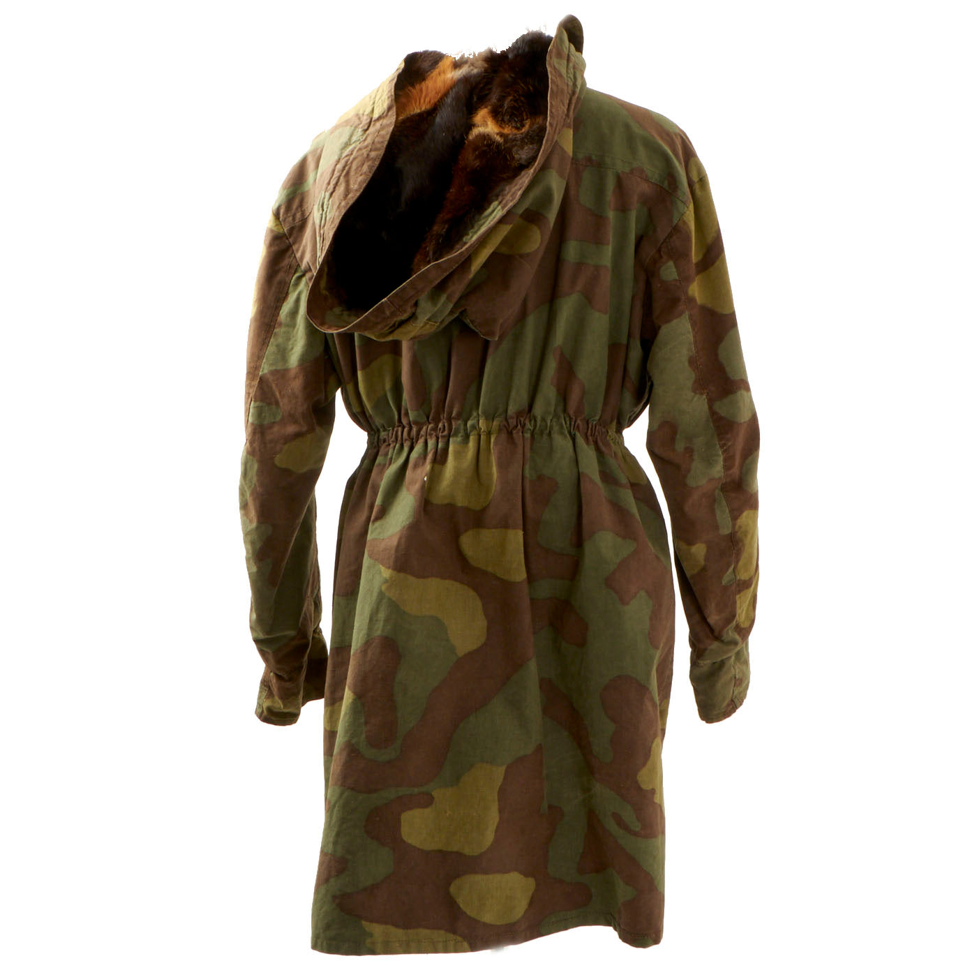 The M43 fur-lined winter parka was designed in mid 1943 and featured with a full length button up front closure, it was introduced in early 1944. This Italian camouflage M43 Khakrov parka was made from spare fabric that the Germans liberated from Italian Army camps. The Khakrov Parka was so named as it was used by SS units fighting in the Cold winter of the Russian front .