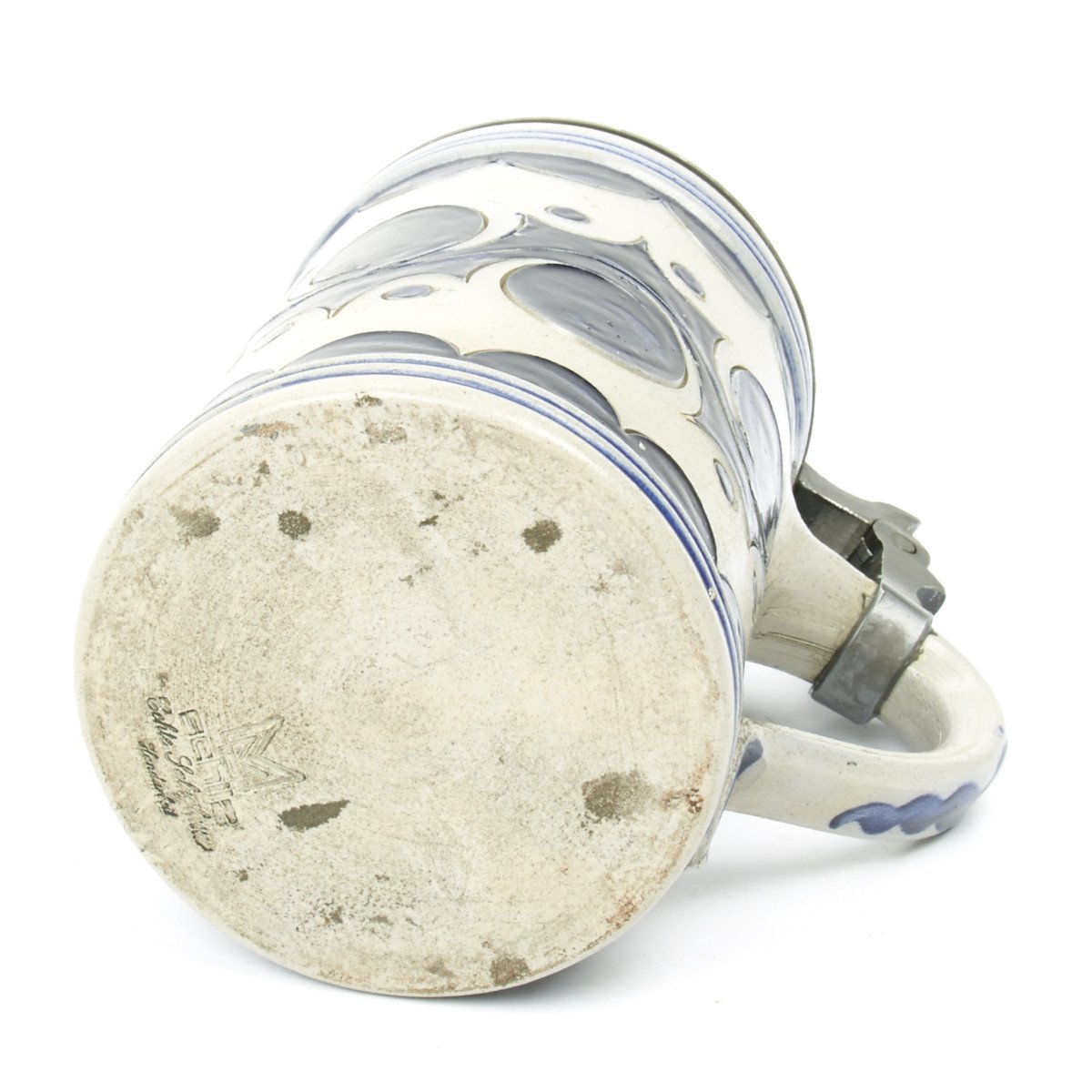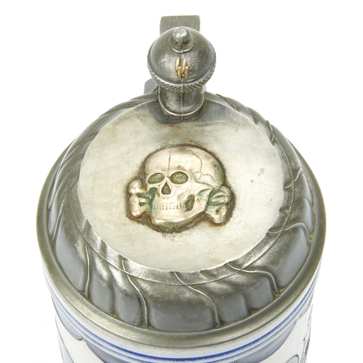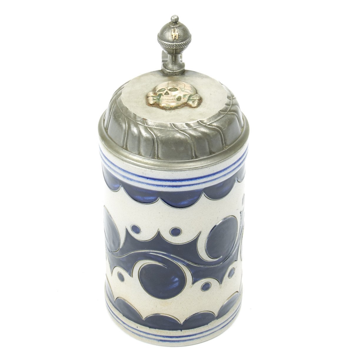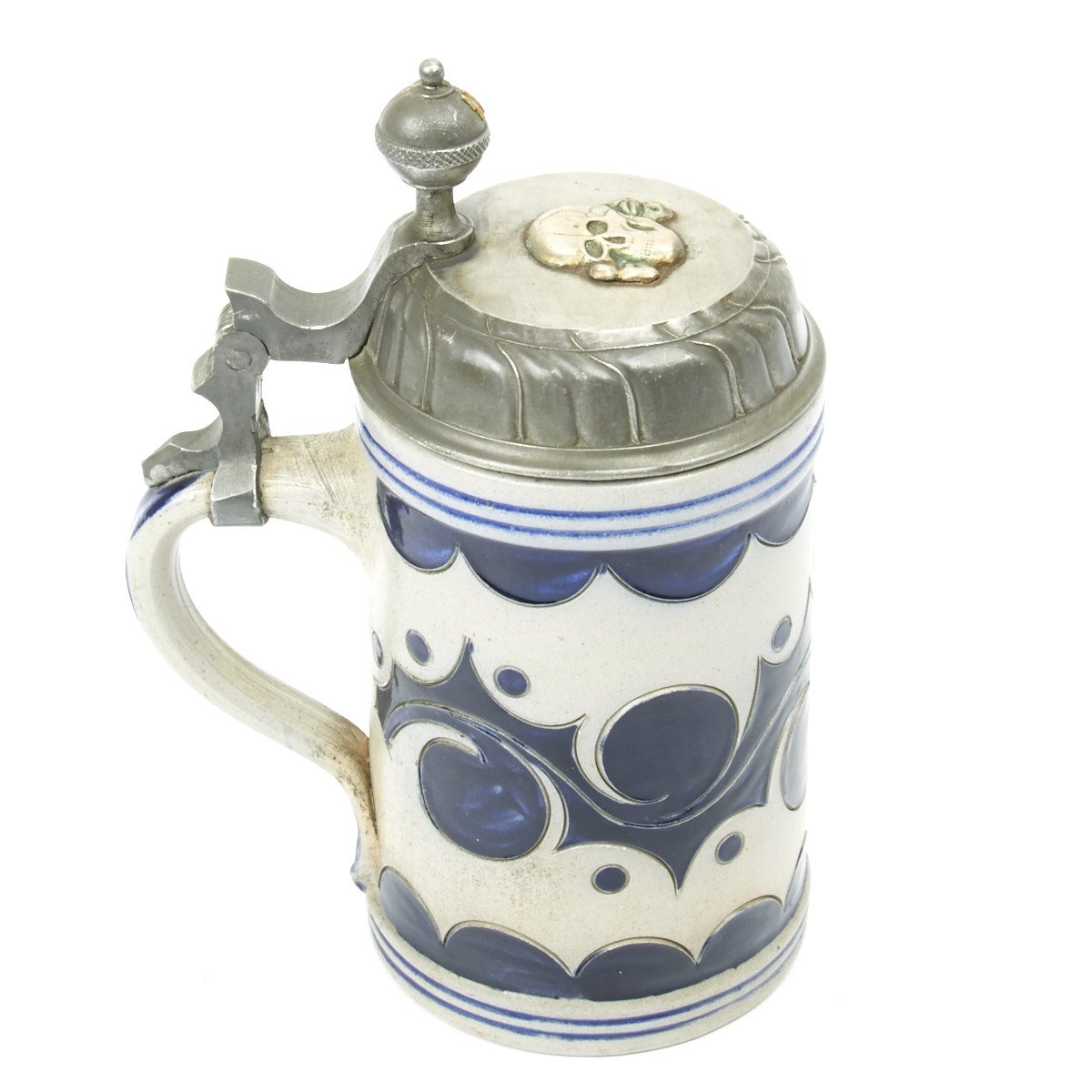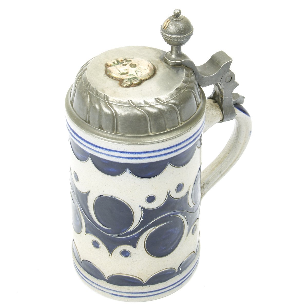 Original Item: Only One Available. A USGI bring back this is a really nice beer stein covered in blue glazed enamel decoration with a pewter lid surmounted with an SS death's head badge.
