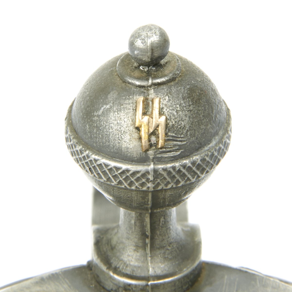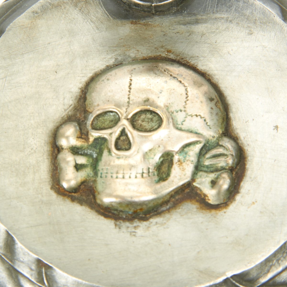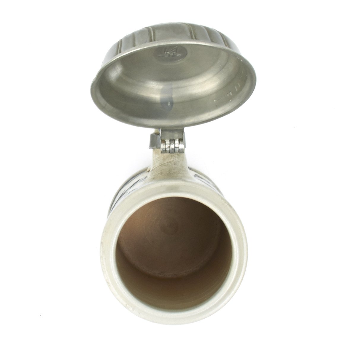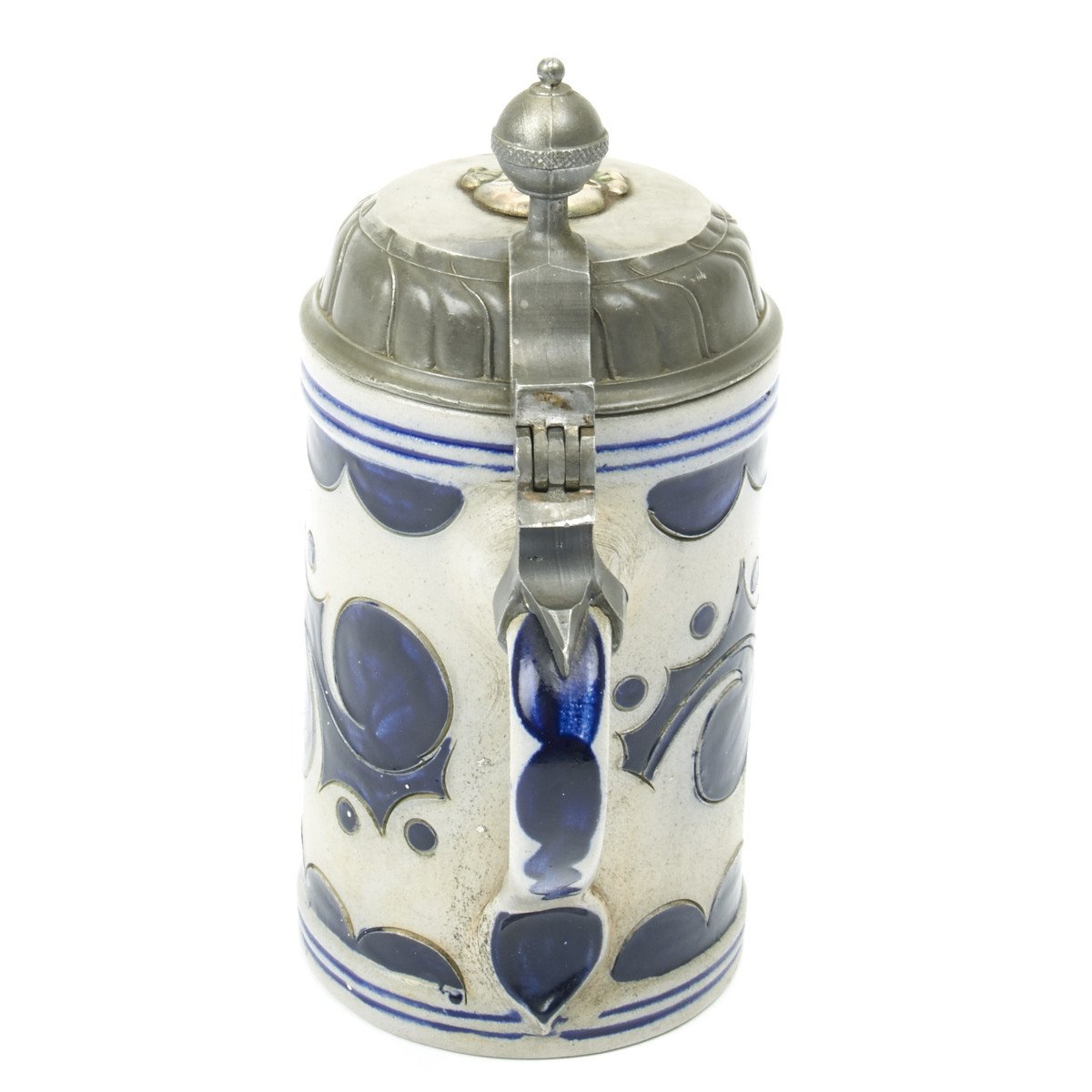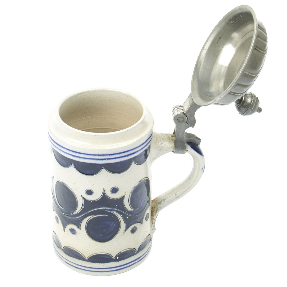 Original Item: Only One Available. A USGI bring back this is a really nice beer stein covered in blue glazed enamel decoration with a pewter lid surmounted with an SS death's head badge.
