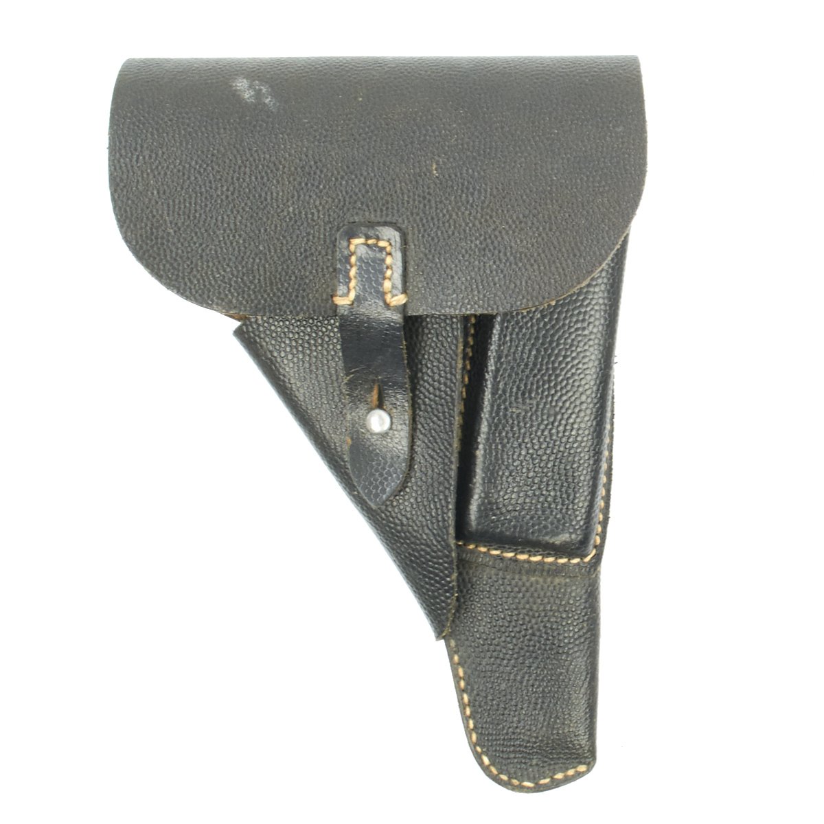The Walther Pistole 38 (P.38) pistol was first introduced in 1938 as a replacement for the P.08. The P.38 was a more cost-efficient and more reliable in war conditions such as mud and rain. The P.08 was a typical prewar German gun, over engineered to perfection, with a sensitive toggle breech system that would malfunction when dirt was involved. The P.38 was a workhorse that did just what it was meant to do. It could handle most harsh battlefield conditions and as such the closed hardshell holster was discontinued later in the war and replaced for a partially open softshell holster. During the War close around 900,000 were produced, so the holsters were also produced in large quantities.