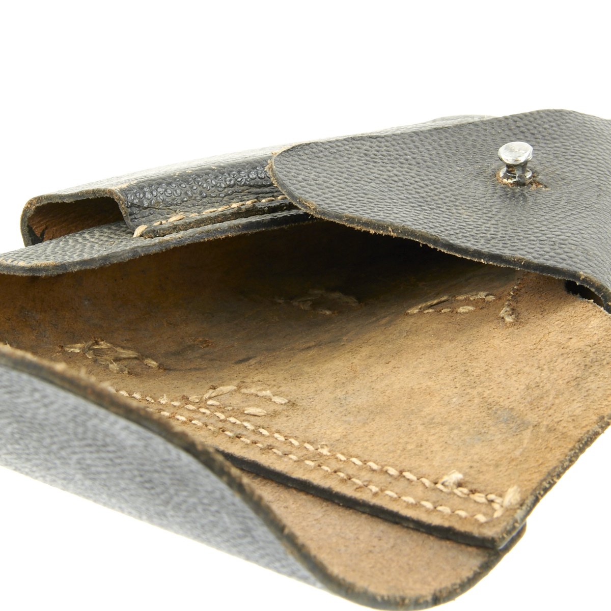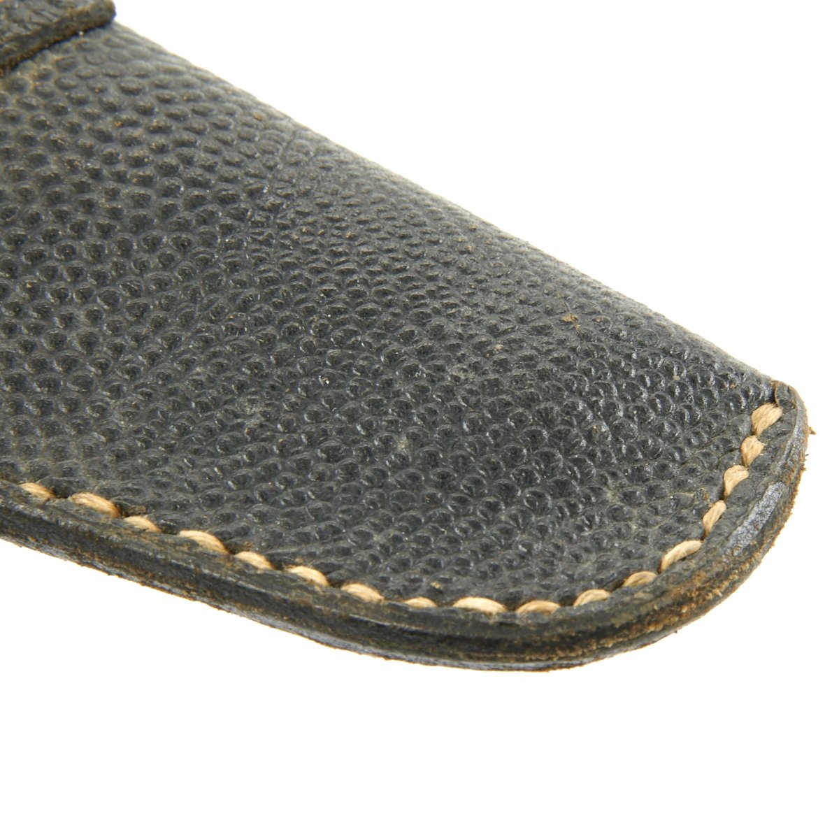 The holster is also marked cxe / 41, indicating manufacture by Britzer Eisenwerk Paul Szubinski, Britz Kreis Angermünde, in 1941. The holster is a bit stiff, having never been conditioned in the years since it saw light service. As this is pebble grain leather, the holster will probably require a bit more conditioning than a plain leather holster. However, we think it is just fine as is.