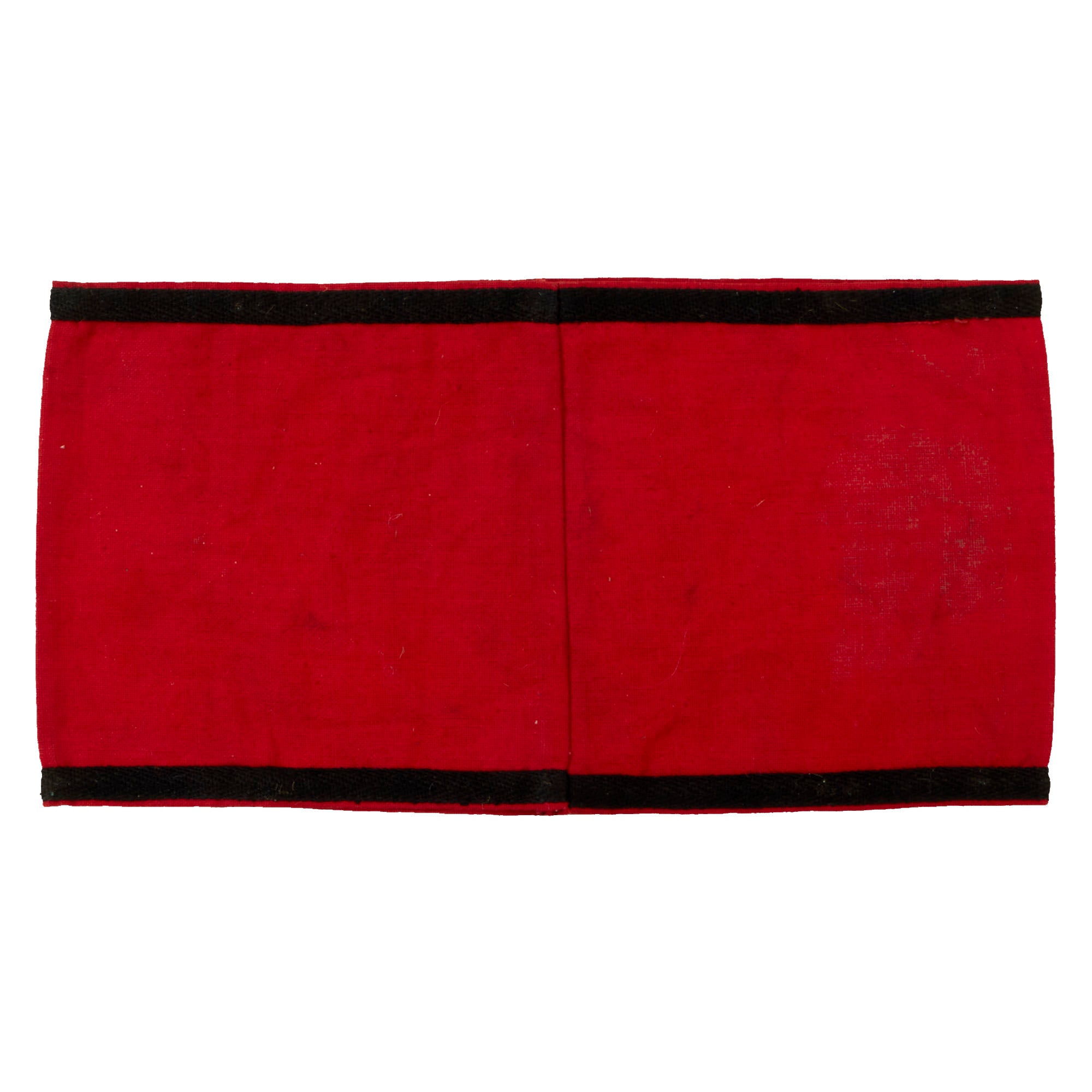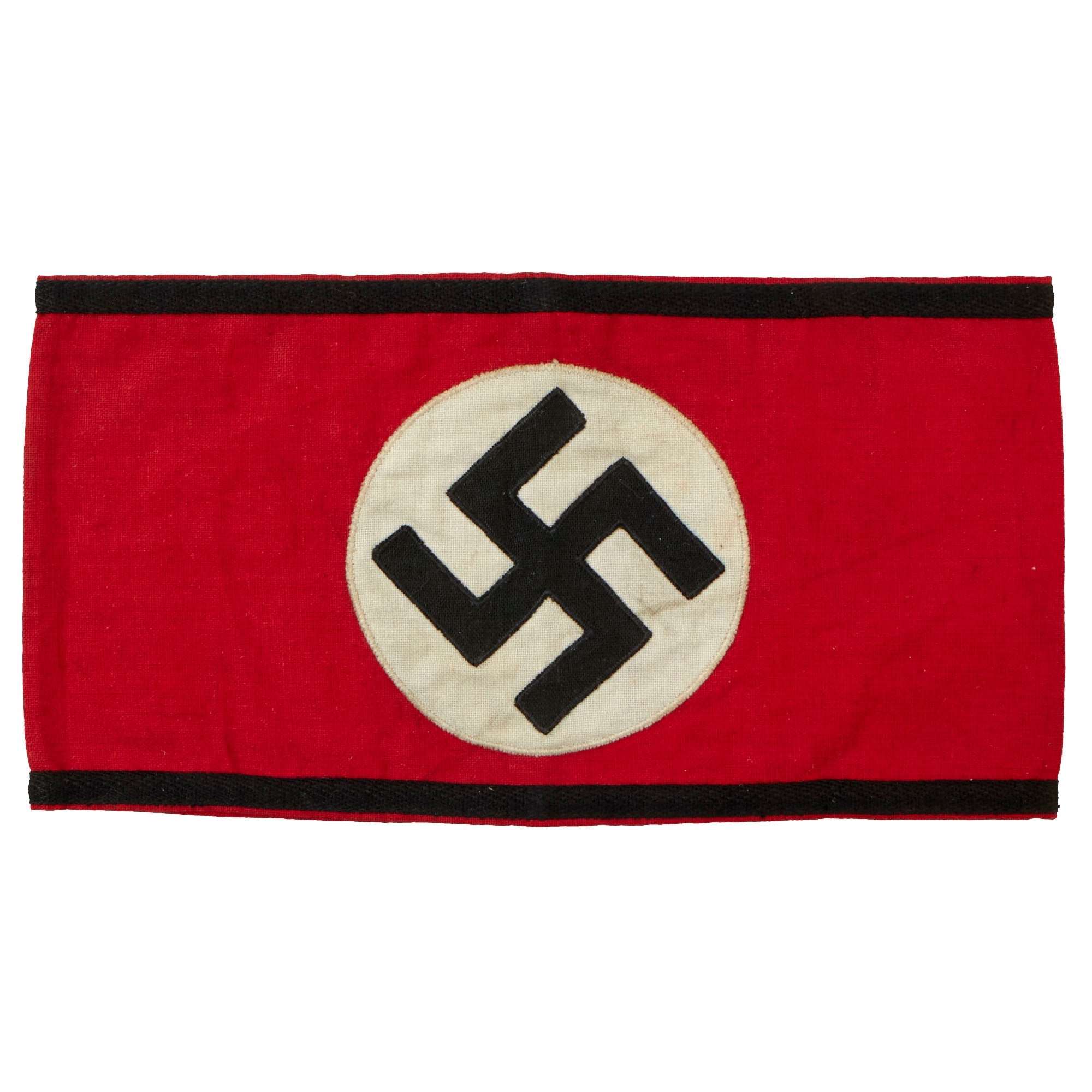 This is a very good lightly used condition Member's Kampfbinde (Armband), with a red cotton band, and a multipiece black swas (hook cross) sewn onto the front inside a white cotton circle. Earlier examples were made using felt and rayon, but this wartime production armband is not nearly so luxurious. This armband is more or less identical to the standard armband of the National Socialist German Workers' Party (Nationalsozialistische Deutsche Arbeiterpartei, abbreviated NSDAP), except for the black borders on the edges.