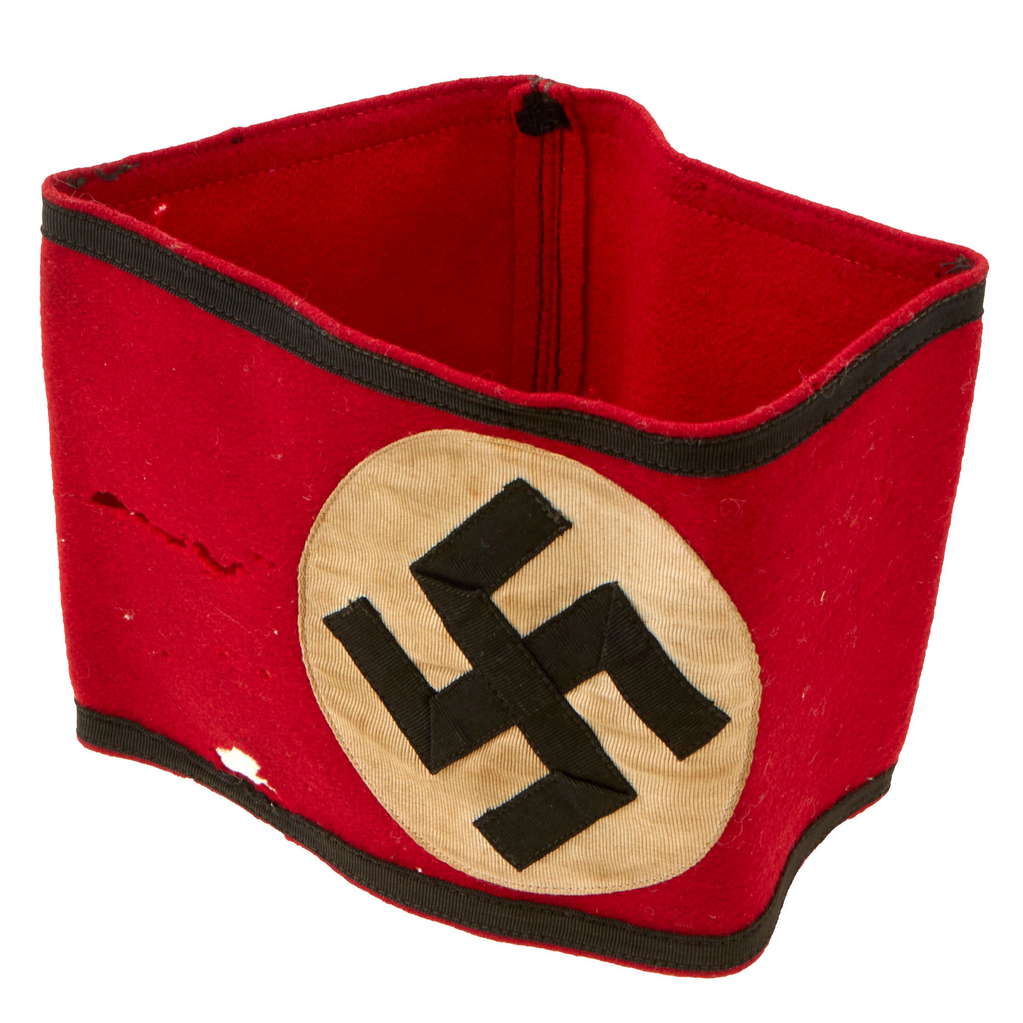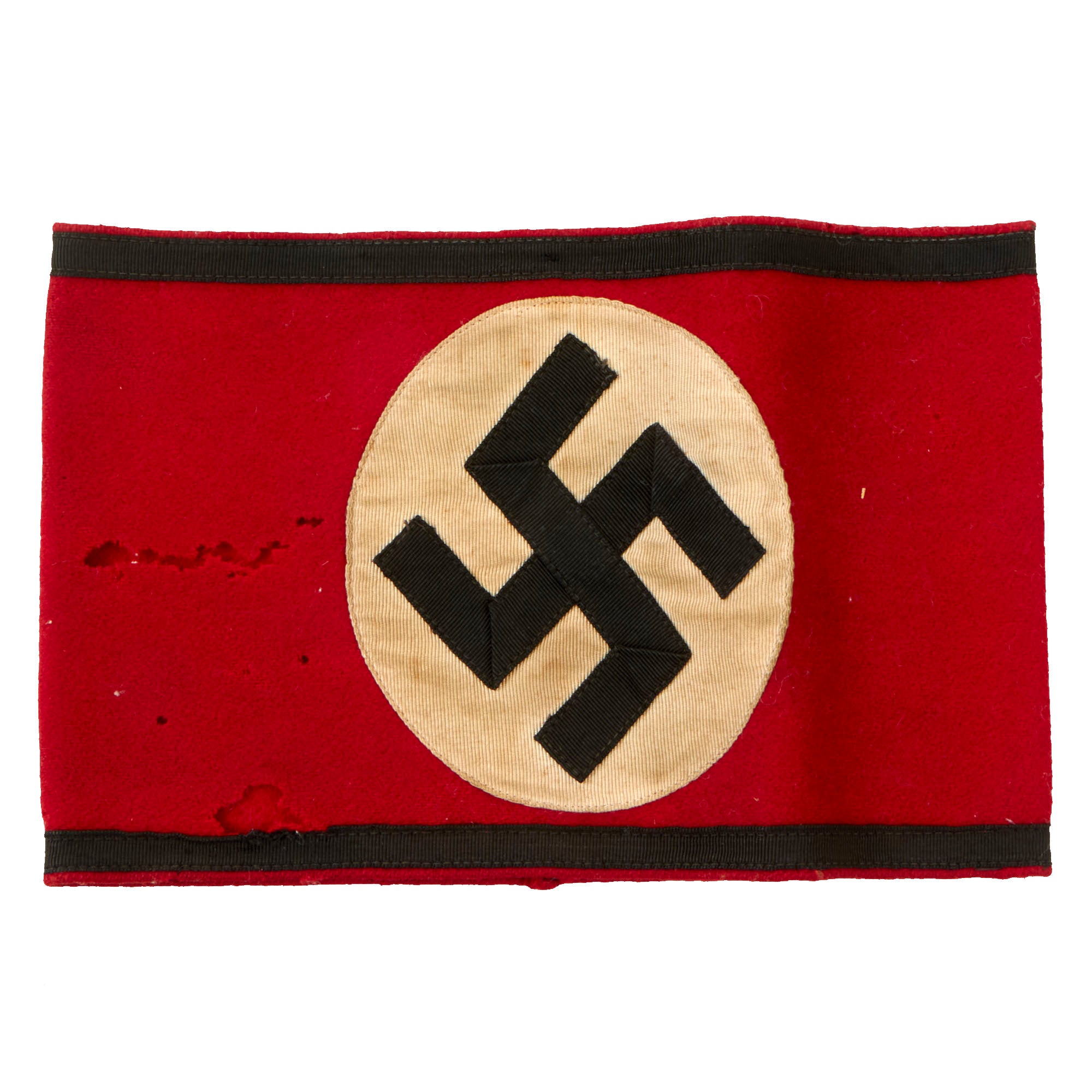 Nearly every military, civil, political and paramilitary organization in existence during the Third Reich used armbands. Armbands were worn on military and civilian uniforms and also on civilian clothes, from suit jackets to work clothing. They were used to denote membership in organizations, to indicate a specific role or function of the bearer, and as insignia of rank. Many organizations would change the design of their armbands over time, which added to the variety produced. These were manufactured in countless variations, ranging from simple printed bands to elaborately hand-embroidered pieces of the highest quality. Some NSDAP armbands were worn by all members of large organizations and were made by the millions. Others were intended for use at a specific time and place and were unique. Many types were made in very limited numbers. Some bore metal insignia or special identifiers that indicated the wearer’s rank, unit affiliation, or nationality. Armbands were sometimes but not always marked with ink stamps by the issuing authorities.