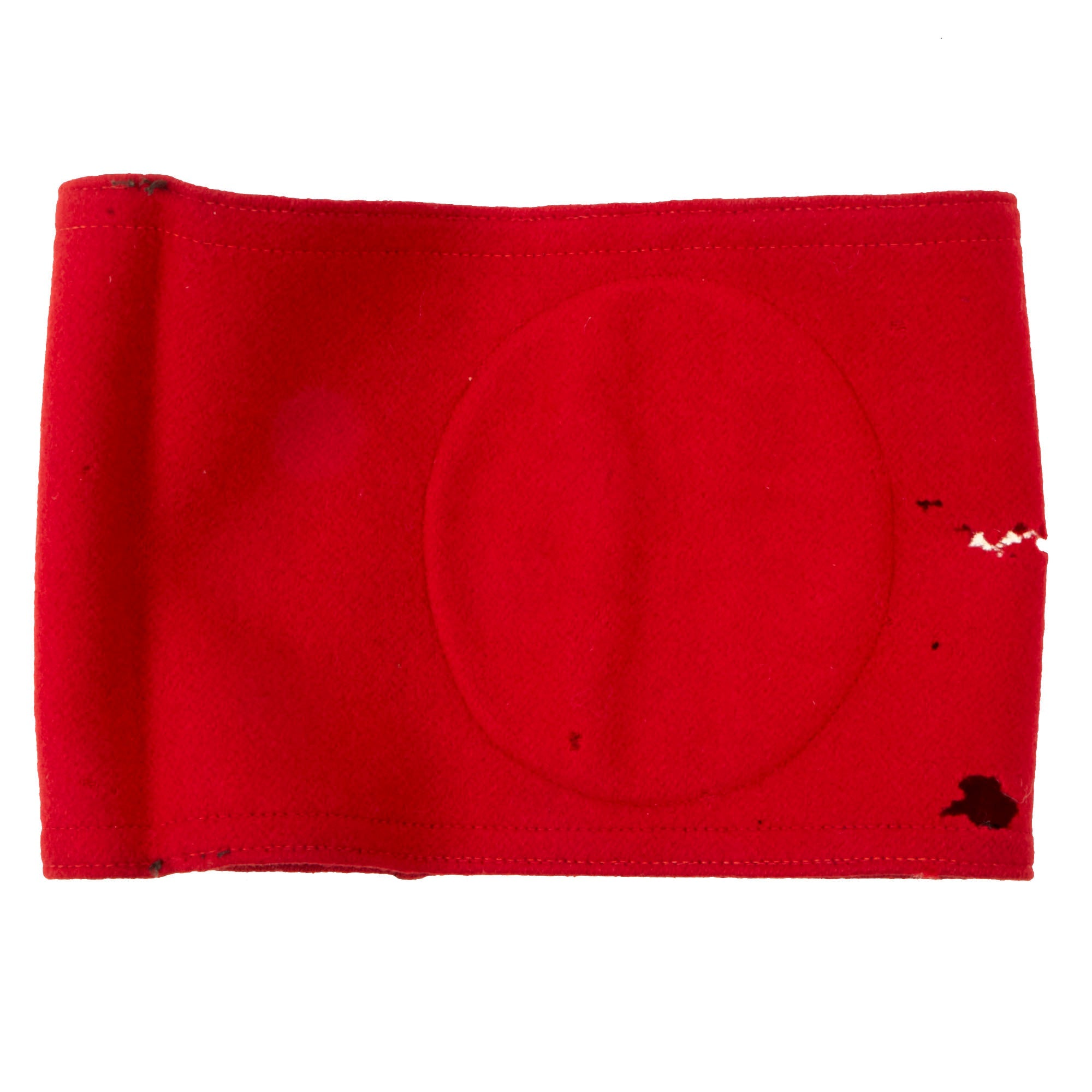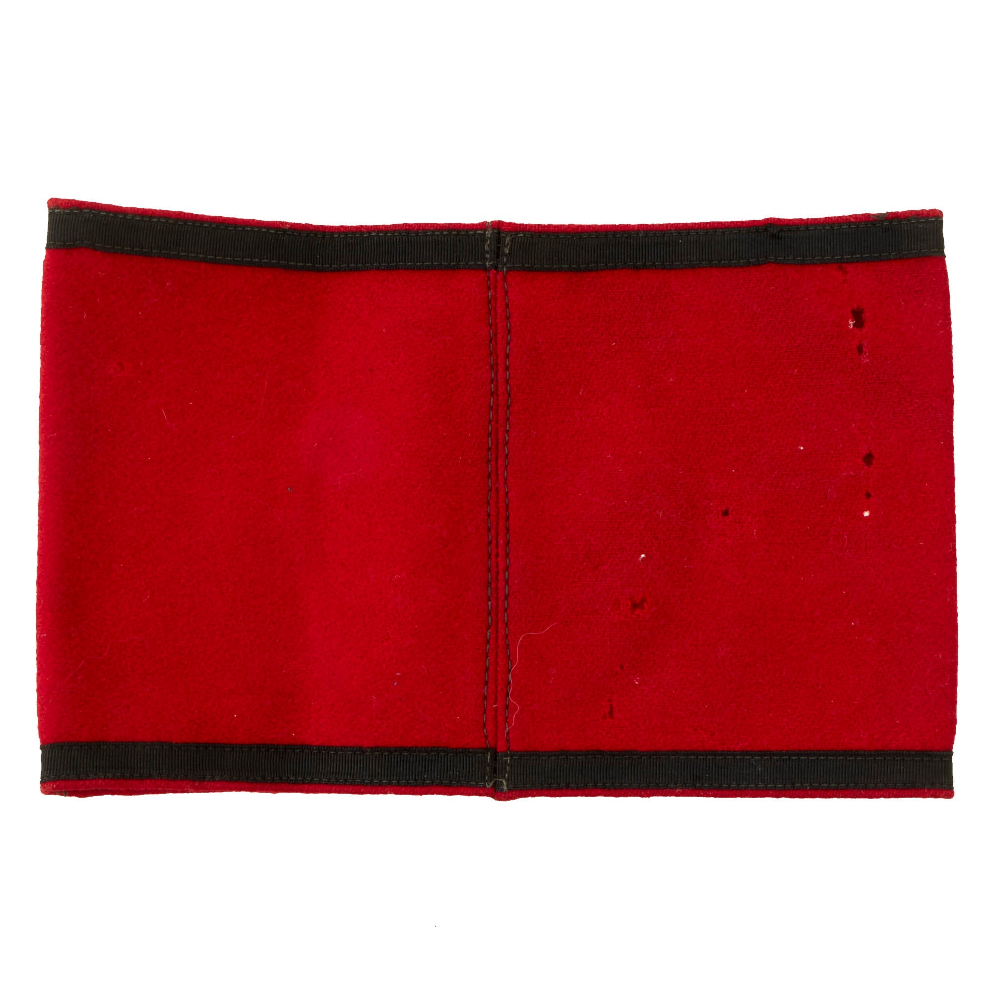 It is in very good service used condition, measuring approximately 15" x 4 ¾", and is machine stitched together in the back. The interior shows some glue residue where the original paper RZM tag would have been, so this is a later production example, made after 1939. There is some wear and staining to the armband overall, and there is also moth damage on the red wool body that goes through the fabric. The white circle does show some age toning and staining, and there is a bit of fraying on the black rayon border.