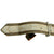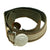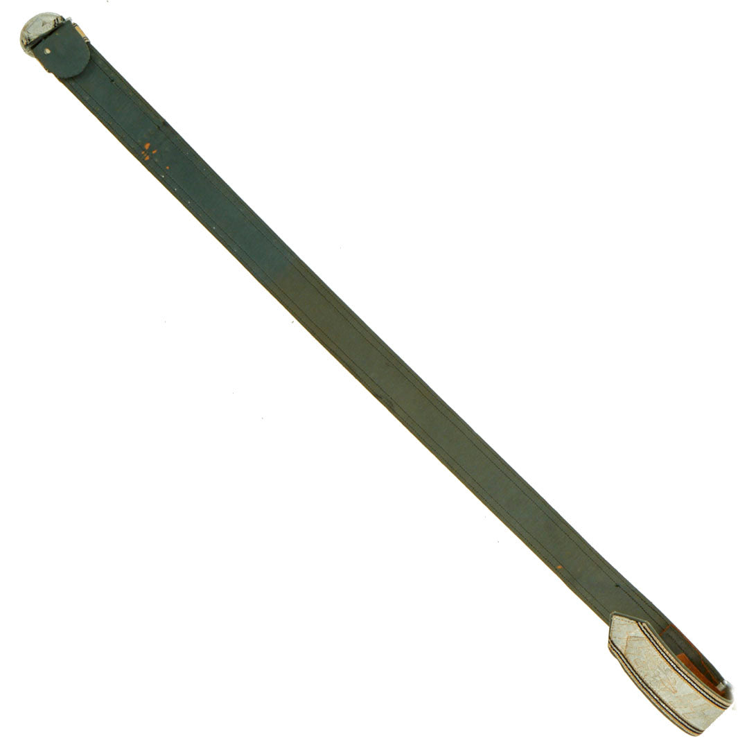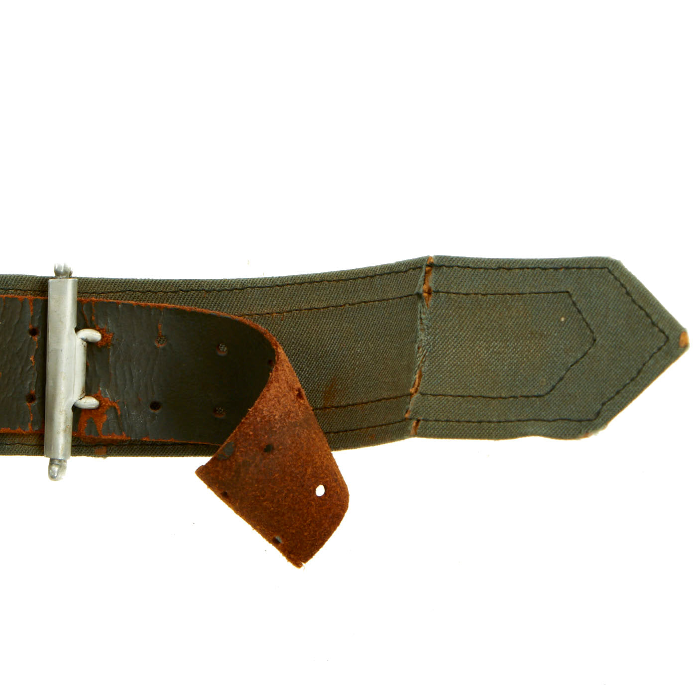 The reverse is lined in a green/gray fabric, and a small hook on the end of the belt by the buckle fits into grommets on the reverse for size adjustment. The belt measures about 44 inches long in the current configuration, and looks like it could probably be extended more. The folded over buckle tab holds the buckle on by only a few stitches, unfortunately most of the others have degraded and popped. These belts usually would have had an RZM label or other type of paper label on the back, which were removed when put into service.