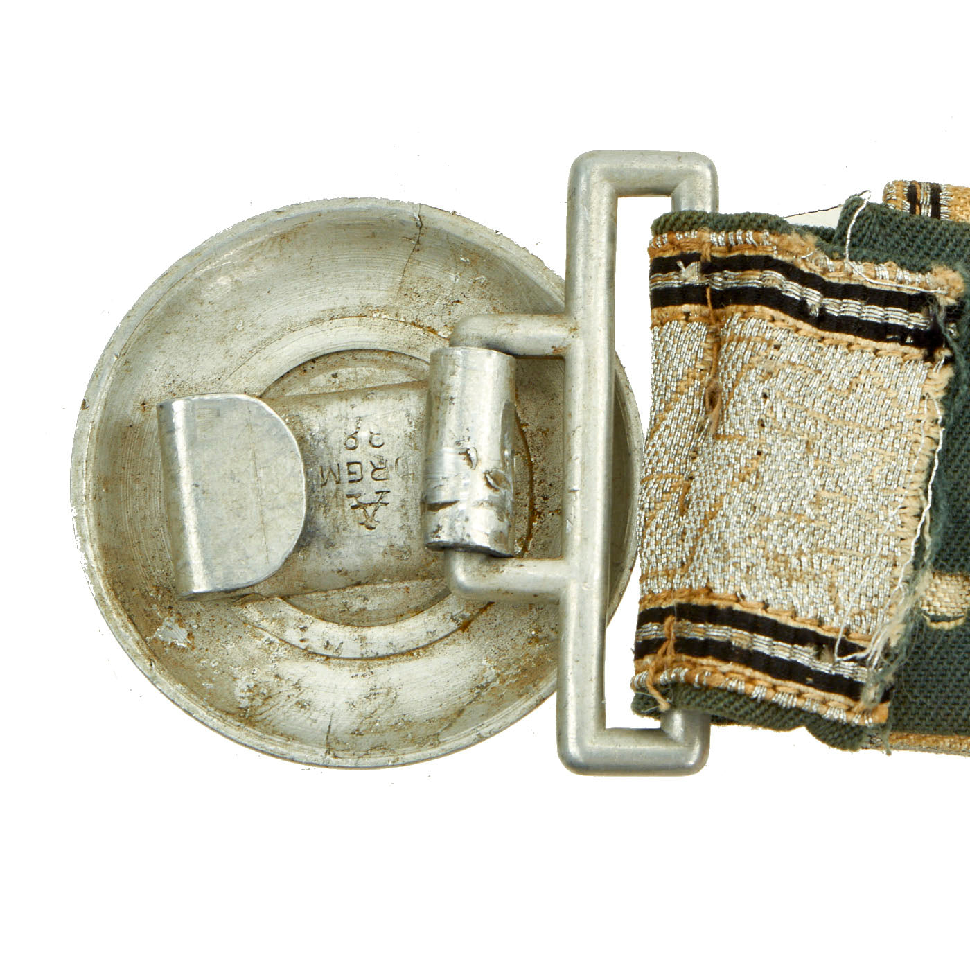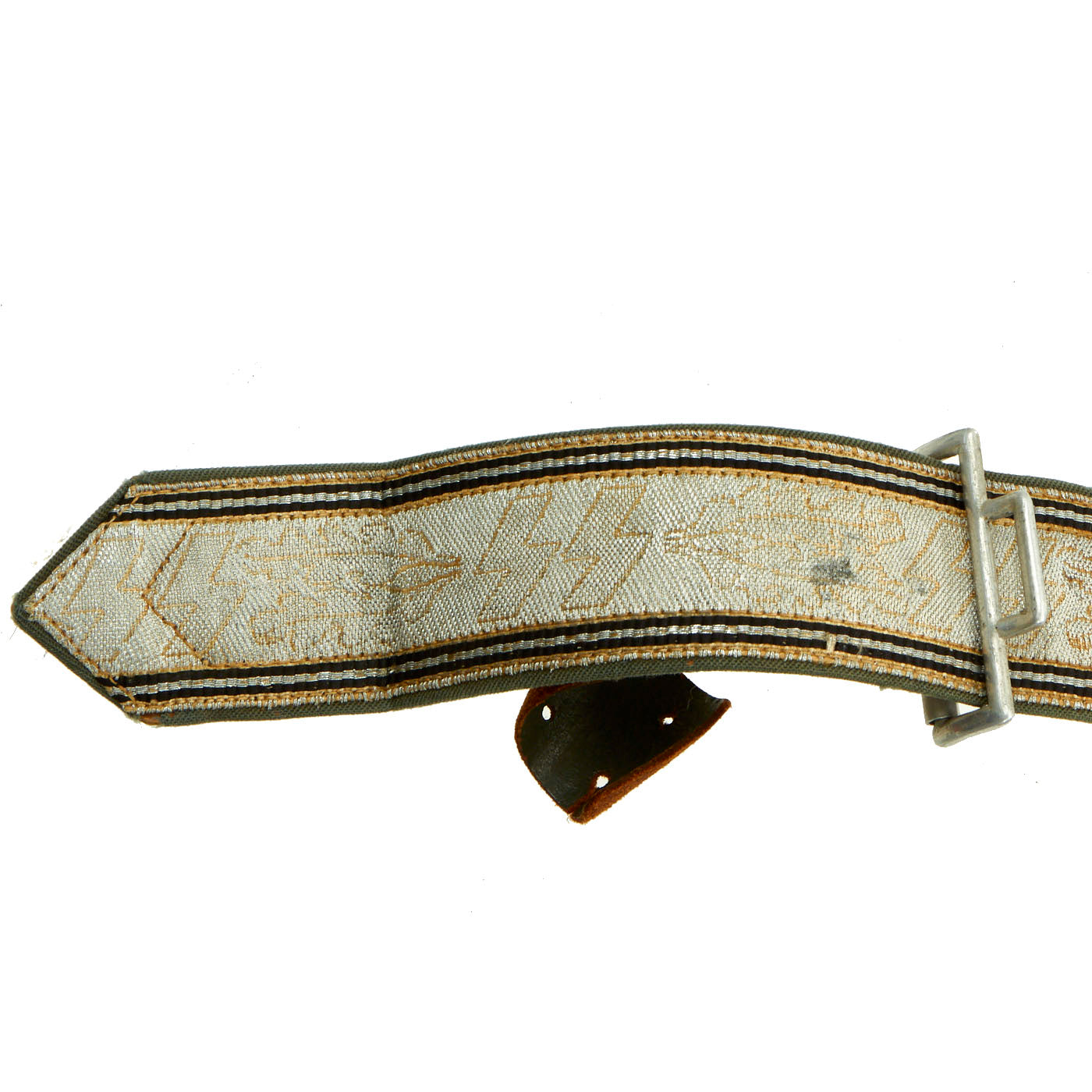 The buckle is attached by a double square ring to a long quality woven bright silver/aluminum construction brocade belt. The belt has a central embroidered area for the entire length of the belt, displaying the ᛋᛋ doppelte Siegrune (Double Sig/Victory Rune) symbol of the SS. Between these are oak leaves, a very popular motif used throughout German history.