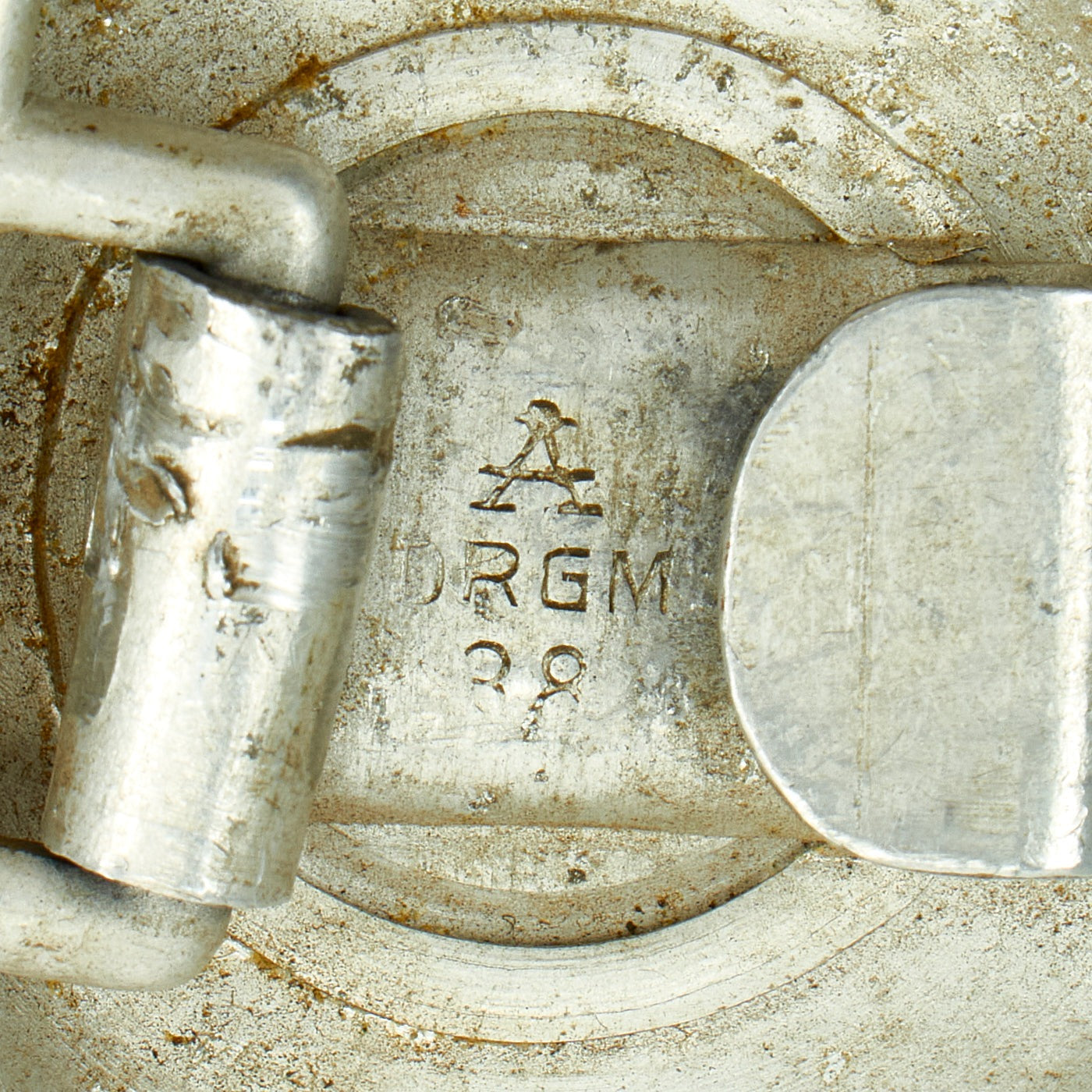 The rear of the clip is marked with the "barred A" trademark, of F. W. Assmann & Söhne of Lüdenscheid, a large maker of belts, buttons, and other accouterments. It is also marked DGRM, indicating that the design was registered at the German patent office. Below this is a number 38, for 1938 production.