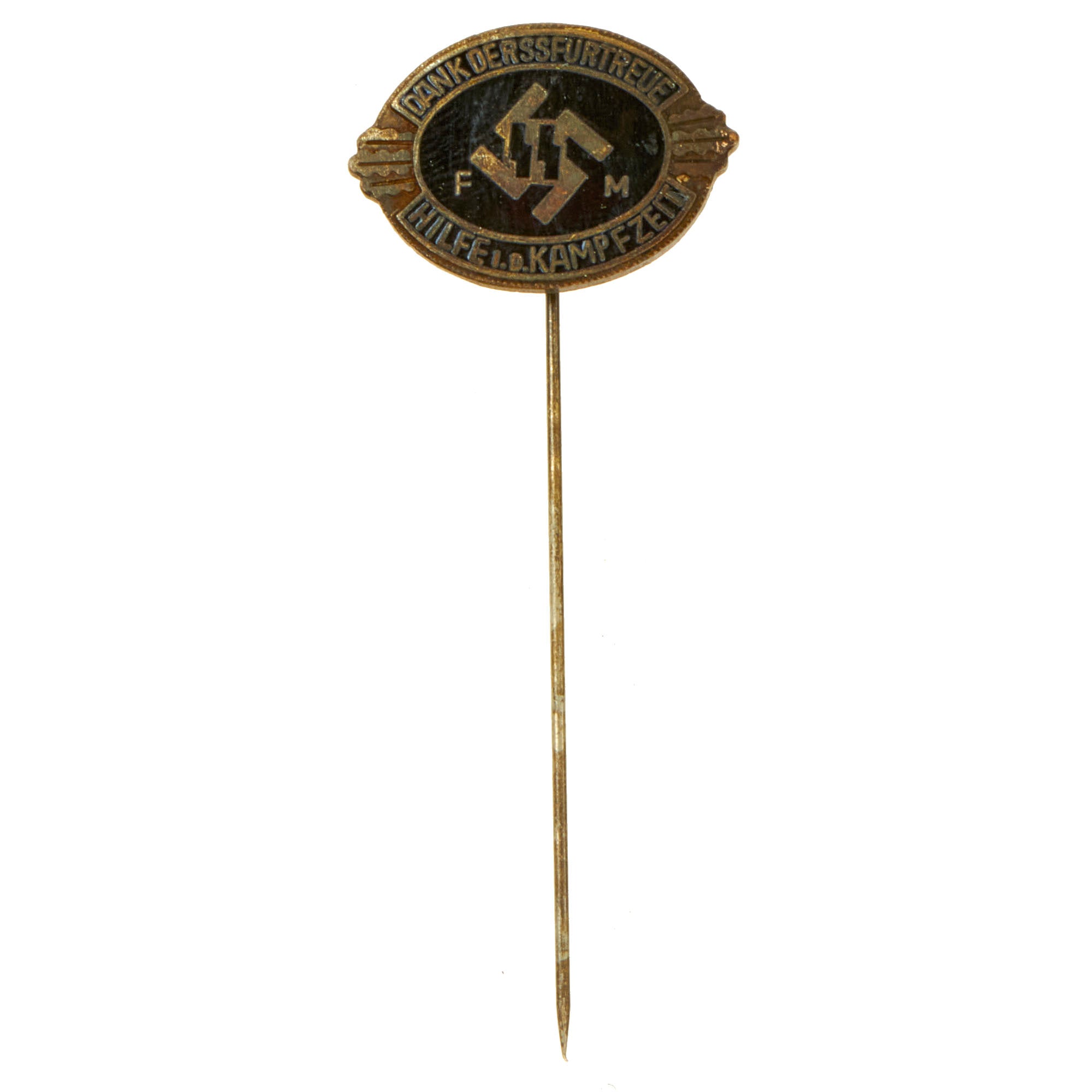 Original Item: Only One Available. The SS-FM, Fördernde Mitglieder, (SS Sponsoring/Patron Members), organization was originally formed in 1926 by personnel who wished to join the Allgemeine-SS, (General-SS), but were found unsuitable for direct membership. Membership in the SS-FM was open to all male and female German Aryan personnel who agreed to make a voluntary monthly contribution to the SS treasury in order to strengthen the financial position of the SS and to expand its influence in civilian life. The SS-FM organization was administered by the SS-WVHA, SS Wirtschafts-und Verwaltungshauptamt, (SS Economic and Administrative Department), who supplied members with a monthly dues book and an identifying lapel pin. SS-FM members would register at their local SS headquarters where they would make their monthly payments and receive the appropriate receipt stamp to be placed in their dues book. Membership in the SS-FM not only guaranteed SS protection from radical elements but the mere association with the SS greatly enhanced a members influence in all aspects of civilian life. It is assumed that the SS-FM Honor lapel pins were distributed tp personnel who made more significant contributions to the SS in an effort to distinguish them from regular SS-FM members.