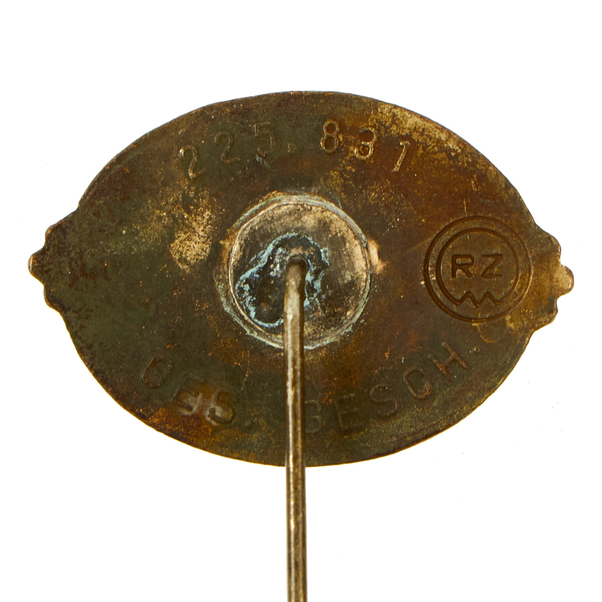 This is a very nice example of an SS Supporting Members Honor Lapel pin, fully marked on the back with the ((RZM)) logo along with 225, 831 and GES. GESCH., indicating that it is a protected design. The pin is a die struck alloy construction horizontal oval pin, which has black enamel work on the front. The pin features a horizontally oval, black enamel base with a silver, embossed, beaded outer border stripe with three overlapping horizontally extended silver oak-leaves to each side. The center of the pin has a "mobile" swas (hook cross) with the ᛋᛋ doppelte Siegrune (Double Sig/Victory Rune) in the center, flanked by the initials F and M, for Fördernde Mitglieder, (SS Sponsoring/Patron Members). There is text at the top and bottom of the pin, which reads DANK DER SS FÜR TREUE HILFE I.D. KAMPFZEIT (Thanks from the SS for Loyal Assistance in the Time of Struggle).