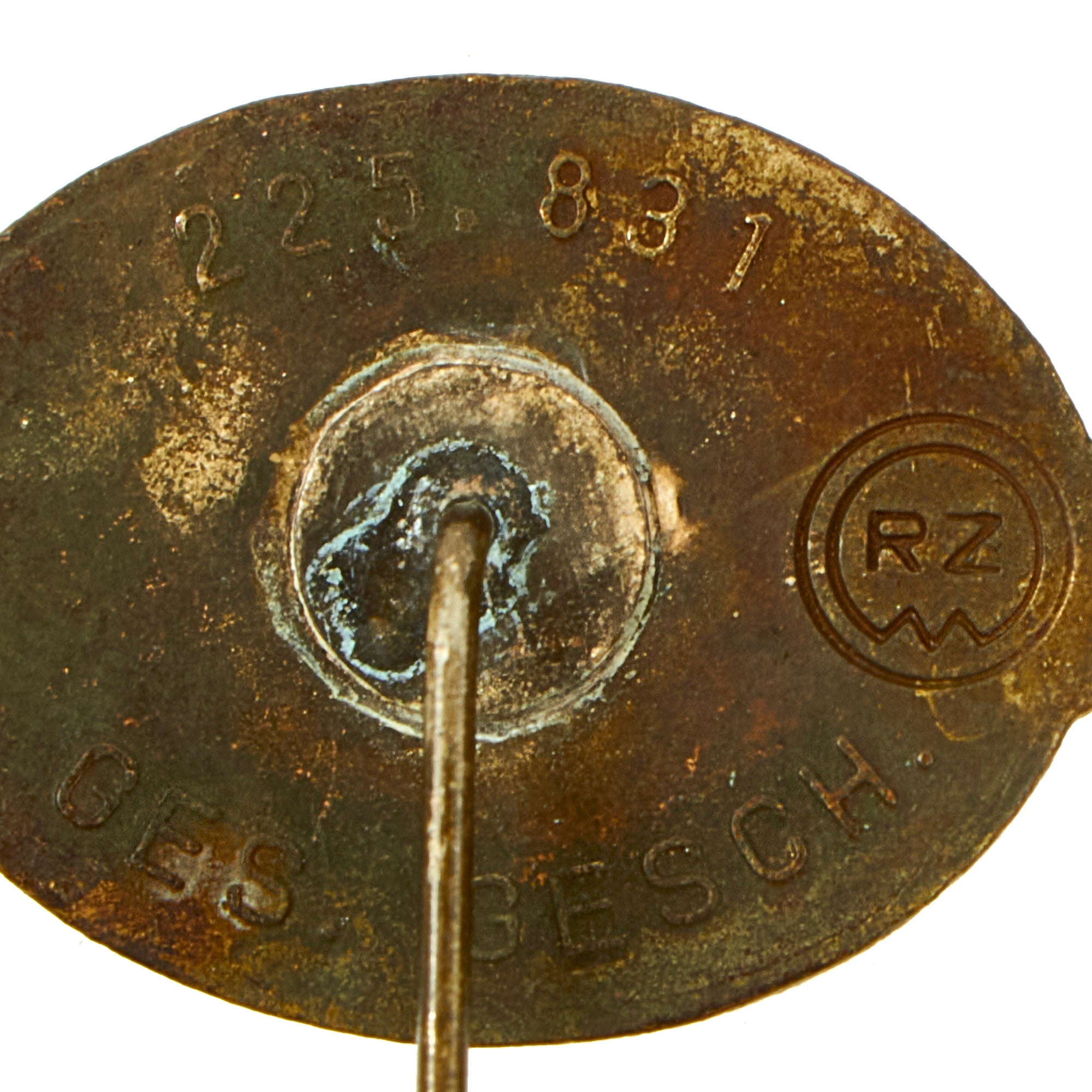This is a very nice example of an SS Supporting Members Honor Lapel pin, fully marked on the back with the ((RZM)) logo along with 225, 831 and GES. GESCH., indicating that it is a protected design. The pin is a die struck alloy construction horizontal oval pin, which has black enamel work on the front. The pin features a horizontally oval, black enamel base with a silver, embossed, beaded outer border stripe with three overlapping horizontally extended silver oak-leaves to each side. The center of the pin has a "mobile" swas (hook cross) with the ᛋᛋ doppelte Siegrune (Double Sig/Victory Rune) in the center, flanked by the initials F and M, for Fördernde Mitglieder, (SS Sponsoring/Patron Members). There is text at the top and bottom of the pin, which reads DANK DER SS FÜR TREUE HILFE I.D. KAMPFZEIT (Thanks from the SS for Loyal Assistance in the Time of Struggle).