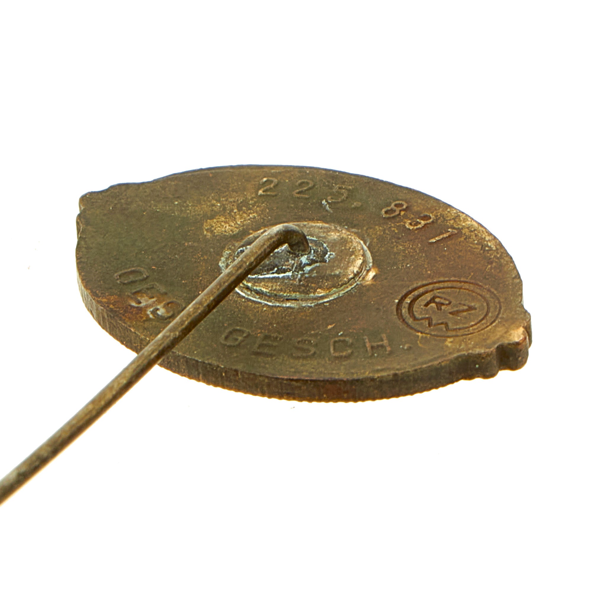 This is a very nice example of an SS Supporting Members Honor Lapel pin, fully marked on the back with the ((RZM)) logo along with 225, 831 and GES. GESCH., indicating that it is a protected design. The pin is a die struck alloy construction horizontal oval pin, which has black enamel work on the front. The pin features a horizontally oval, black enamel base with a silver, embossed, beaded outer border stripe with three overlapping horizontally extended silver oak-leaves to each side. The center of the pin has a "mobile" swas (hook cross) with the ᛋᛋ doppelte Siegrune (Double Sig/Victory Rune) in the center, flanked by the initials F and M, for Fördernde Mitglieder, (SS Sponsoring/Patron Members). There is text at the top and bottom of the pin, which reads DANK DER SS FÜR TREUE HILFE I.D. KAMPFZEIT (Thanks from the SS for Loyal Assistance in the Time of Struggle).