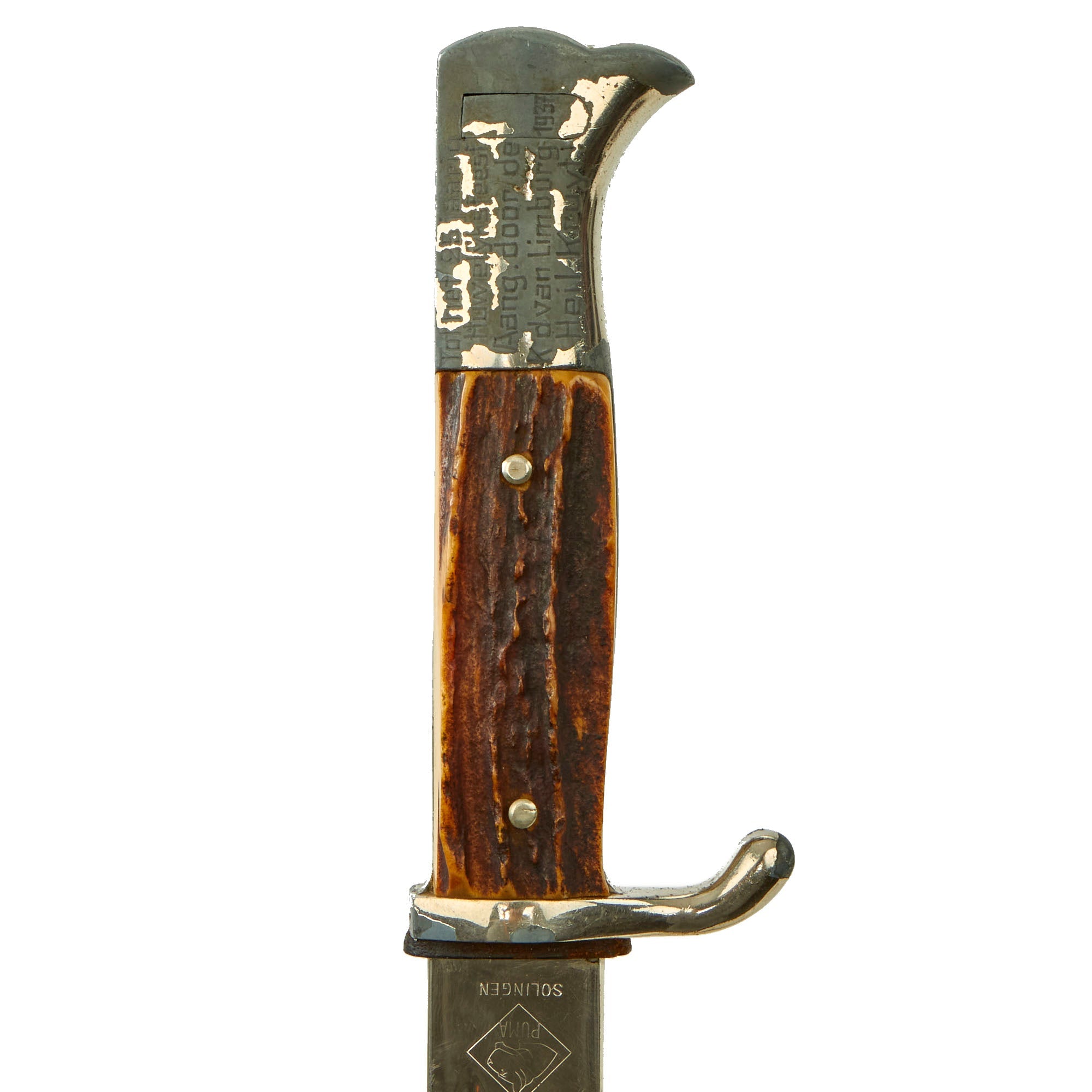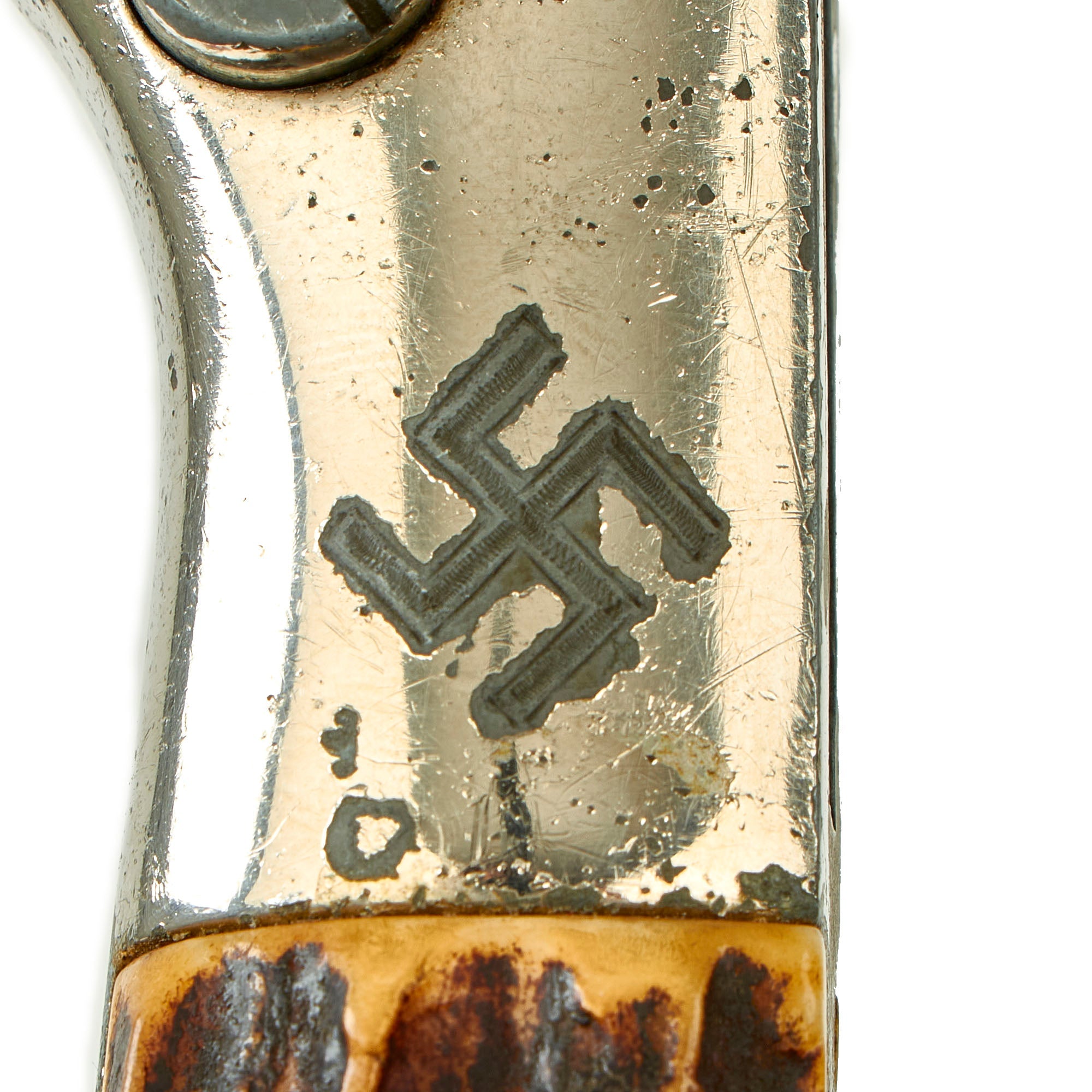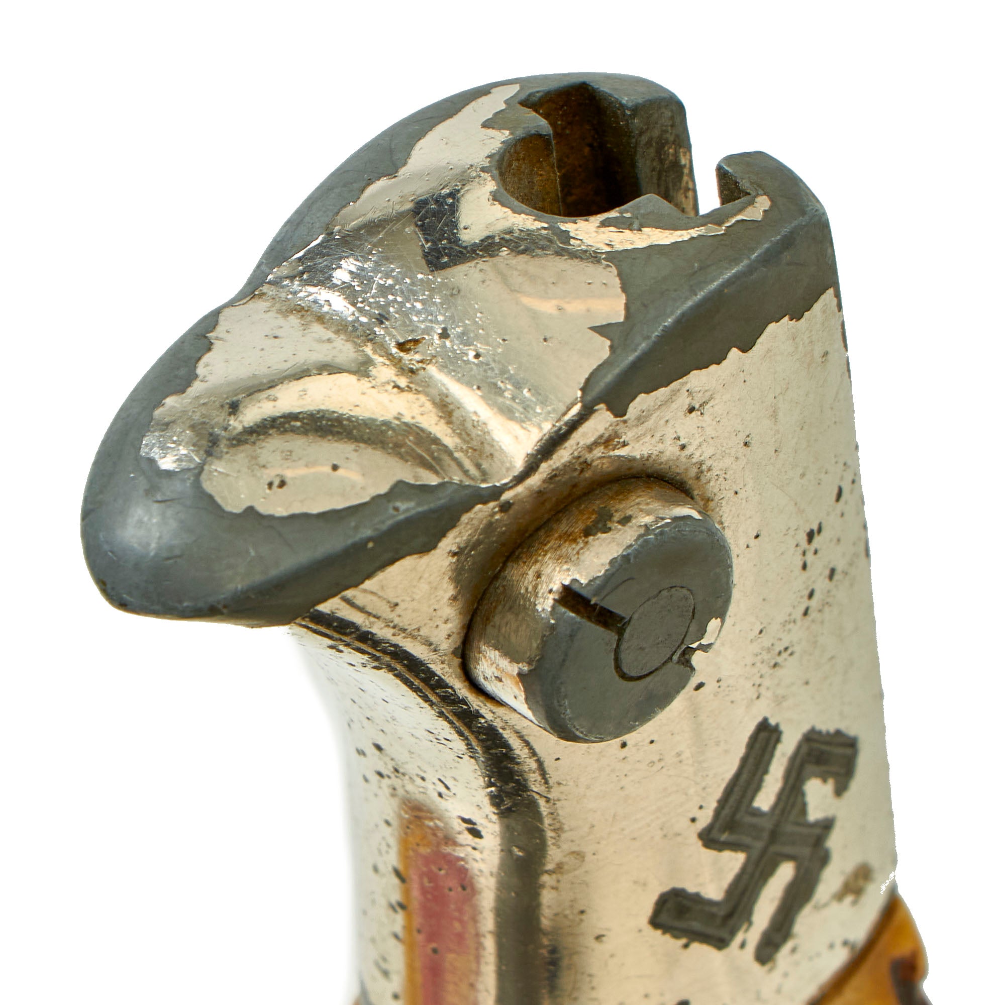 Original Item: Only One Available. The K-98 dress bayonet was a dress version of the combat style, and was worn by enlisted and NCO personnel for dress and parade occasions. The bayonets were finished with a high-quality nickel plating, with stag or bakelite grip plates and black painted scabbard. The choice of blade length was left to the purchaser, either the nickel-plated short (20cm) or long (25cm) version. There was usually a red or green colored felt insert in the rifle slot and the bayonet was suspended from a black or brown leather frog. Some had a functional bayonet latch, while it was ornamental on some.