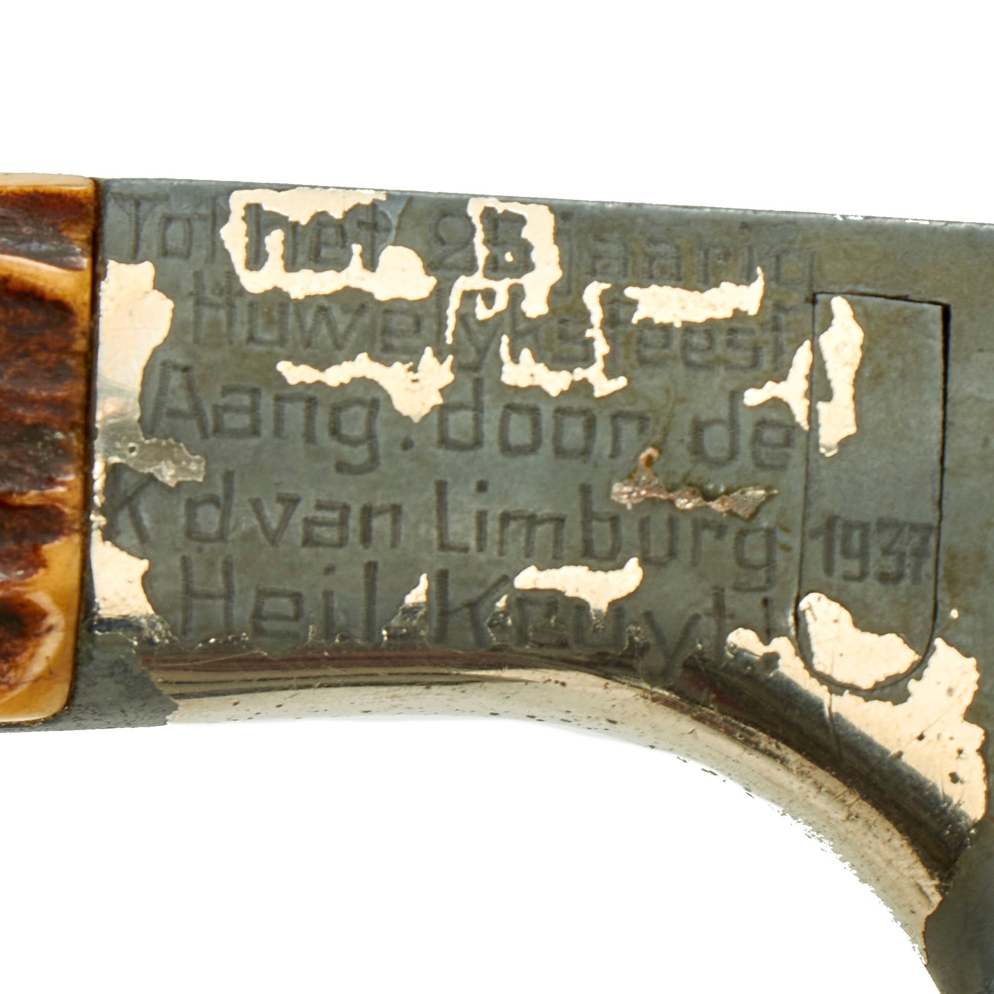 The other side of the hilt has a hand engraved Swas (hook cross) on it. The inscription seems to indicate that it was presented to commemorate a 25th Wedding anniversary or something similar in 1937. The "Heil Kruyt!" on the bottom is a reference to Major Cornelis Jacobus Aart Kruyt, one of the leaders of the Dutch NSNAP National Socialist party in the late 1930s.