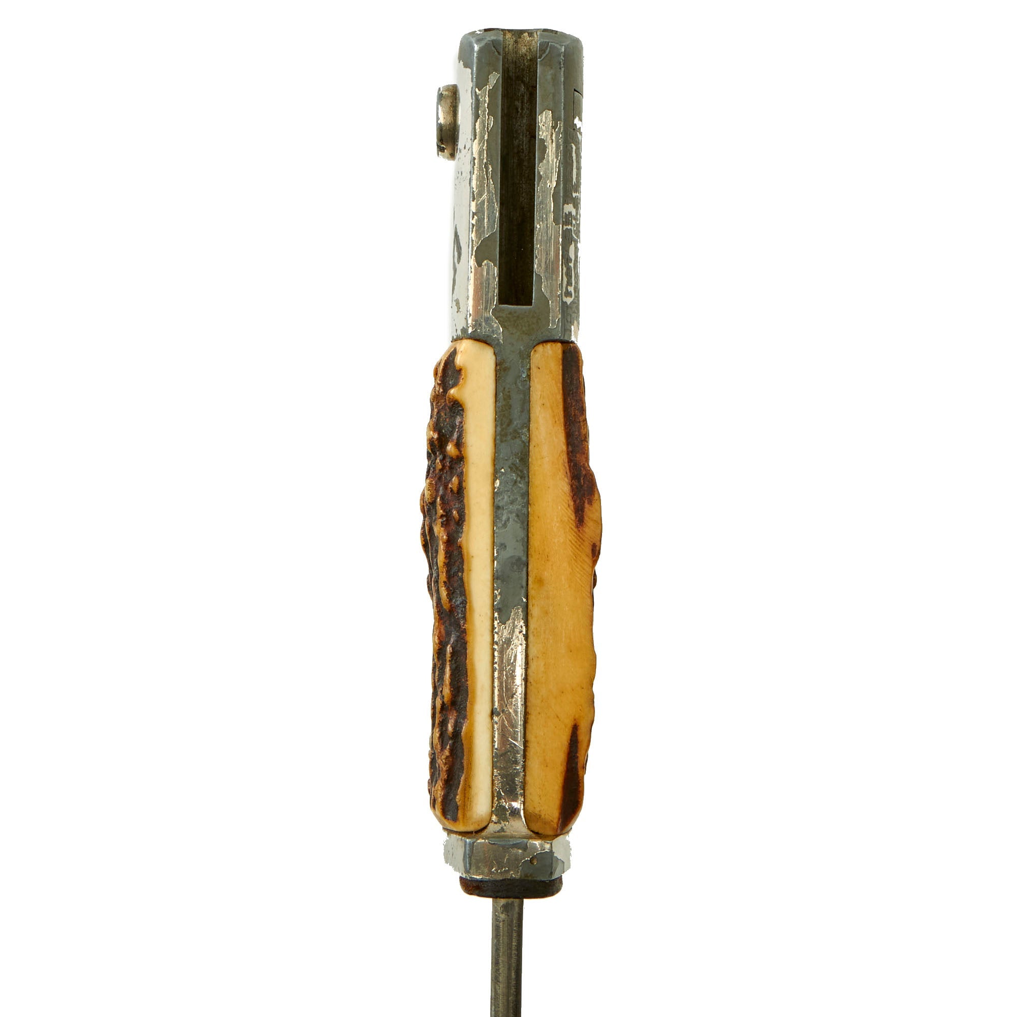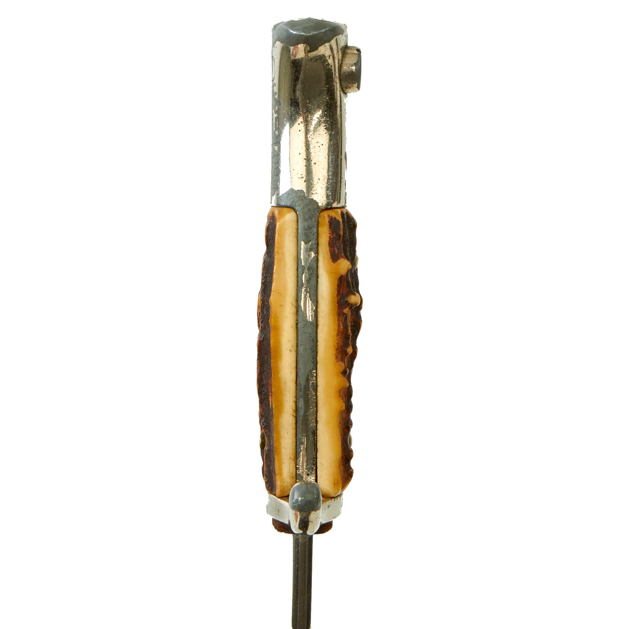 The engraving on the hilt was done by hand post manufacture, and unfortunately has led much of the nickel plating on that side to flake away. The mortise button and blade release are fully functional, though the felt insert is missing. The grip plates are both lovely stag horn, and are in great condition with a lovely aged look. They are retained by solid nickel alloy rivets which have dressed heads on the obverse.