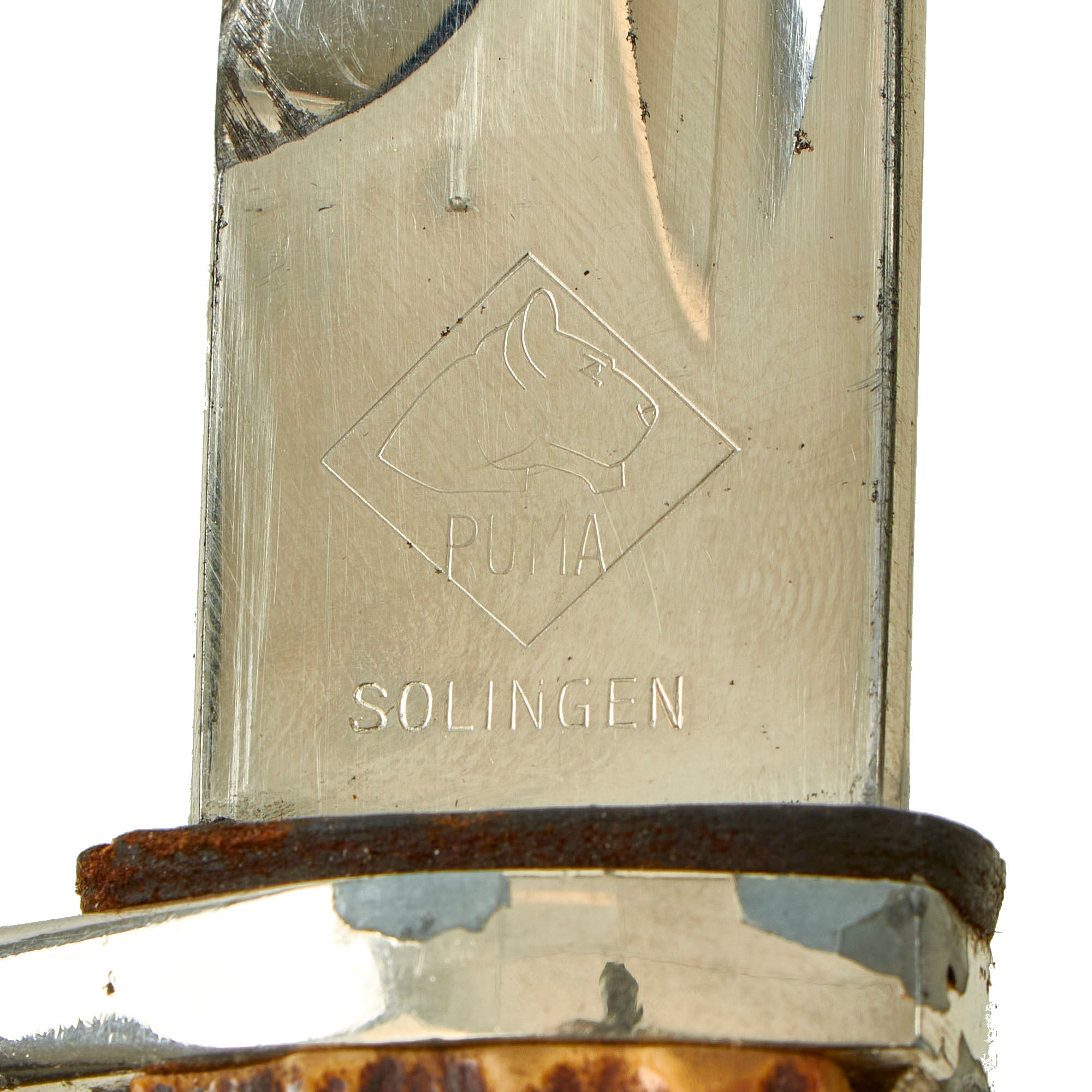 The reverse ricasso bears a stamped puma's head in a diamond above PUMA over SOLINGEN, the trademark logo of Lauterjung & Sohn, Puma-Stahlwarenfabrik / Puma - Werk of Solingen, Germany, the legendary "City of Blades". This company was originally founded on a small scale in 1796, Nathanael Lauterjung officially opened a cutlery and knife making workshop in Solingen during 1855. After his death, the name was changed and registered as "Puma-Werk", to avoid confusion with the other Lauterjung-owned workshops in Solingen. For more information, please see J. Anthony Carter's work GERMAN KNIFE AND SWORD MAKERS.