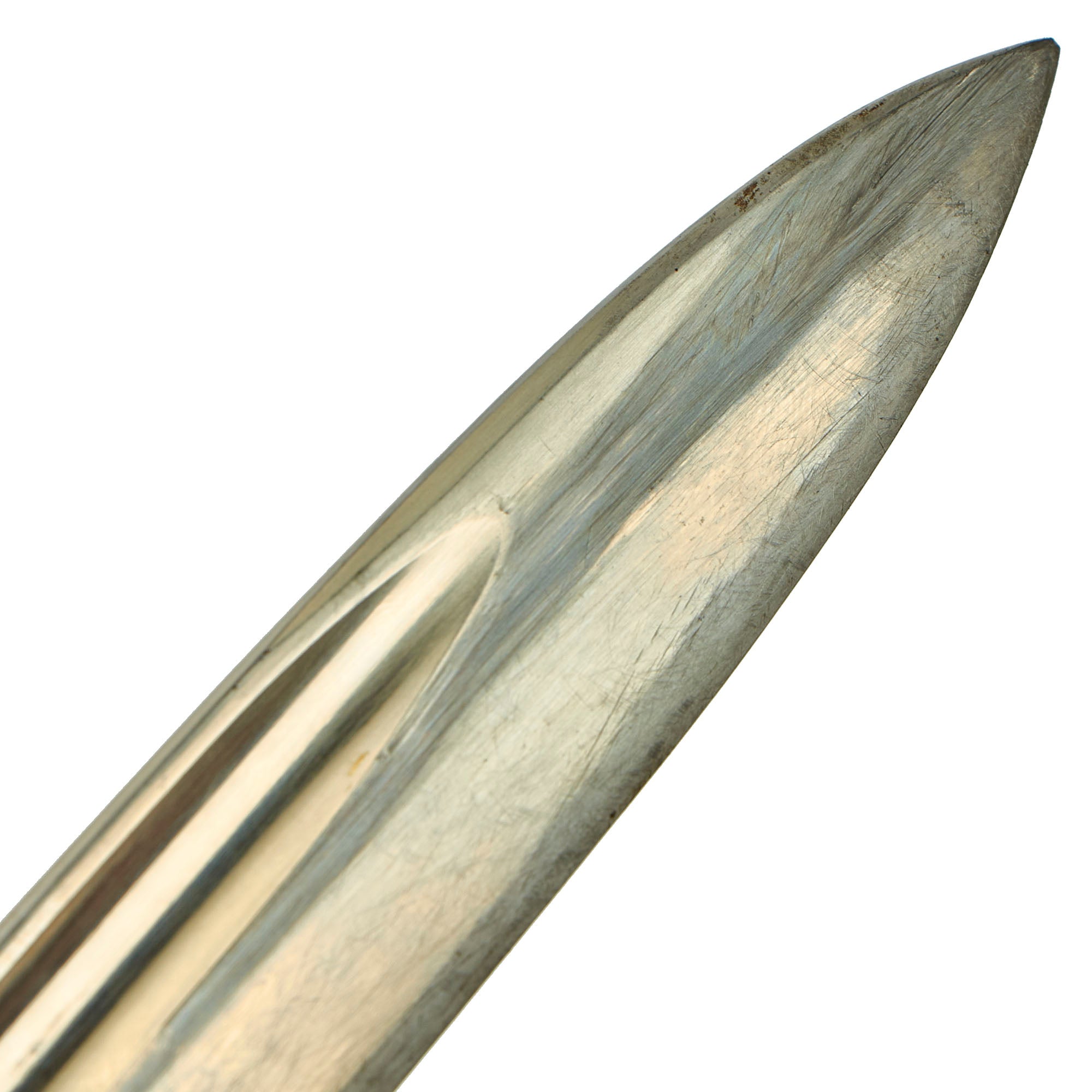 The blade on this example is nickel-plated, as were all dress bayonets, however it has had the main edge sharpened for use. We do not know if this was done during the WWII period or afterwards. The plating on the rest of the blade is still very well retained, and there is only minor oxidation where the plating has been abraded.