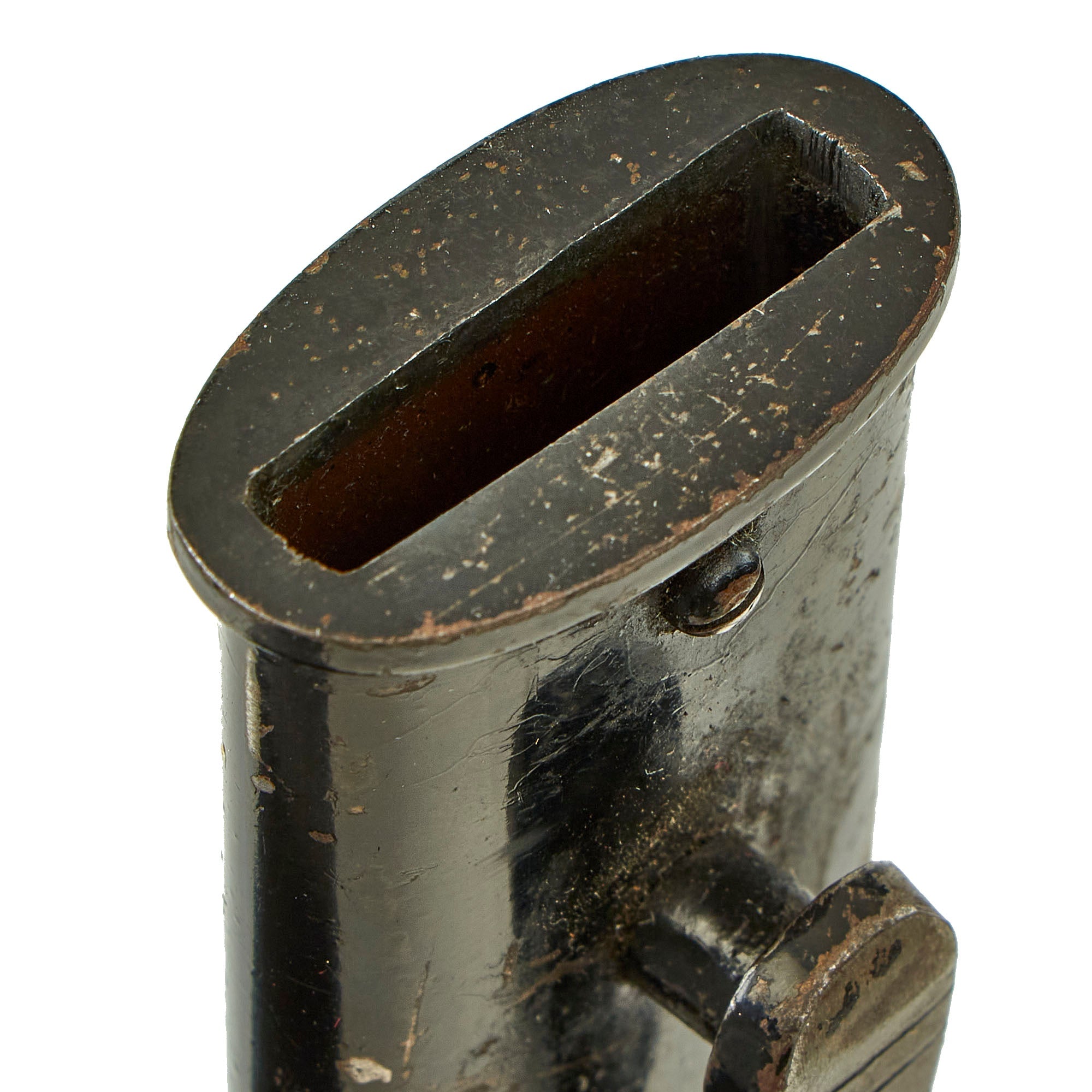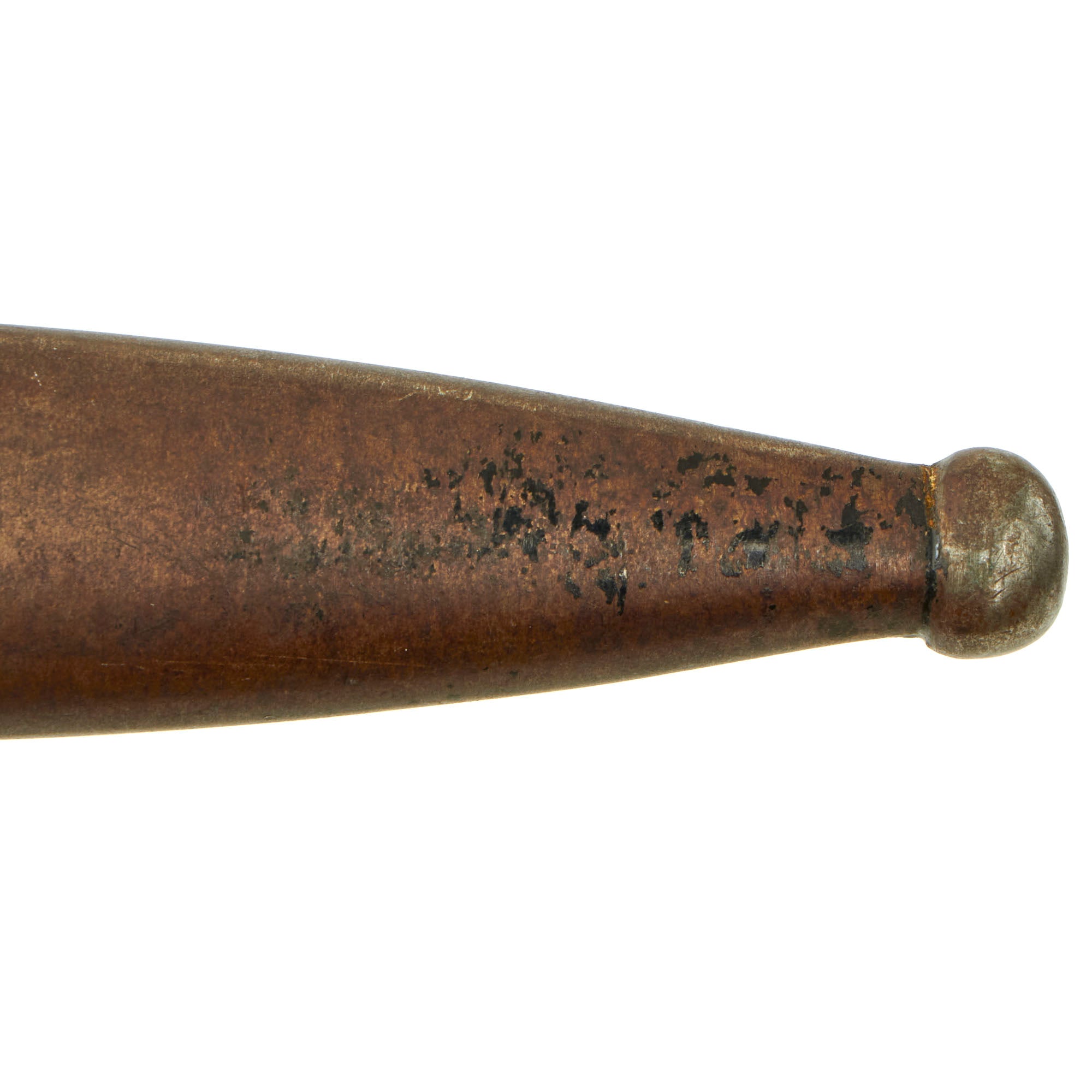 The scabbard is straight throughout, not showing any major dents, however it has lost most of the original black enamel paint due to wear. What remains is checked and crazed, as enamel of this age should be. It looks like it was held in a frog for a long time, however there was no frog included with the bayonet.