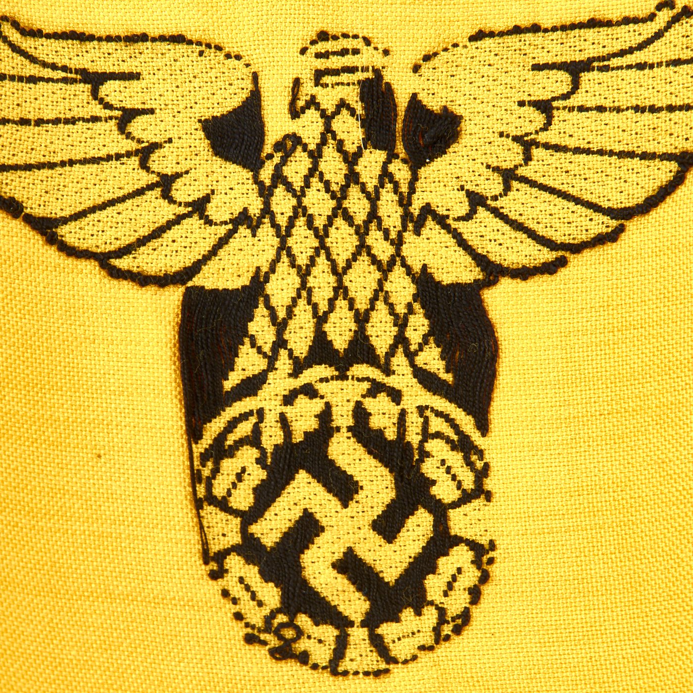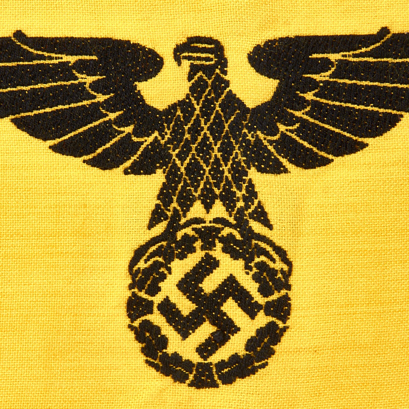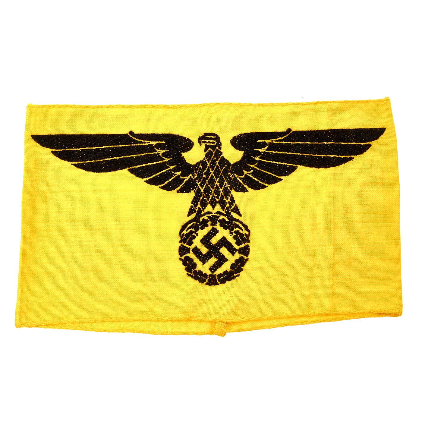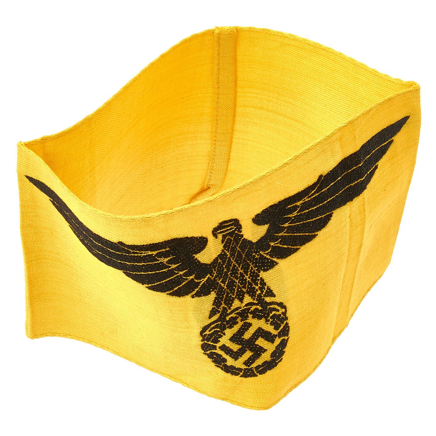 Original Item: Only One Available. The yellow German State Service Armband was worn by uniformed German personnel who were attached to the Armed Forces during WWII. Often, these were worn by men of the Reichsarbeitsdienst (State Labor Service) and Reichsbahn (State Train Service) who were operating with the German Army in the occupied countries. This is an excellent example, which looks to be in unissued condition. This Deutsche Wehrmacht armband is a textbook Bevo-style machine embroidered armband, with a very nice Reichsadler (State Eagle) clutching a wreathed swas (hook cross). Measures approximately 14 x 4 inches.