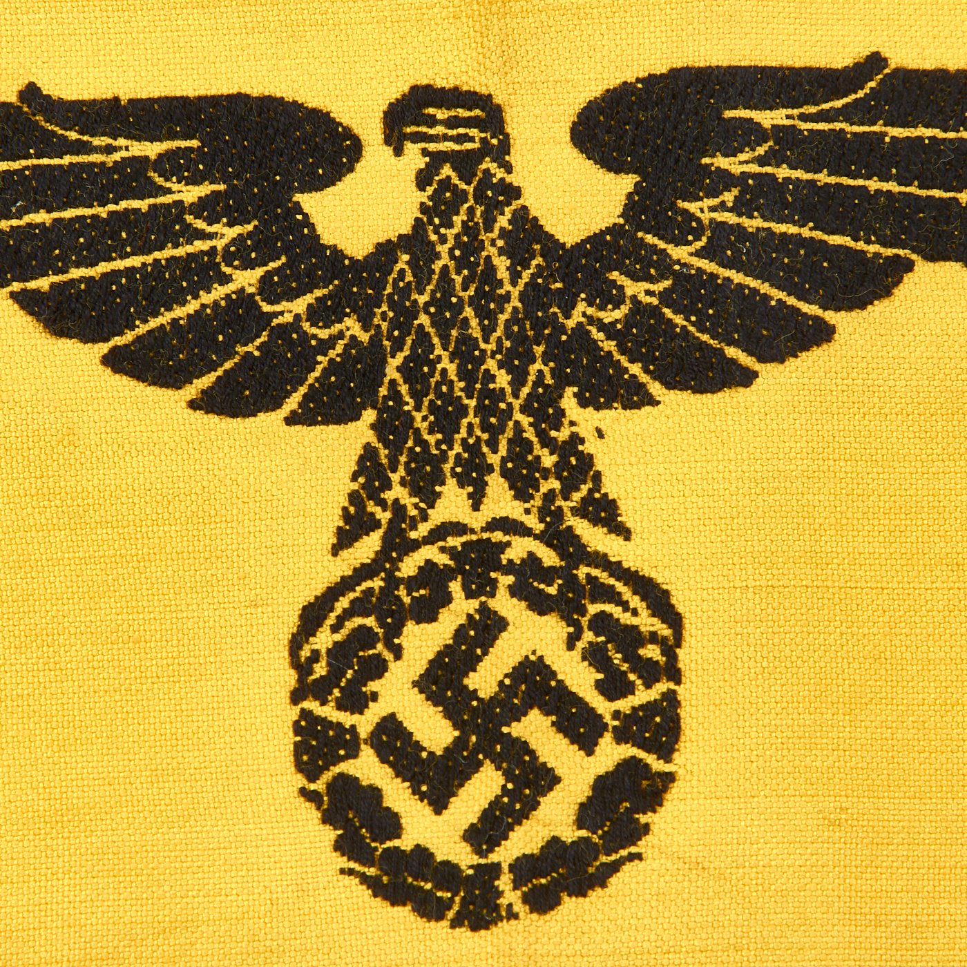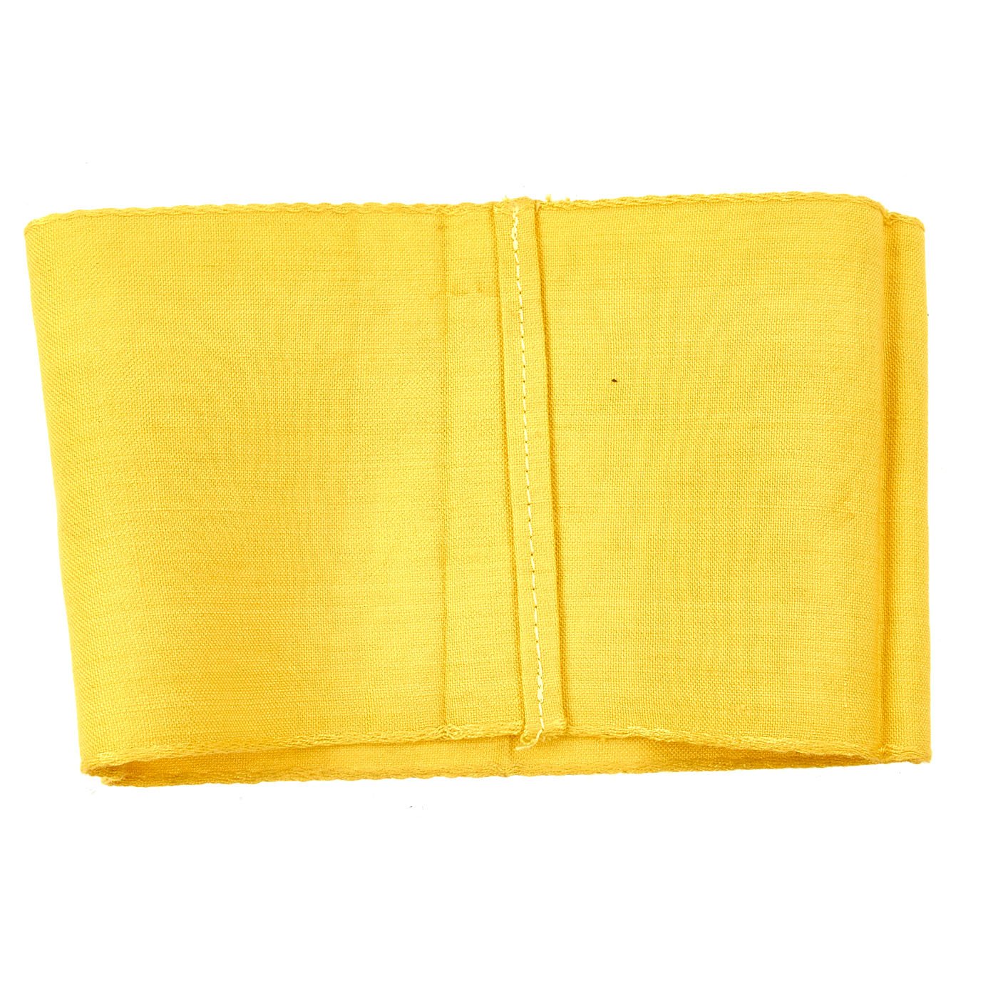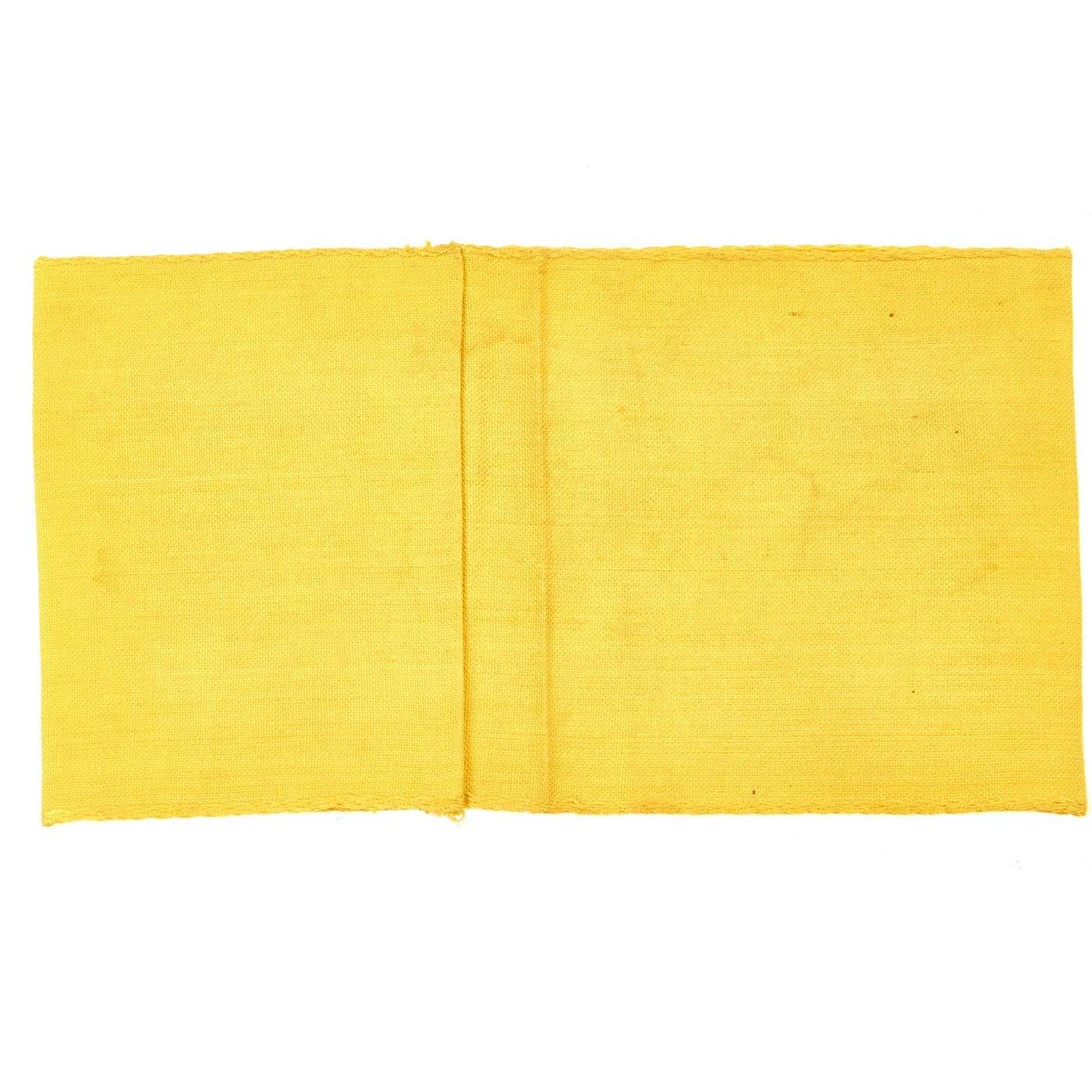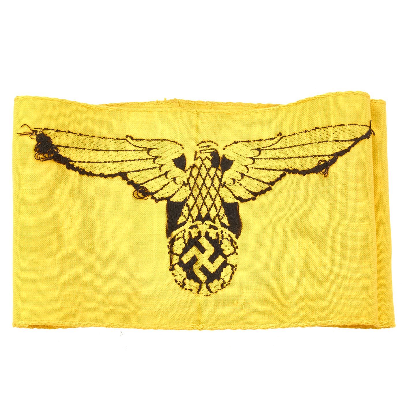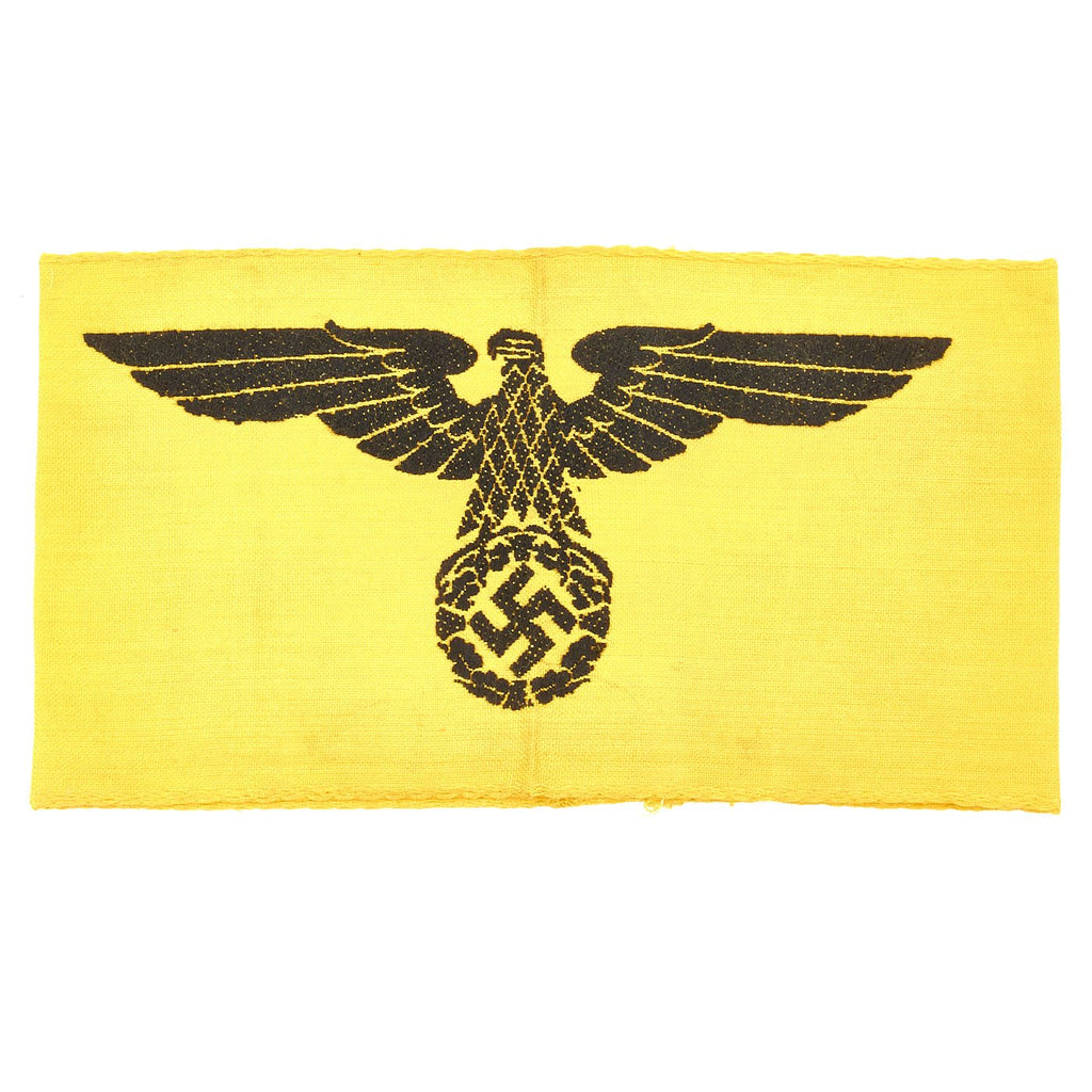 Original Item: Only One Available. The yellow German State Service Armband was worn by uniformed German personnel who were attached to the Armed Forces during WWII. Often, these were worn by men of the Reichsarbeitsdienst (State Labor Service) and Reichsbahn (State Train Service) who were operating with the German Army in the occupied countries. This is an excellent example, which looks to be in unissued condition, with some staining from long storage. There are no pin holes or depot stamp, which it should get when being issued. This Deutsche Wehrmacht armband is a textbook Bevo-style machine embroidered armband, with a very nice Reichsadler (State Eagle) clutching a wreathed swas (hook cross). Measures approximately 15 x 4.25 inches.