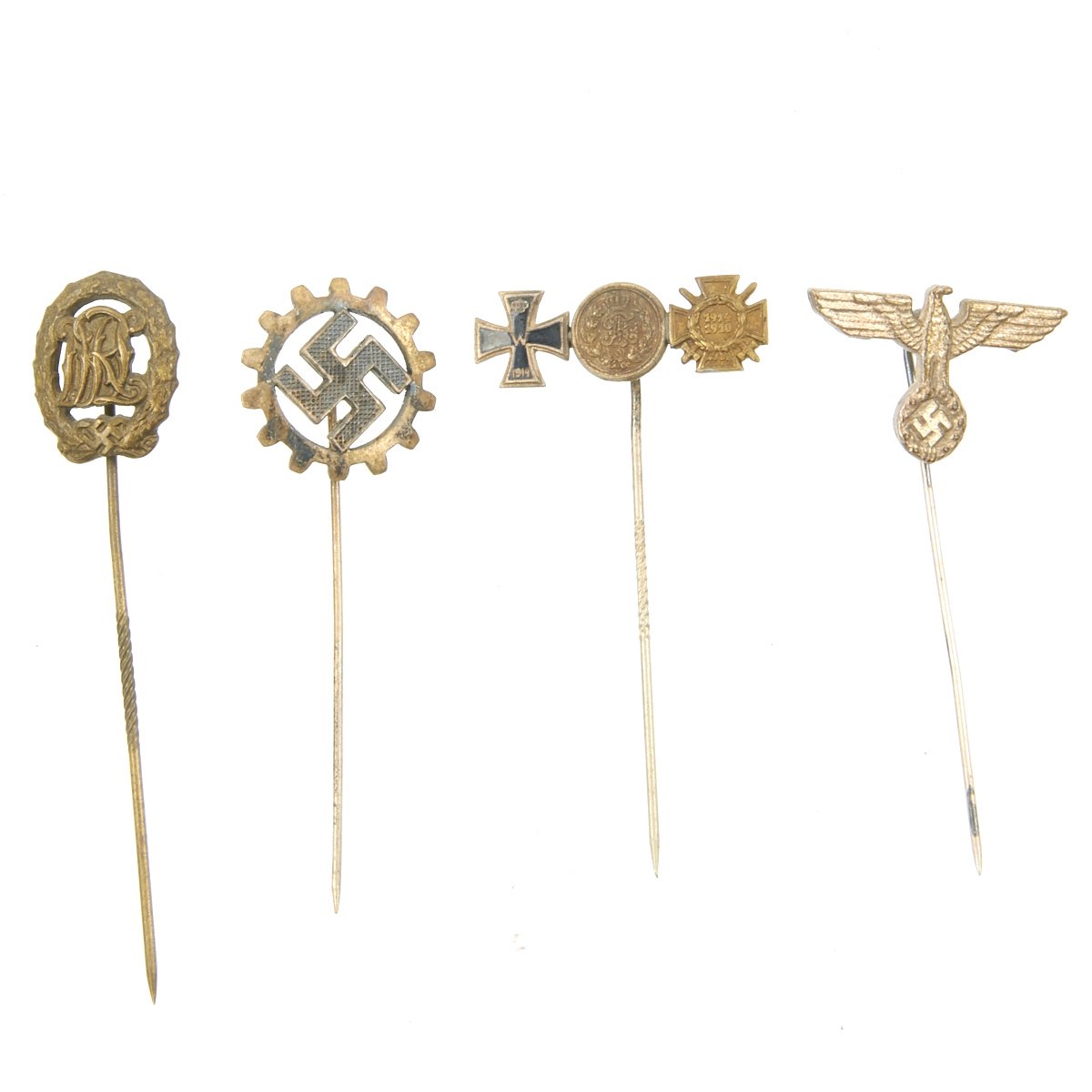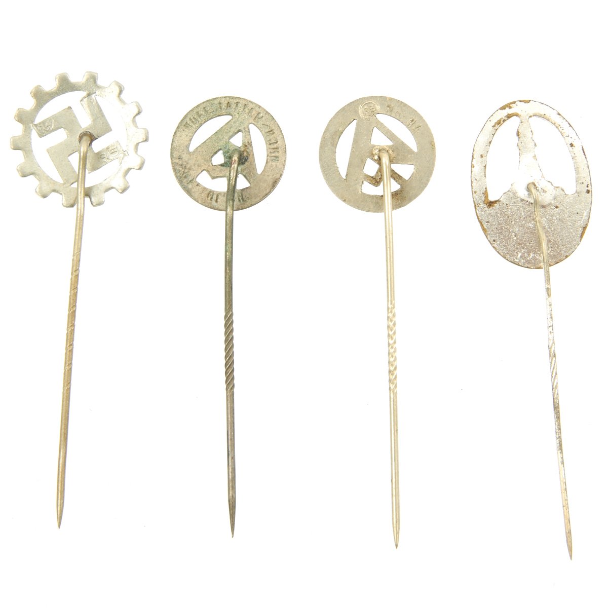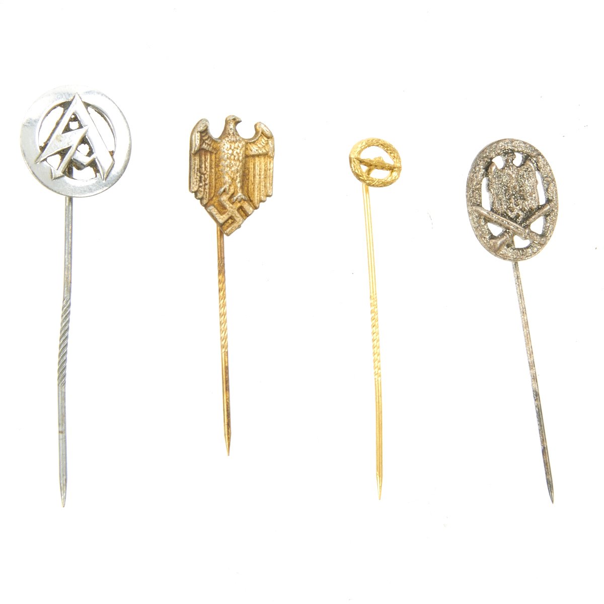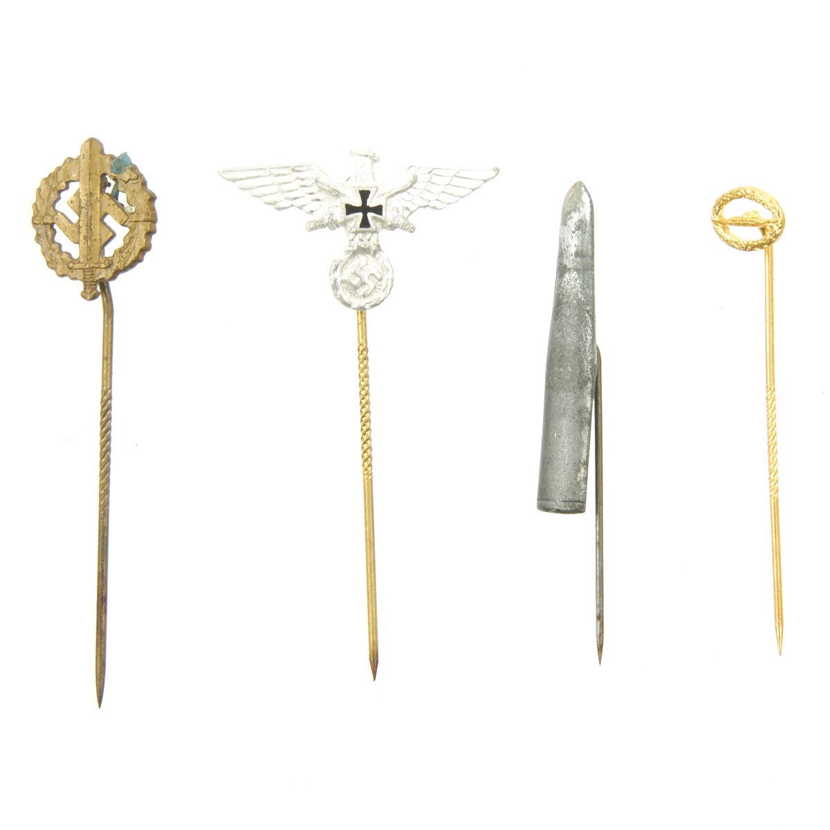 - Original Items: Only One Set Available. This is a lot of 28 German WWII Combat and Civilian stick pins. The German armed forces and political organizations during WWII awarded a wide array of stick pins to their members. In some cases, primarily for the military organizations, the stick pins were a small representation of a larger award. For example, a pilot's badge would be issued in a box with a stick pin. The large badge was used with a regular military uniform. The stick pin was generally used with civilian clothes at social functions, rallies and public events. All stick pins are offered in good to excellent condition. See photos to view the pins included with the purchase of this collection.