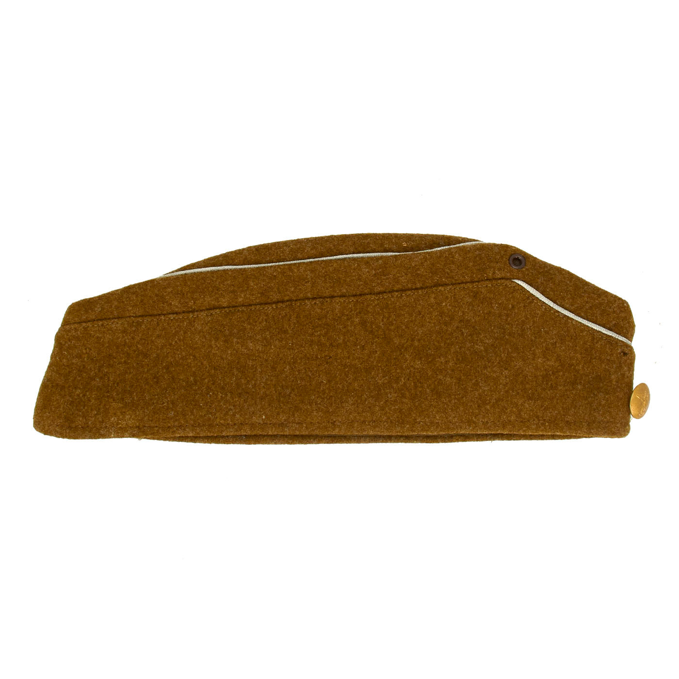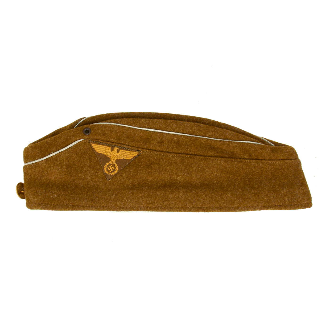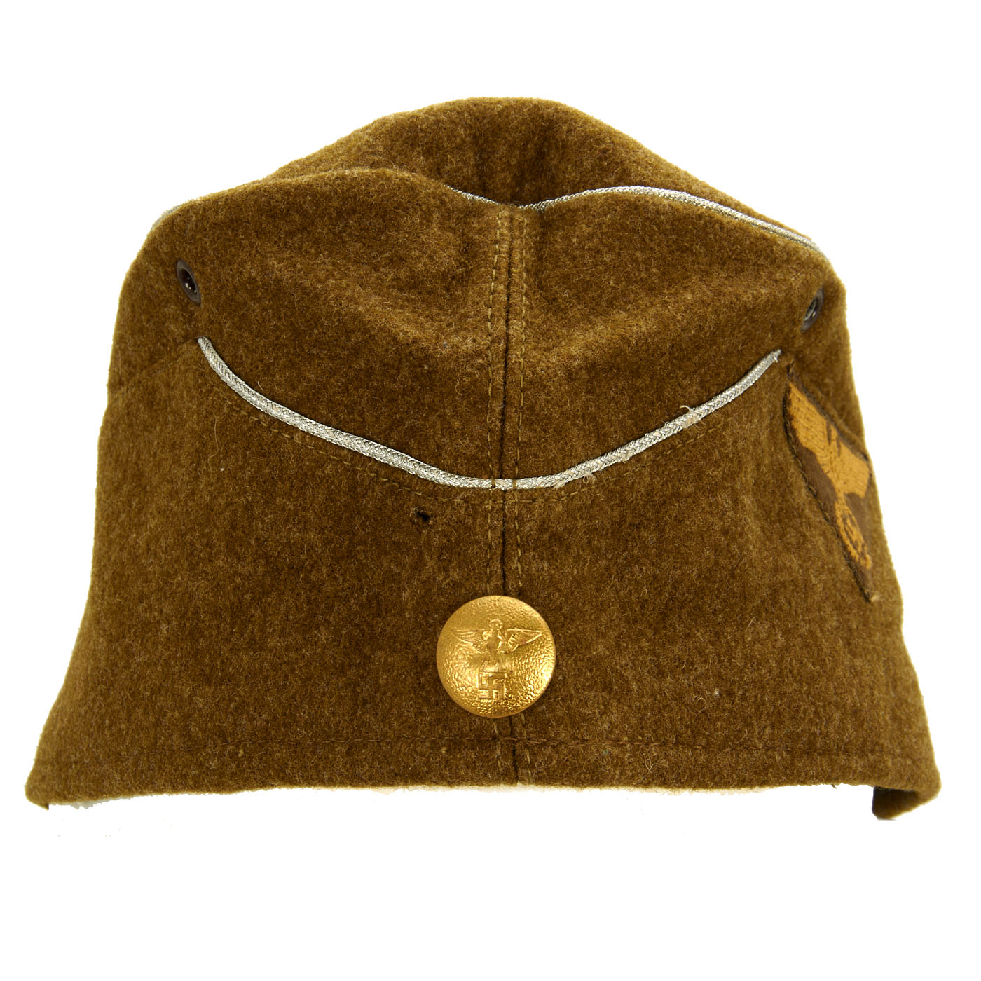 Original Item: Only One Available. A well-preserved Sturmabteilung (SA garrison cap, constructed of brown wool. The cap is fully surrounded by decorative scalloped fold-down side panels, held in place by a row of machine stitching around the circumference. The cap is flanked on each side by a ventilation hole reinforced by a brown-painted magnetic metal eyelet. Stitched onto the left side of the cap is an insignia in the form of a brown cotton triangular backer bearing a machine-embroidered yellow SA-style German national eagle clutching a wreathed mobile swas.