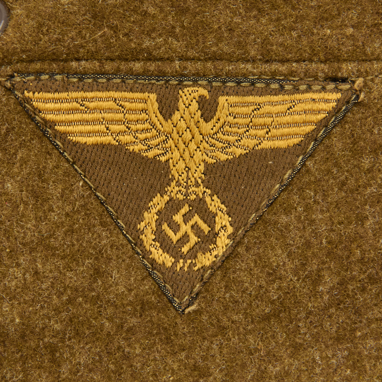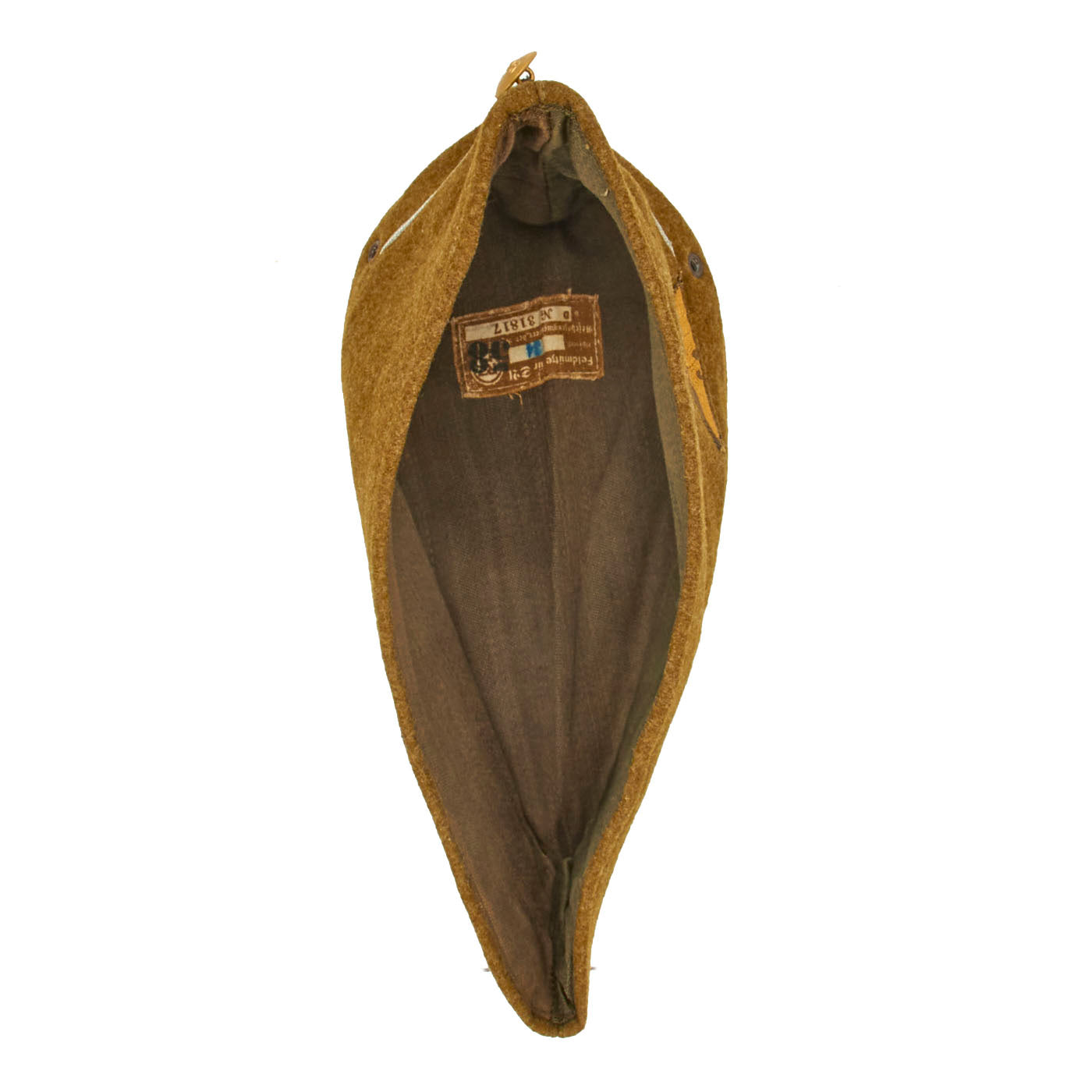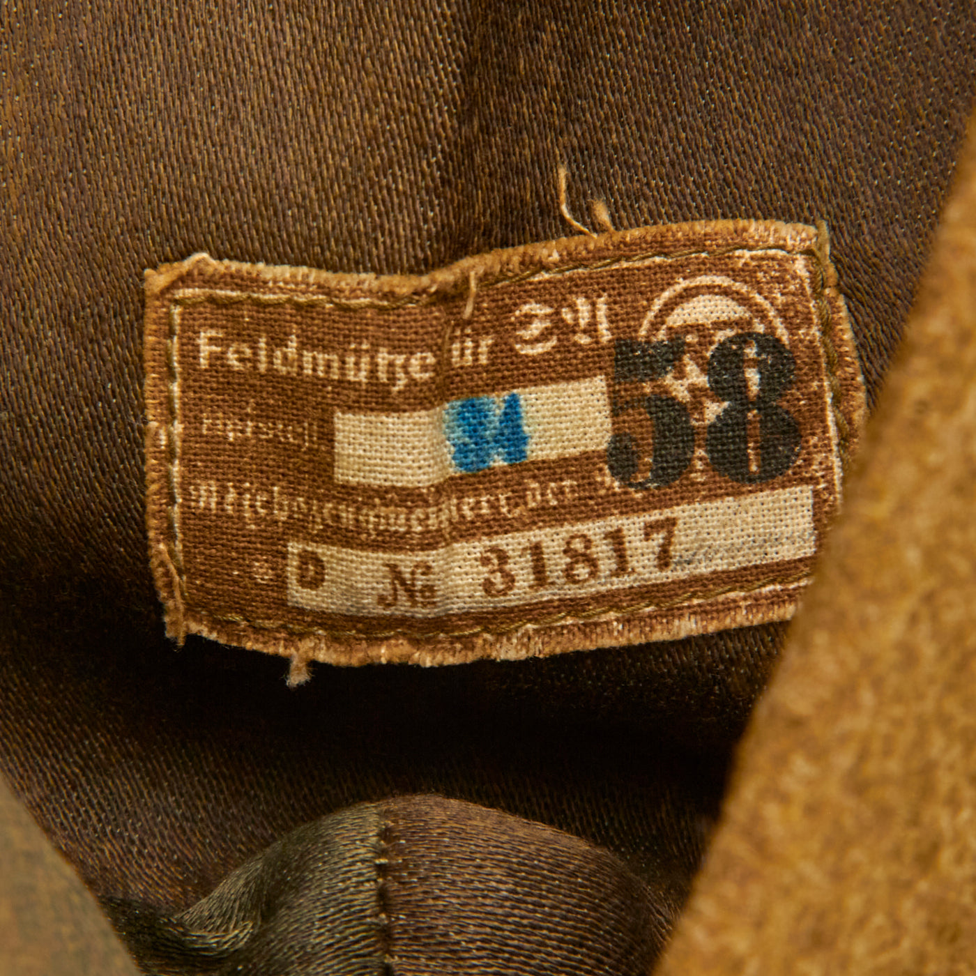 The exterior features include a pebbled and gilded magnetic metal button stitched to the front. There is also bullion silver piping around the top of the cap. A greenish brown cotton-blended liner fully encompasses the interior, with the crown bearing an intact Reichszeugmeisterei (RZM) label with a maker’s code of “34” and a secondary code of “31817”. A black ink size stamp of “58” overlays the RZM label. The cap is in an overall near extremely fine condition.