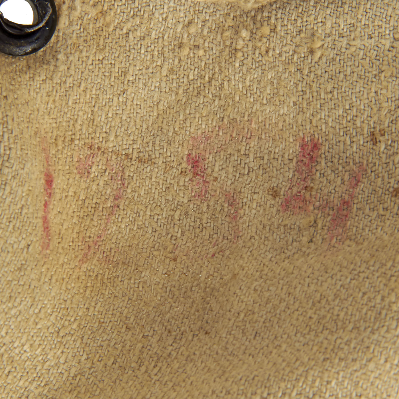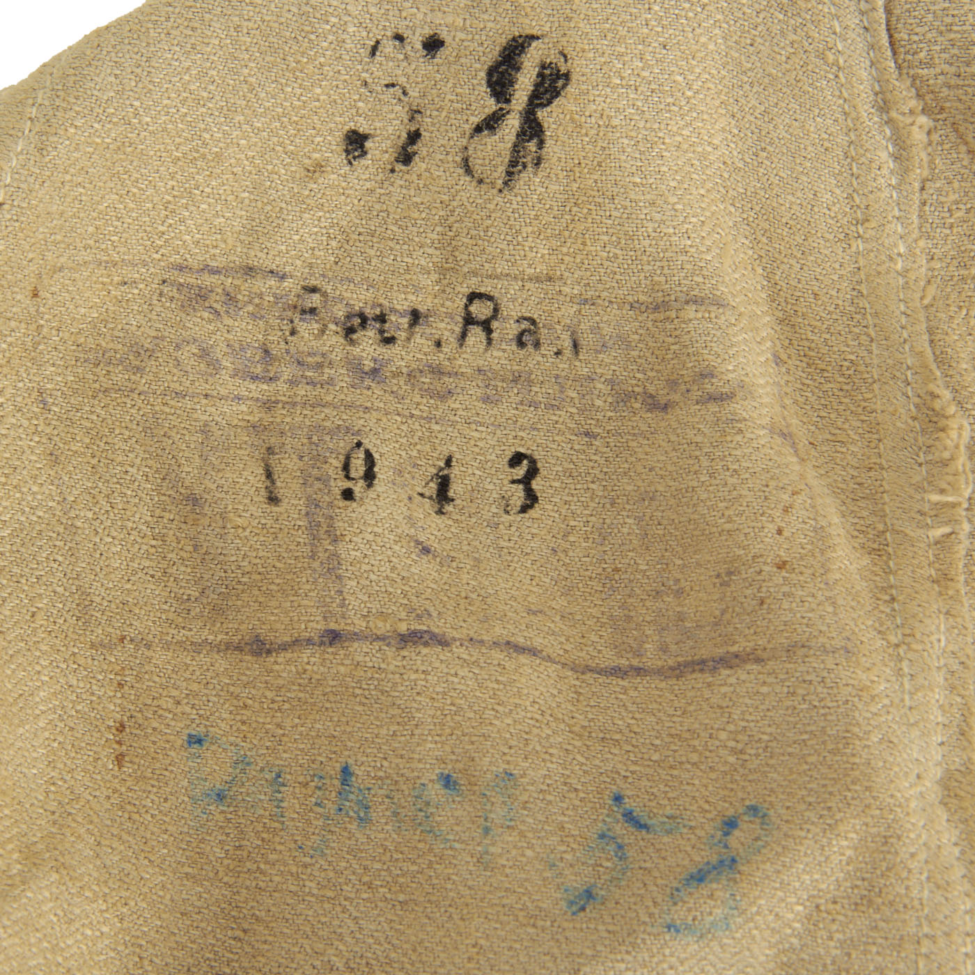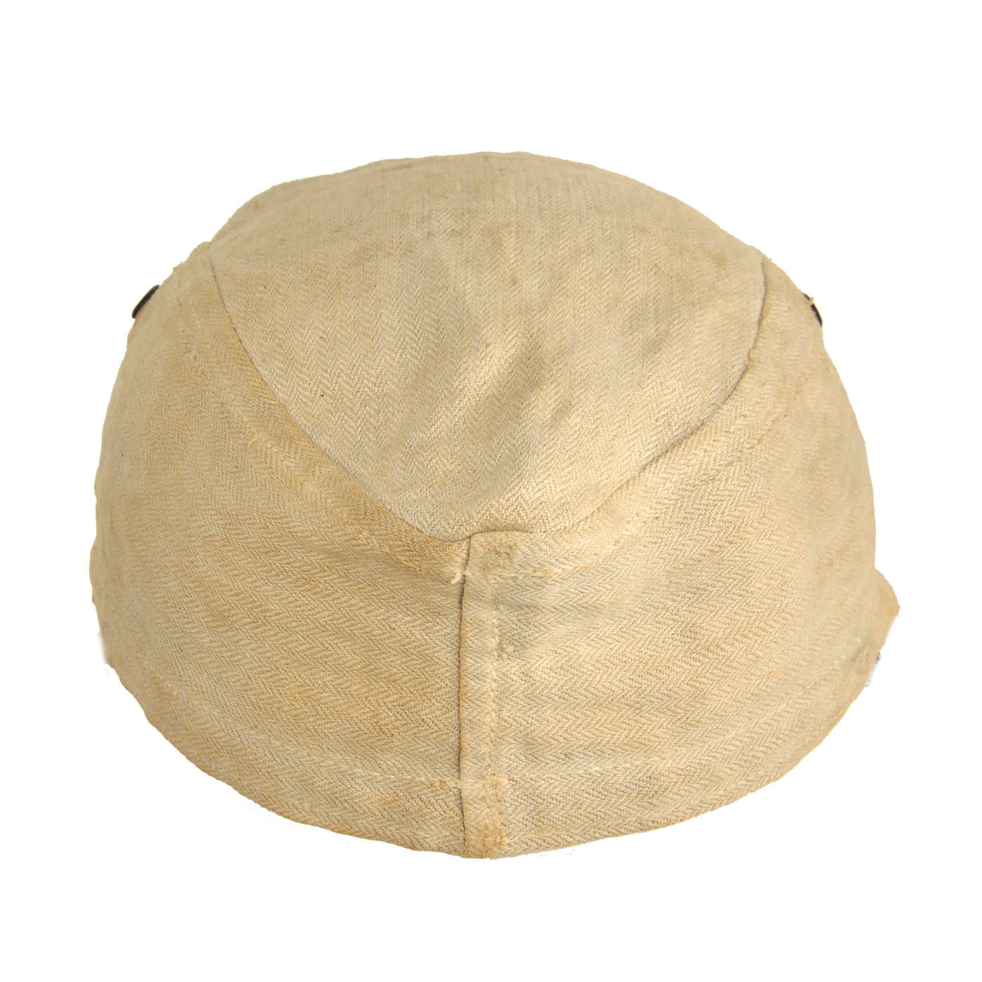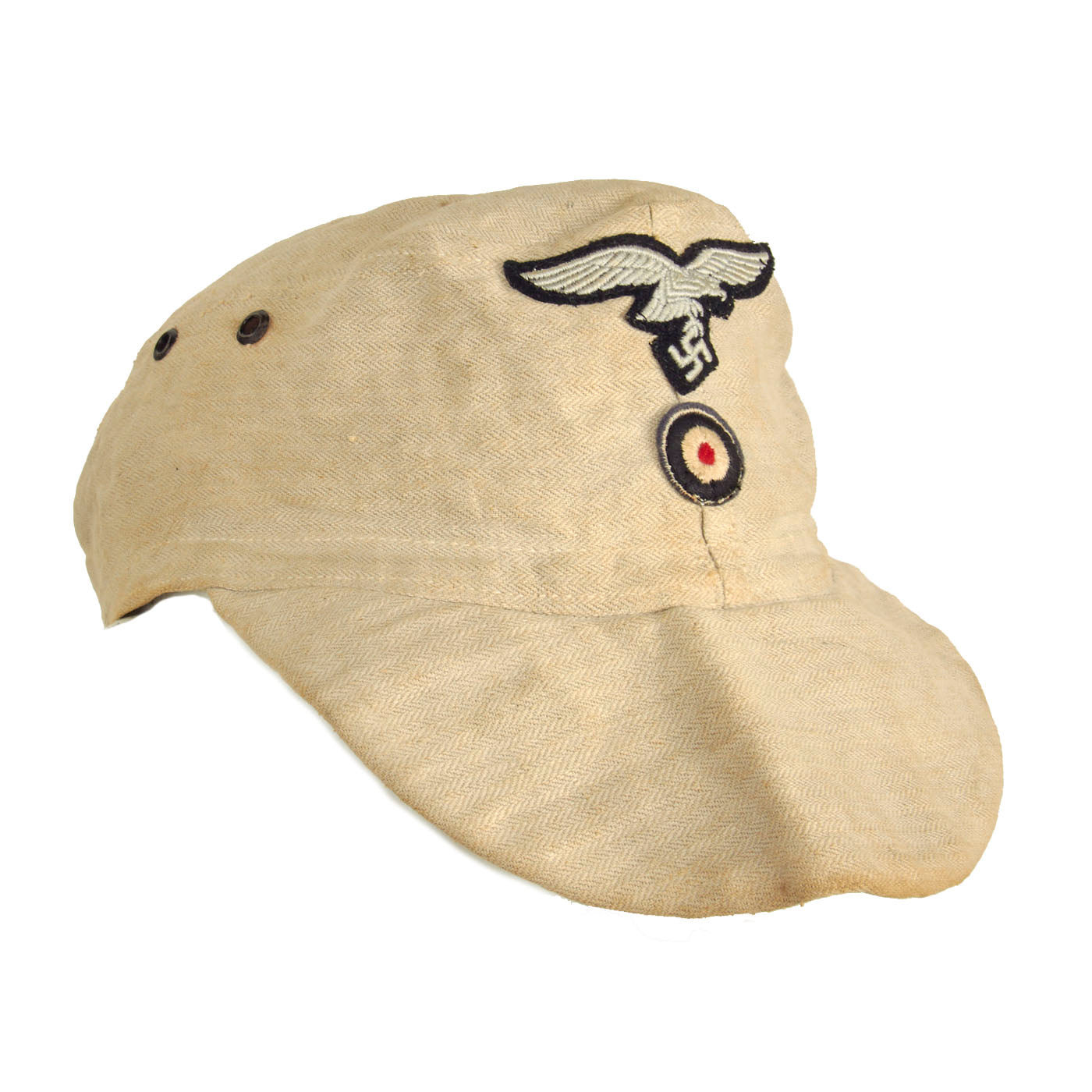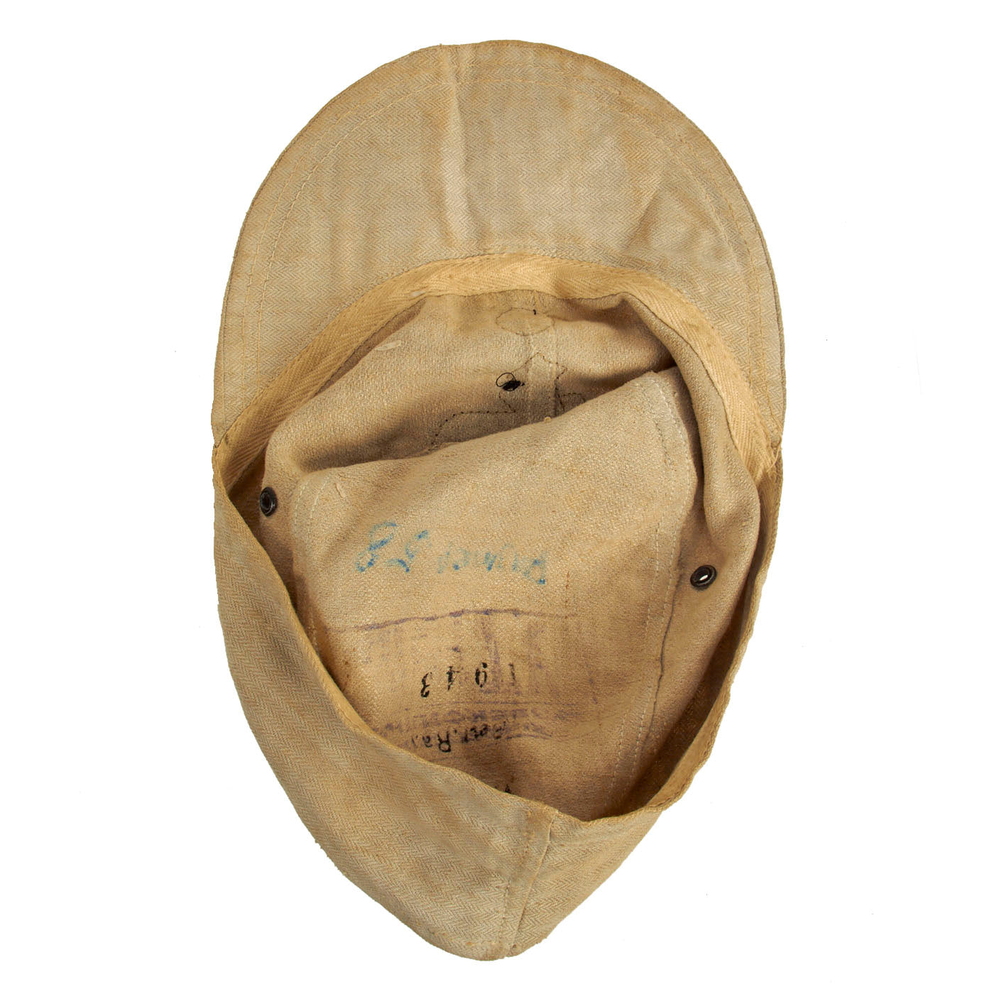 Original Item: Only One Available. This is a very nice service used example of a Luftwaffe summer weight HBT field cap, with a great "broken in" look. The cap is constructed with a single layer of white HBT fabric, which suggests issue to Division Hermann Göring, whose corps color and field uniforms were often a white color. The lightweight design lacks the faux fold down scallop seen on the M43 series of caps. It also seems to only have a thick fabric stiffener in the brim, so these could be literally folded up and put in a pocket.