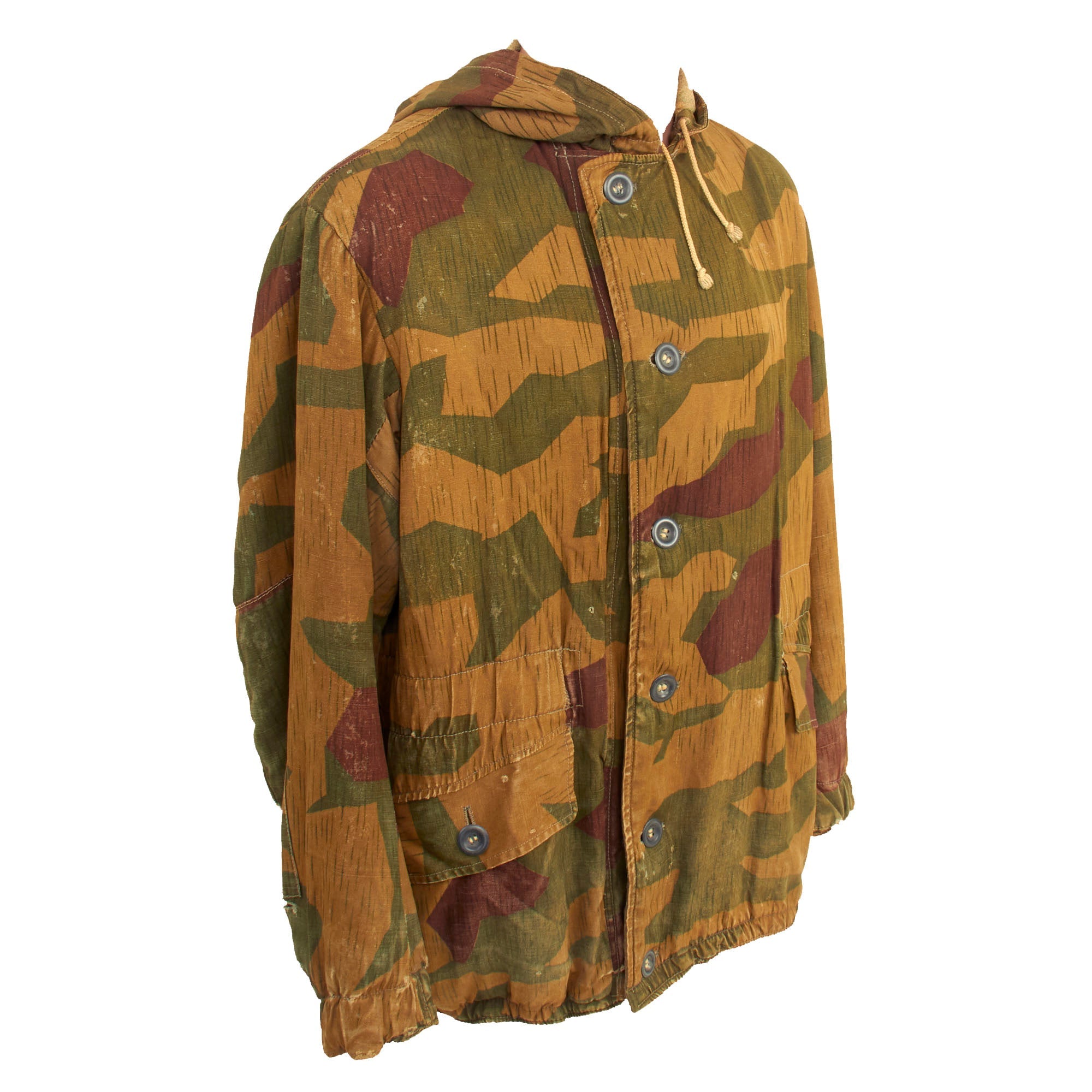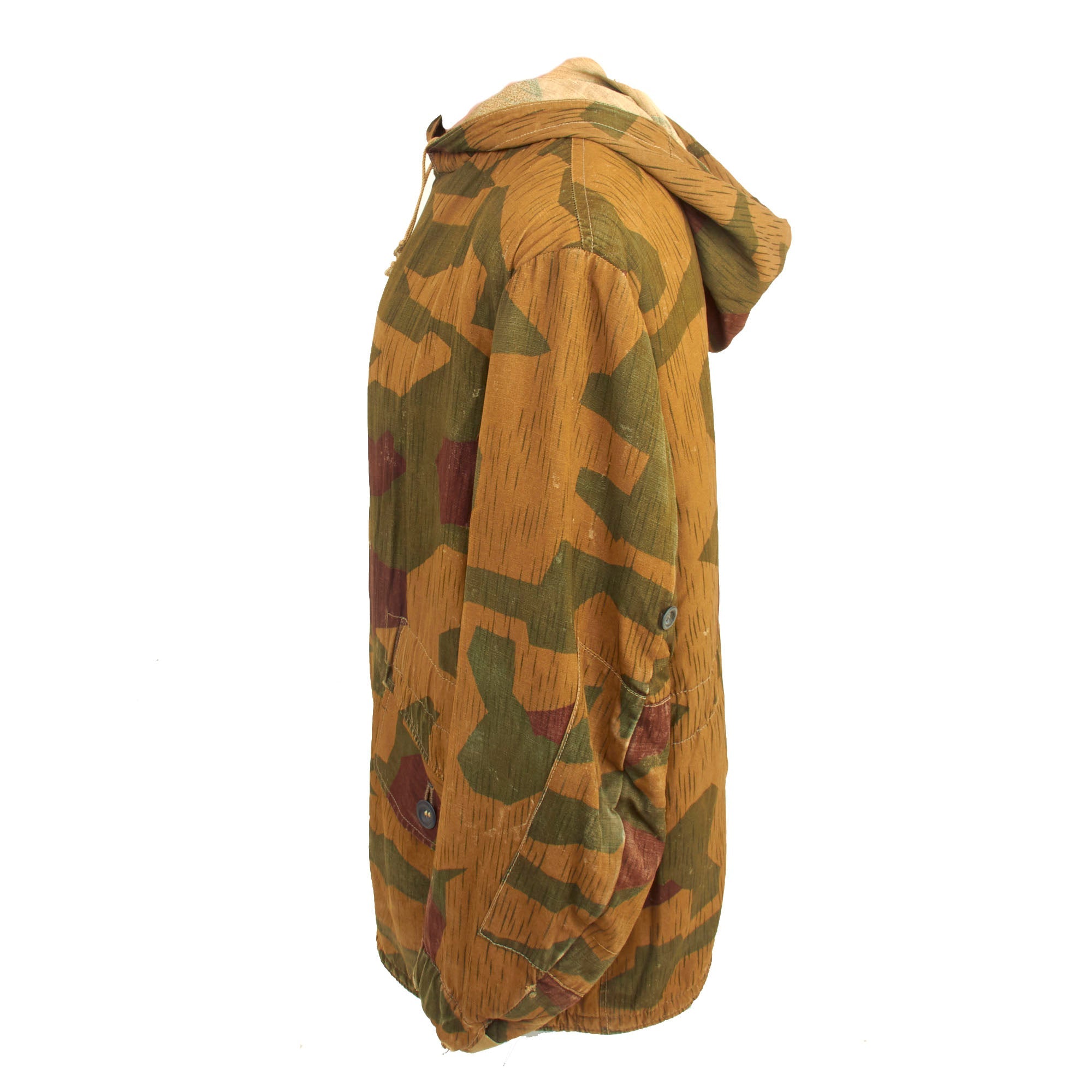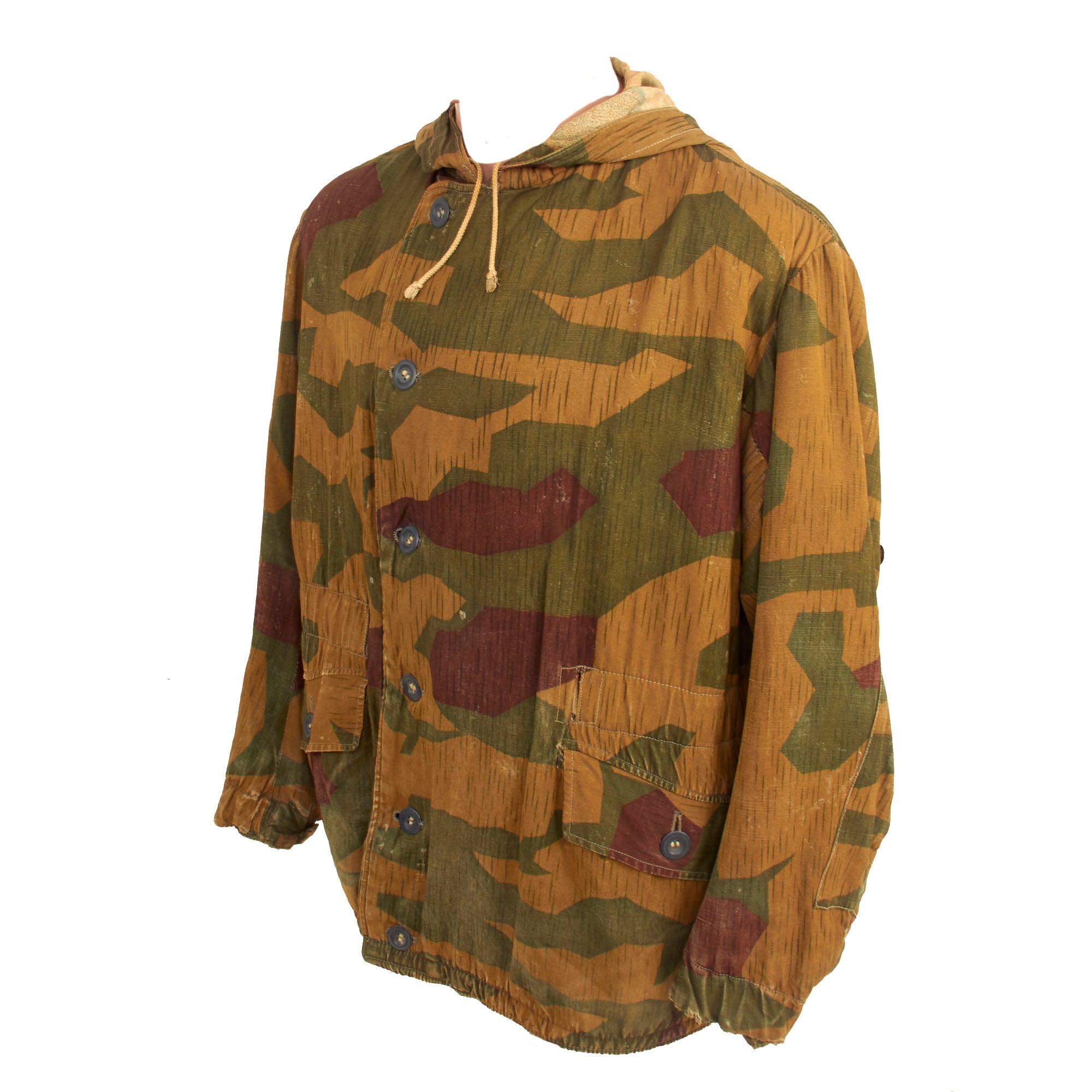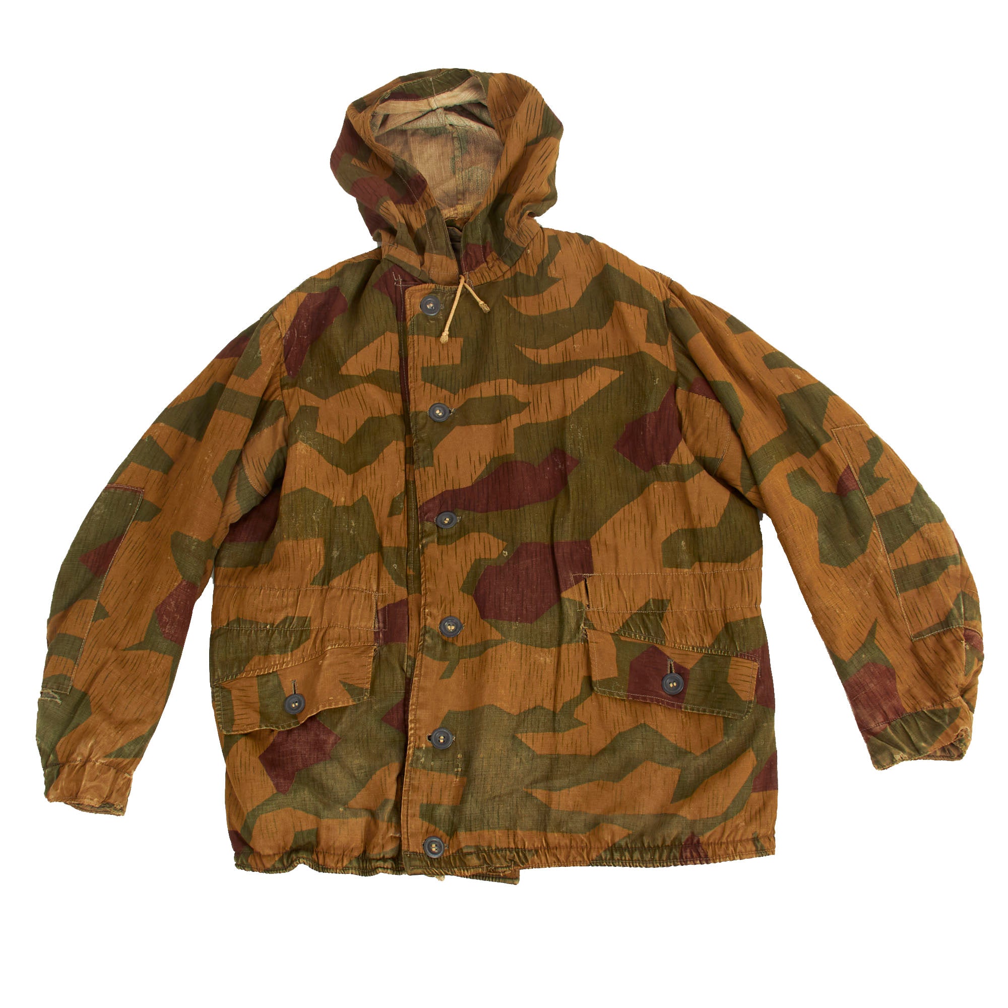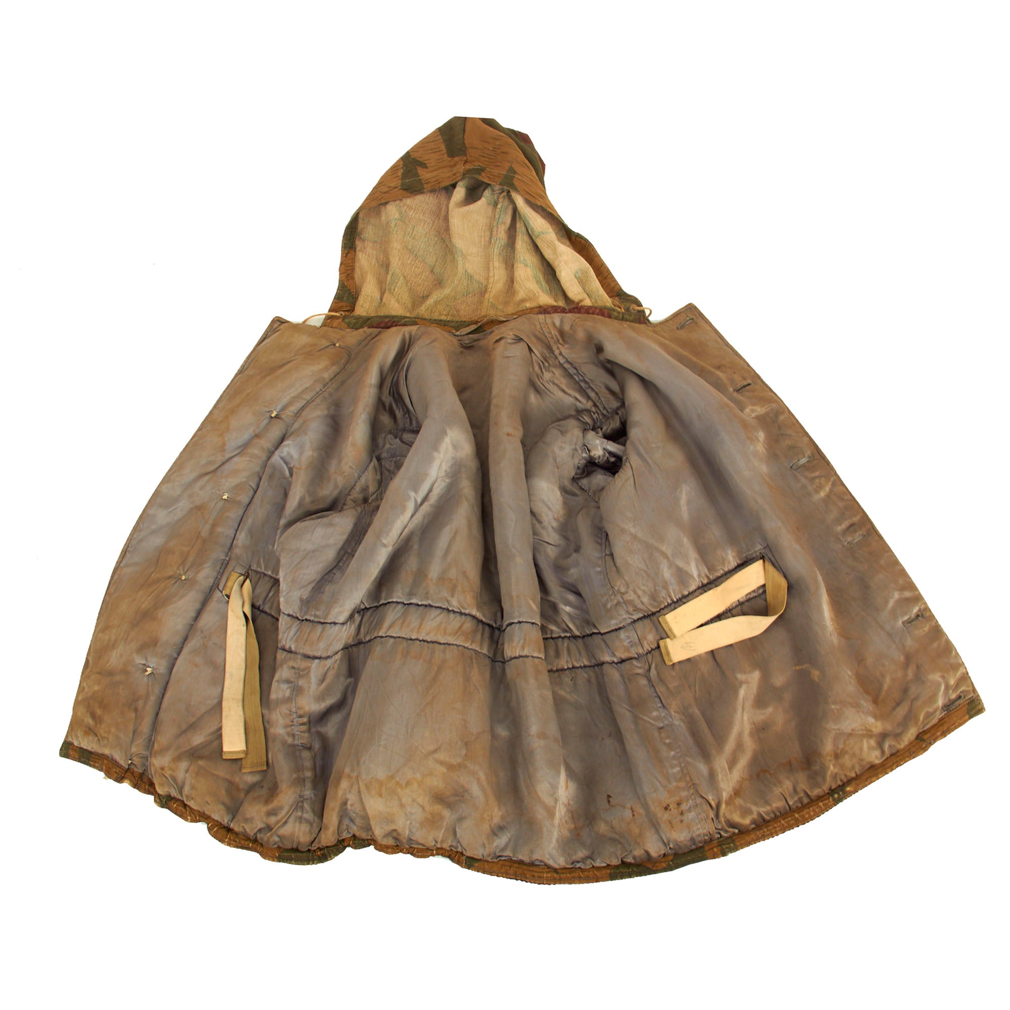 Original Item: Only One Available: This is a wonderful condition Zeltbahn Swamp Pattern Camouflage parka used by German soldiers during World War Two. The Sumpftarnmuster (Swamp or Tan Water Camouflage Pattern) model parkas appeared in the winter of 1943 and were widely issued throughout the German Army and some specialty units. Many parkas reverse from camouflage to white, this example does not and has a lovely gray rayon lining. Hood and waist drawstrings are present. All buttons are aluminum and present.