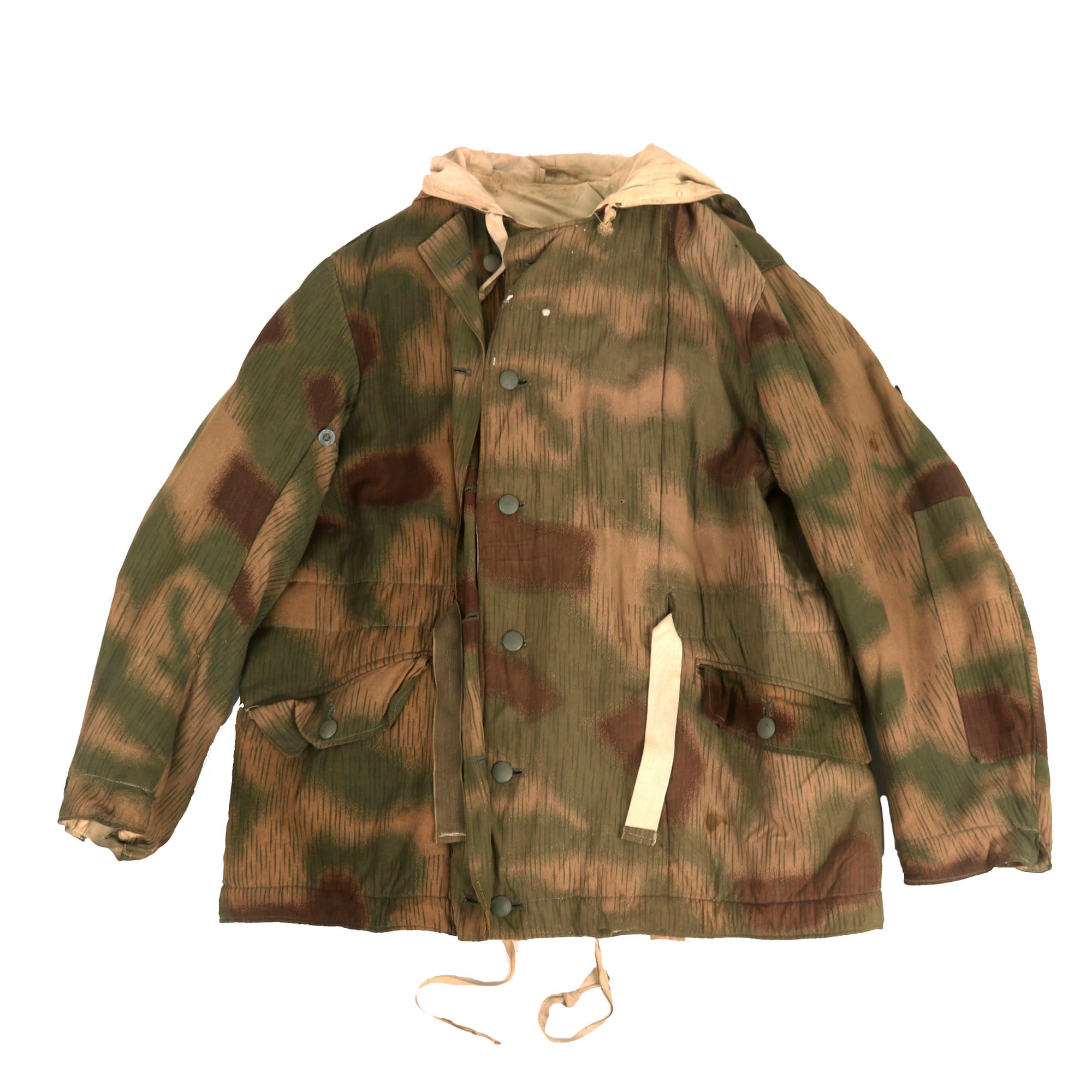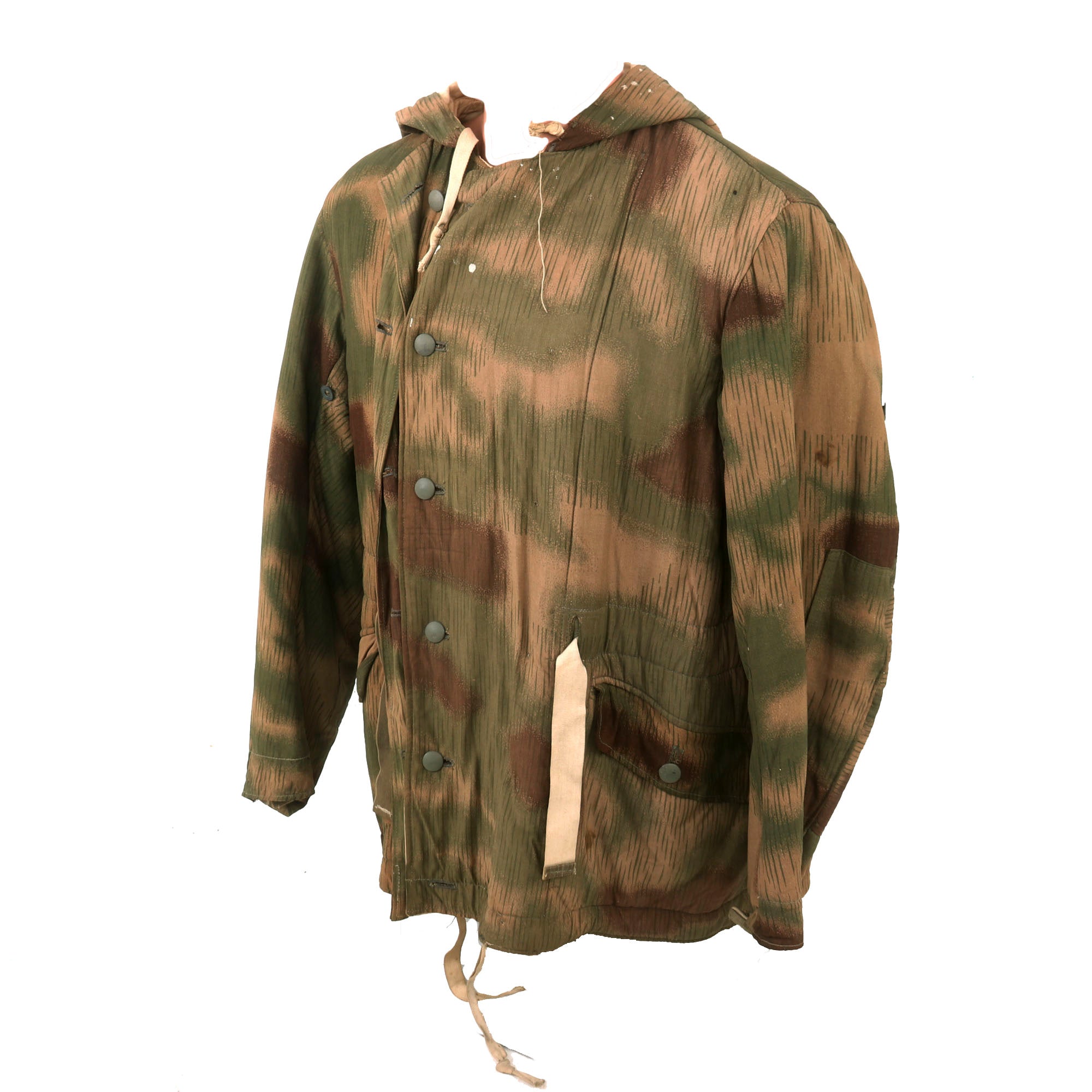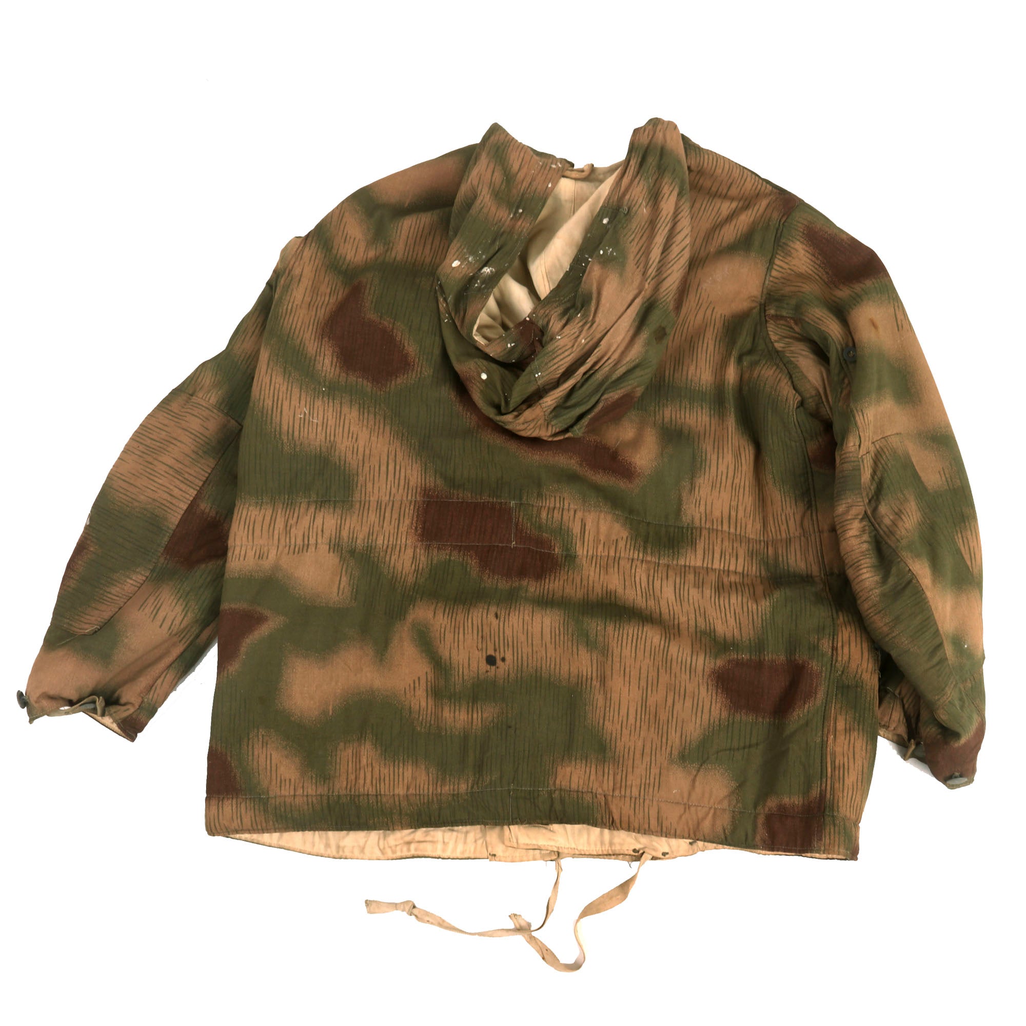 Original Item: Only One Available: This is a very good service used condition Zeltbahn Swamp Pattern Camouflage parka used by German soldiers during World War Two. The Sumpftarnmuster (Swamp or Tan Water Camouflage Pattern) model parkas appeared in the winter of 1943 and were widely issued throughout the German Army and some specialty units. Many parkas, such as this one, are able reverse from camouflage to white, and even have white painted buttons on the inside. Both the hood and waist drawstrings are present, though they are a bit hard to move, and we did not want to force them. All of the buttons are non-magnetic, probably made from zinc or aluminum, and it looks like all are still present.