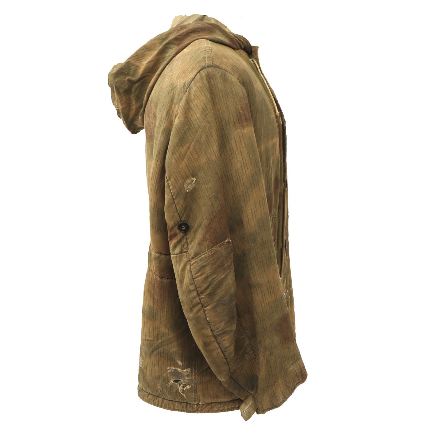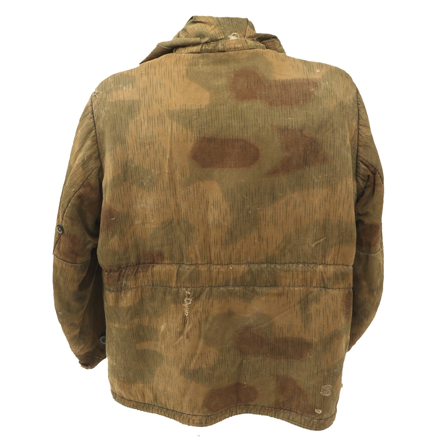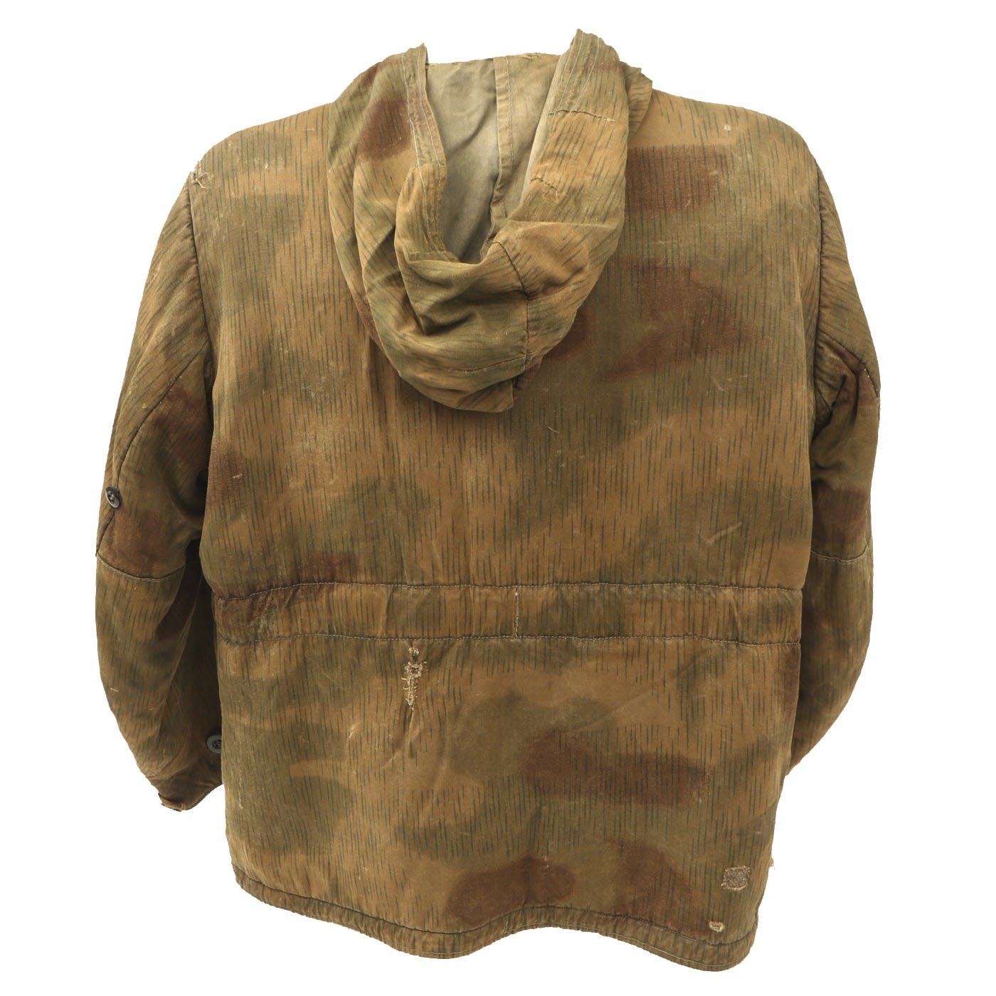 Camouflage has some overall fading from age with some nips and fraying, especially at the neck. Interior has loop at neck to hang parka. A very rare and hard to find original World War II German winter parka.