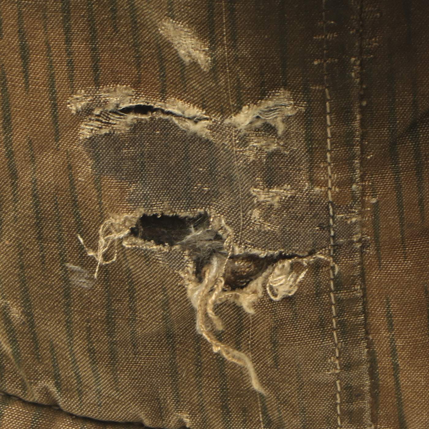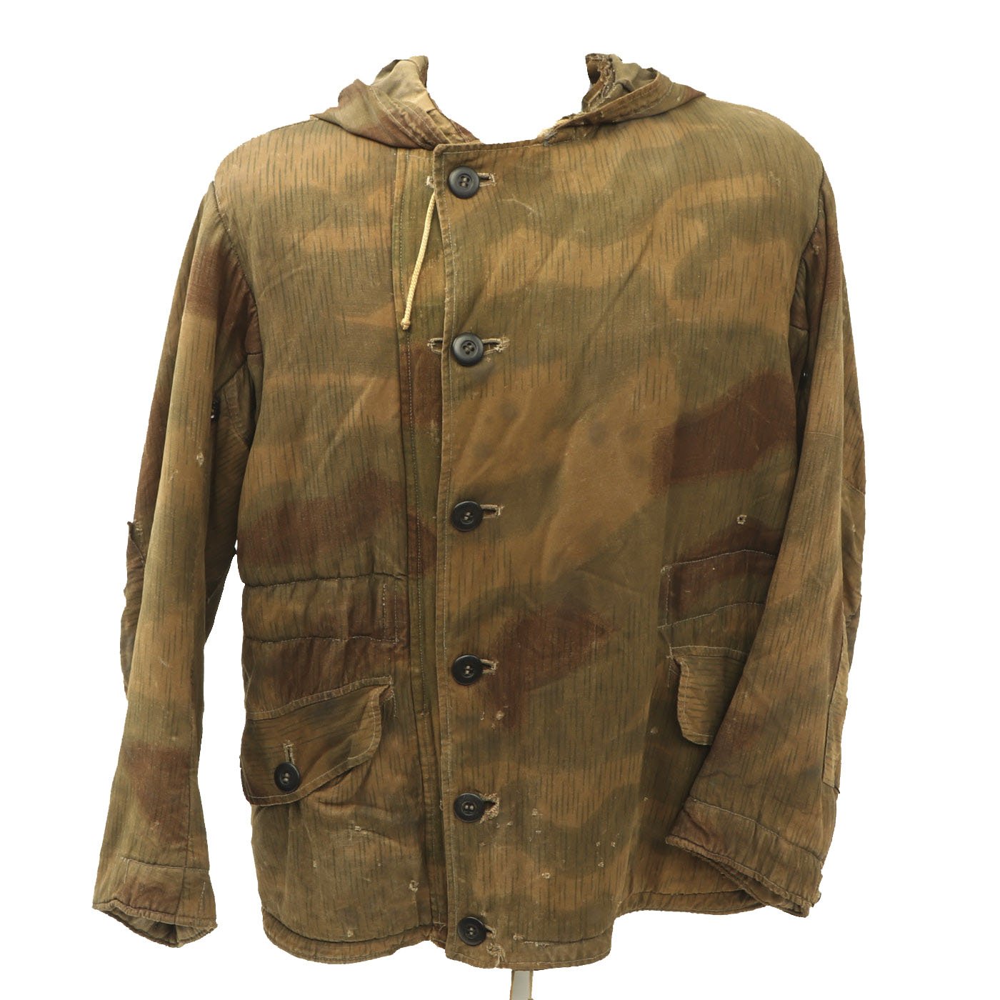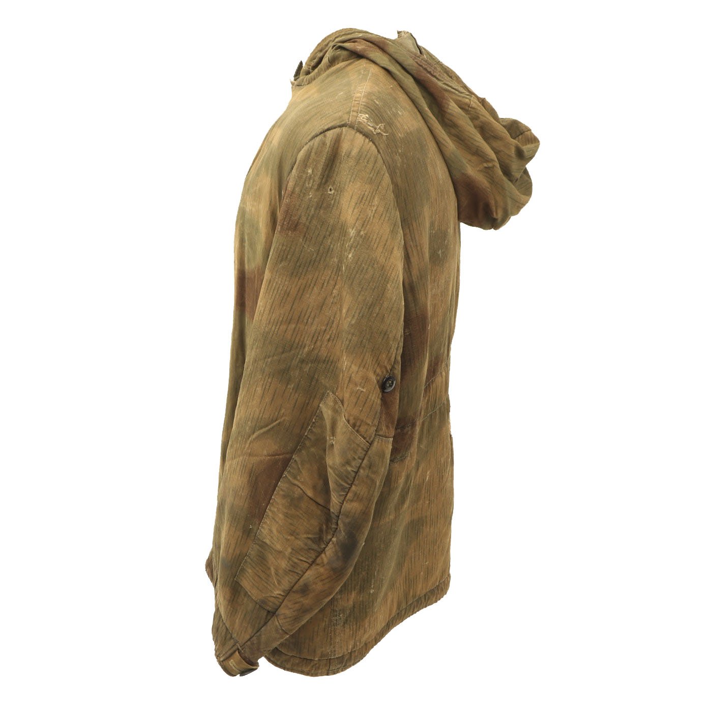 Camouflage has some overall fading from age with some nips and fraying, especially at the neck. Interior has loop at neck to hang parka. A very rare and hard to find original World War II German winter parka.
