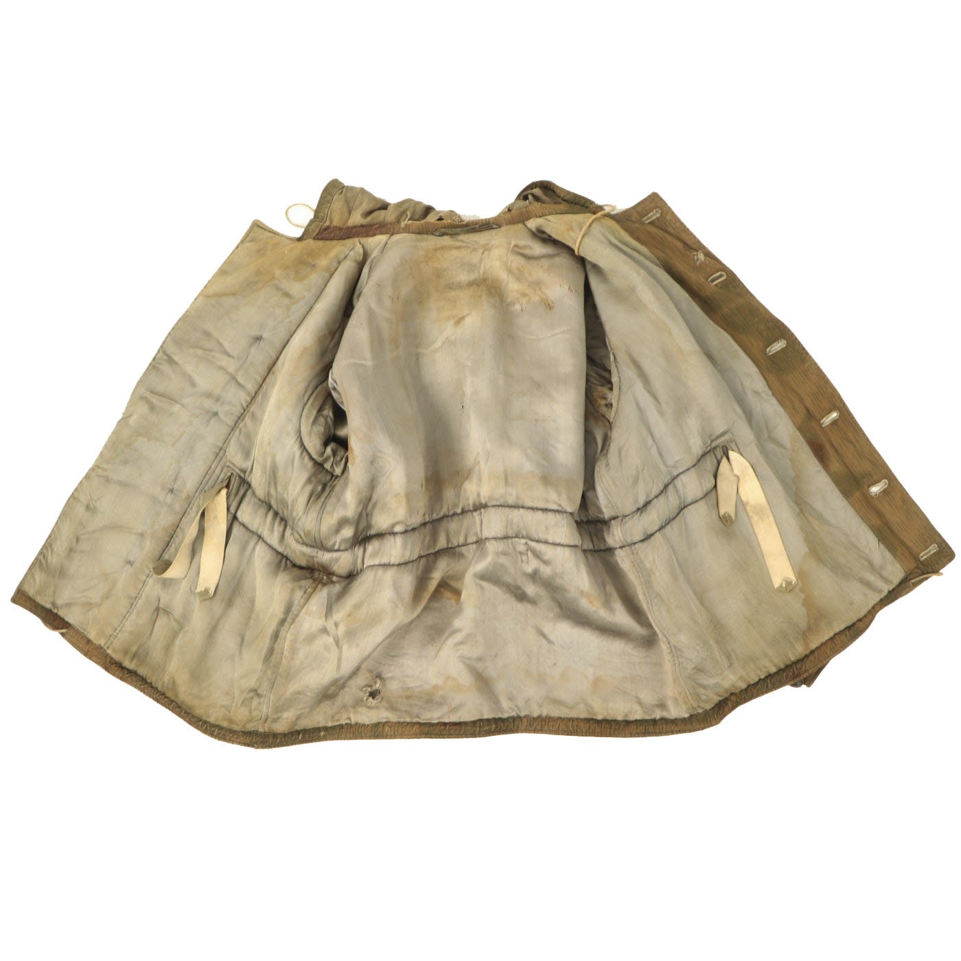 Original Item: Only One Available: This is a wonderful condition Tan Water Camouflage Pattern parka used by German soldiers during World War Two. The Tan Water Camouflage Pattern parkas appeared later in the war and were widely issued throughout the German Army and some Luftwaffe units. Many parkas reverse from camouflage to white, but this model does not reverse and is lined with a quilted gray satin material. Sleeve and waist drawstrings are present. All buttons are bakelite and present.