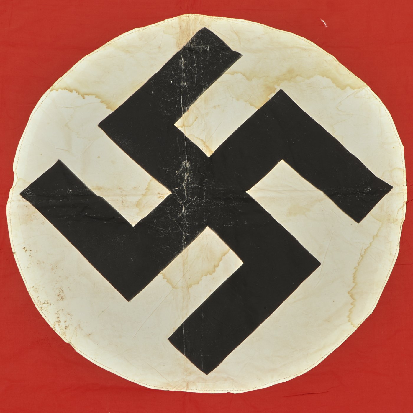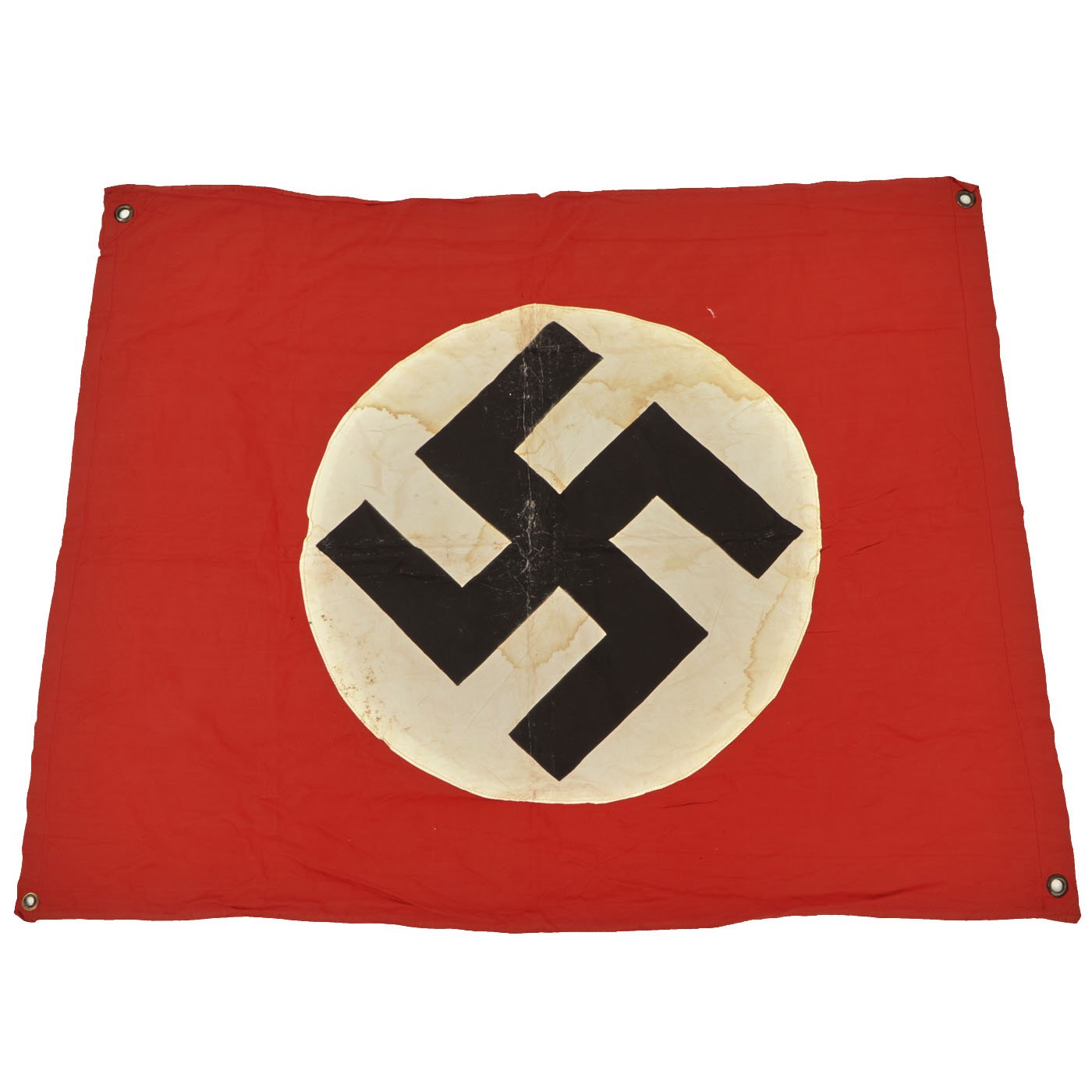 Original Item: Only One Available. This a very good condition multi-piece construction German WWII Panzer tank identification flag. It measures approximately 28 inches x 37 inches and has the standard NSDAP Swas (Hook Cross) stenciled onto a circular white field. This was then sewn onto the red cotton body of the flag. In this example, it looks as if the white circle is made of rayon or some other early synthetic cloth, which may not have easily been dyed, so paint was used instead. Condition is very good, showing wear from service and some staining. There are a few small tears, giving it a lovely "service worn" look.