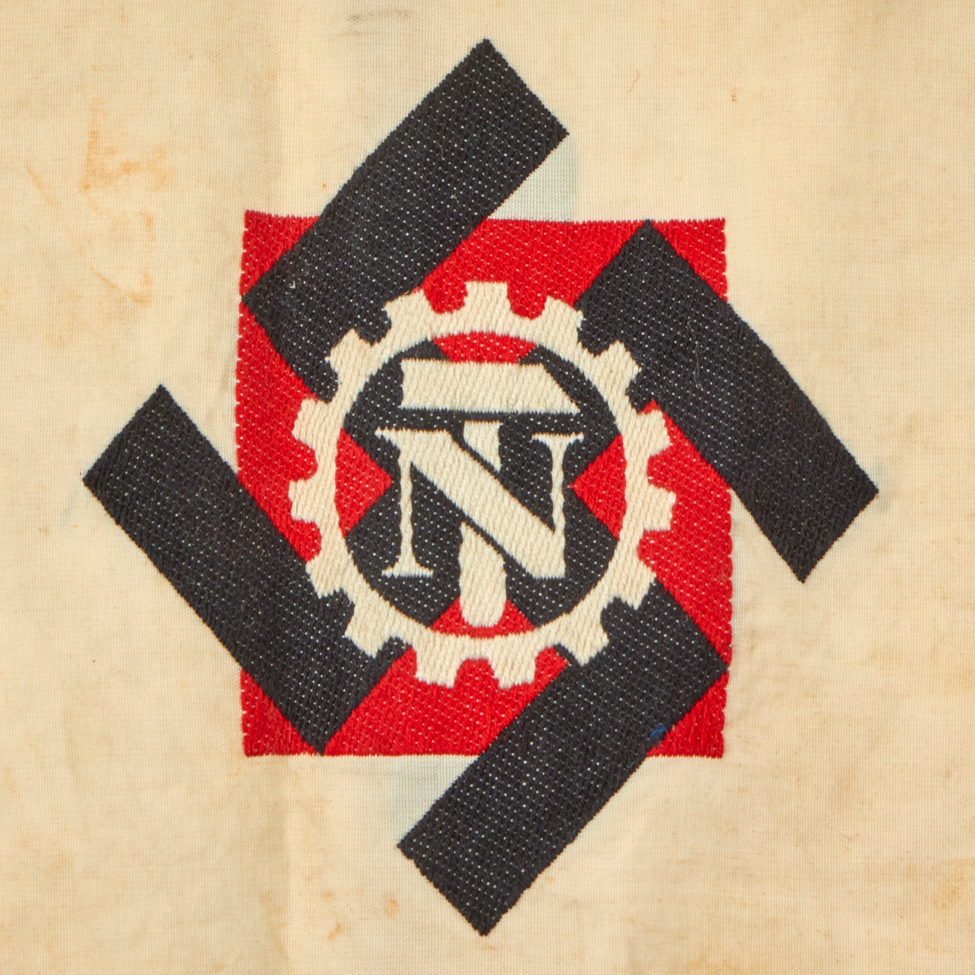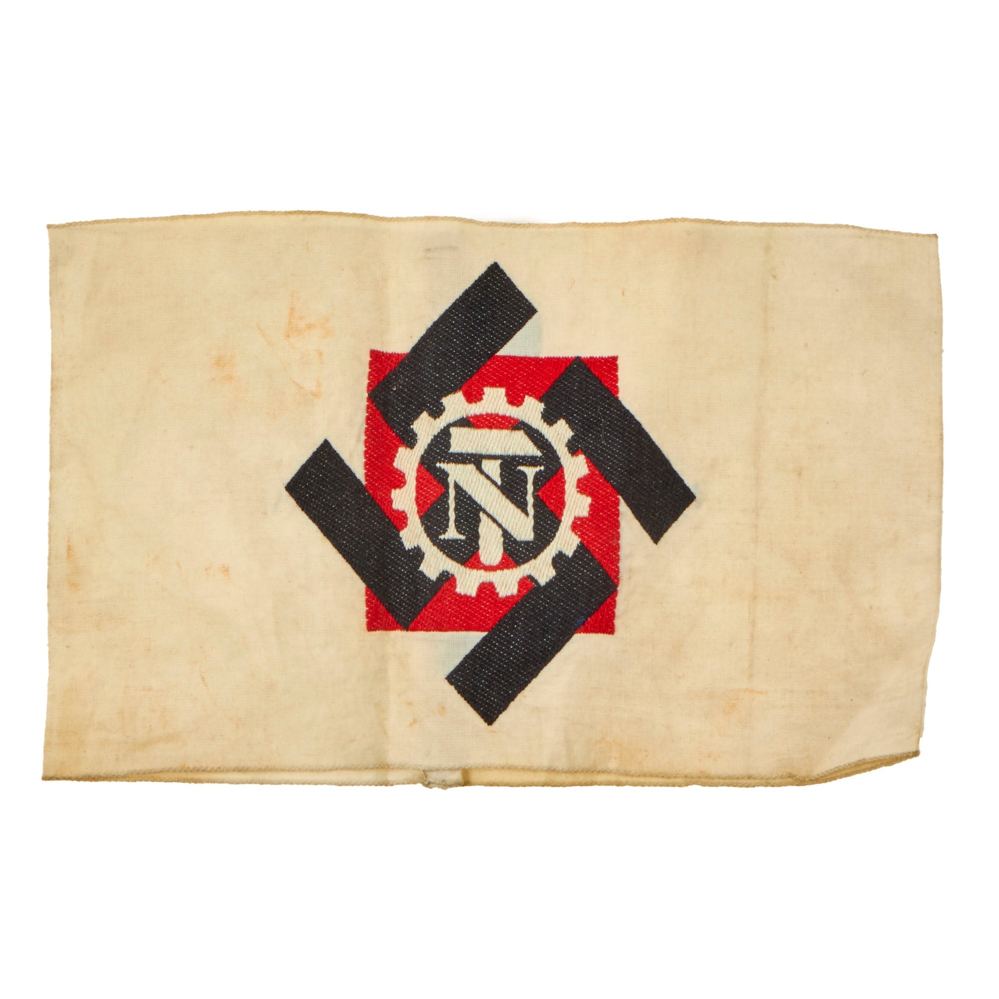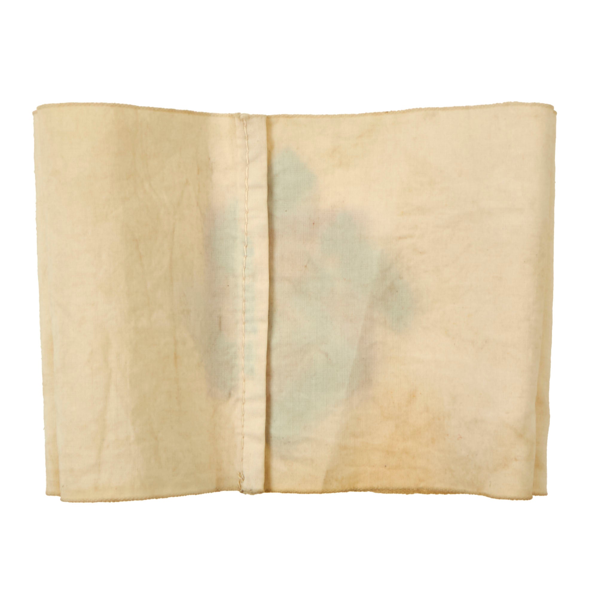 This rayon armband features a lovely BeVo machine embroidered TeNo “Cogwheel” with N and T (hammer) insignia in the center with a black mobile swas (hook cross). It measures approximately 12" x 4", and is sewn together in the back with a French seam, looking to have been taken in more than usual to make a smaller armband. We think we can see a maker marking inside the seam, but it is not legible. The condition is lovely with some period staining present, indicating light use and wear. There is no noticeable major damage present.