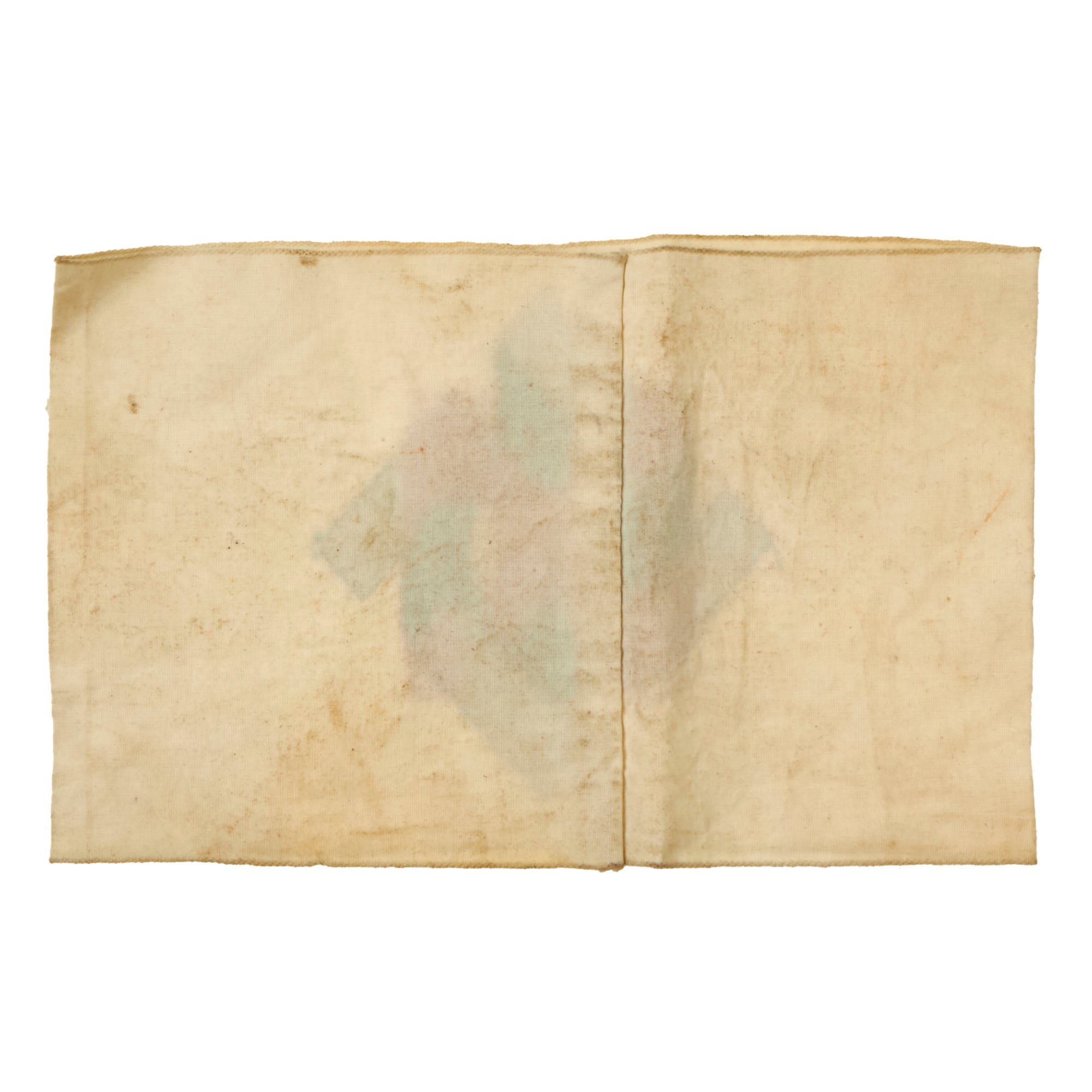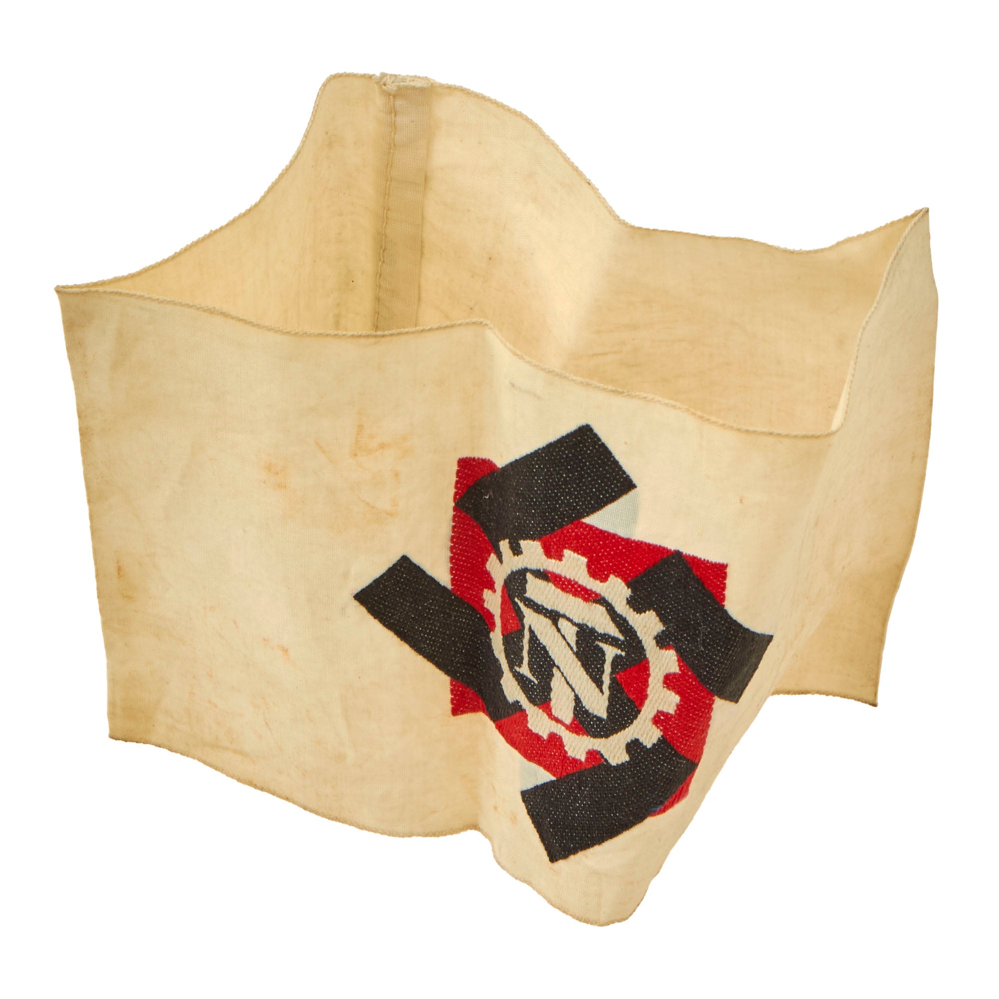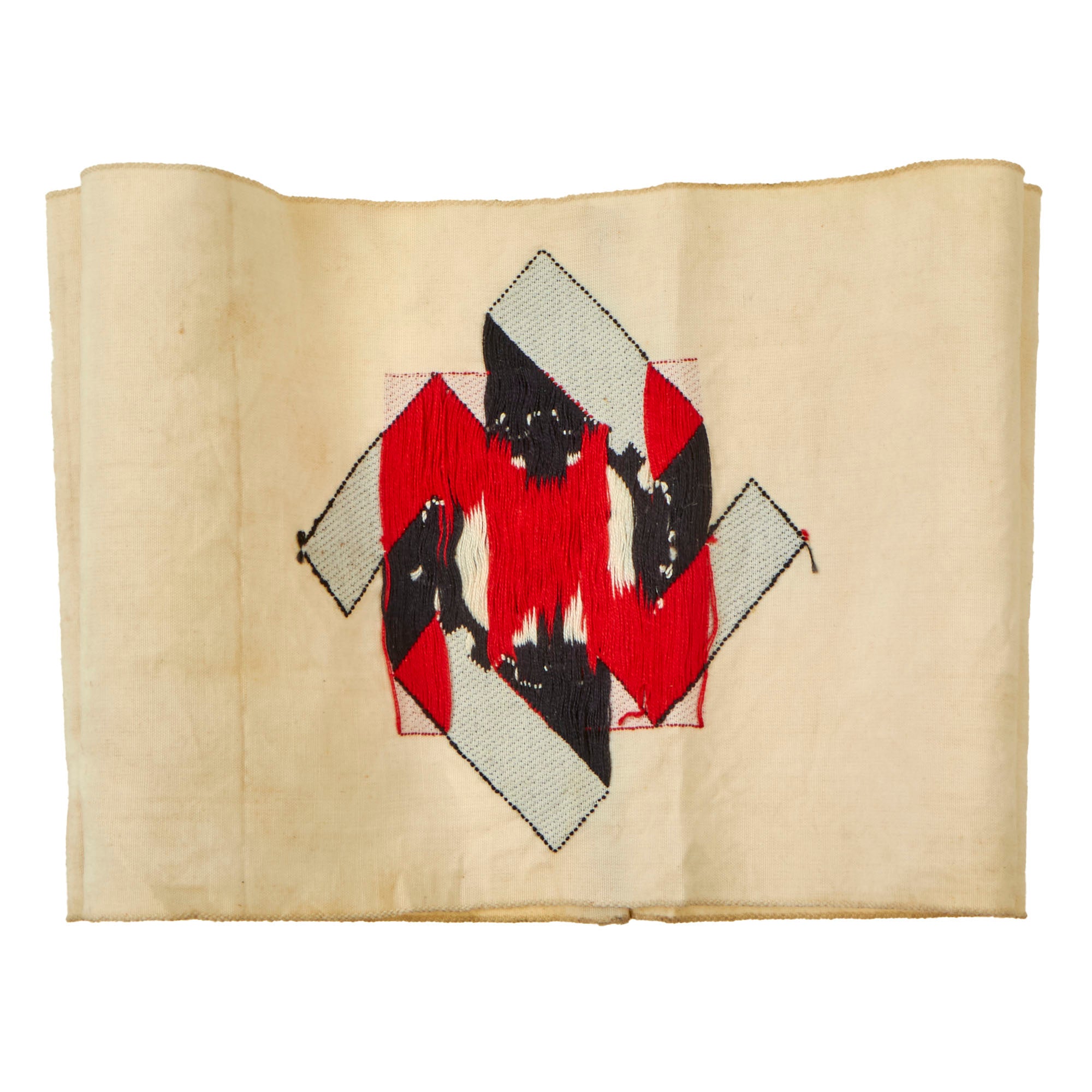 This rayon armband features a lovely BeVo machine embroidered TeNo “Cogwheel” with N and T (hammer) insignia in the center with a black mobile swas (hook cross). It measures approximately 12" x 4", and is sewn together in the back with a French seam, looking to have been taken in more than usual to make a smaller armband. We think we can see a maker marking inside the seam, but it is not legible. The condition is lovely with some period staining present, indicating light use and wear. There is no noticeable major damage present.