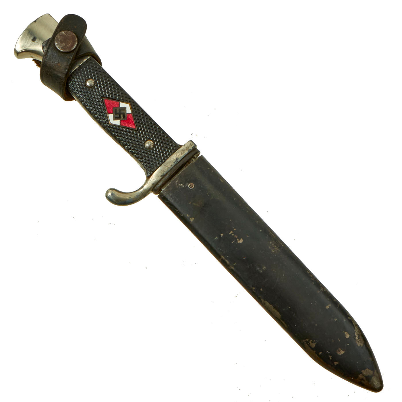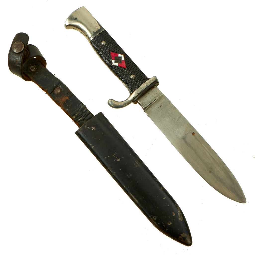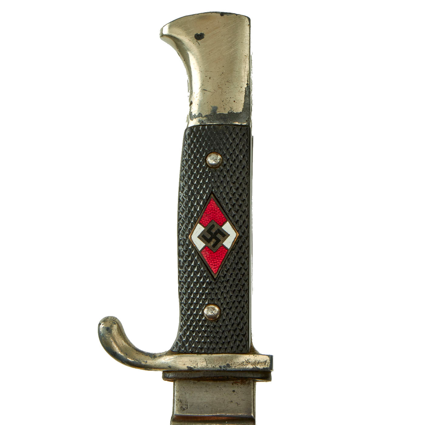 The HJ Leaders were professionals in charge of the training and NSDAP education of the German Youth. They wore a special dagger consisting of silvered hilt fittings with blue-black leather-covered scabbard. The grip was composed of tightly wrapped silver wire, over a wood base. The pommel cap featured an HJ diamond on top, complete with swas. The upper scabbard fitting portrayed an open-winged HJ eagle with swas cut into the bird's chest. The blade was etched with the HJ motto, Blut und Ehre!