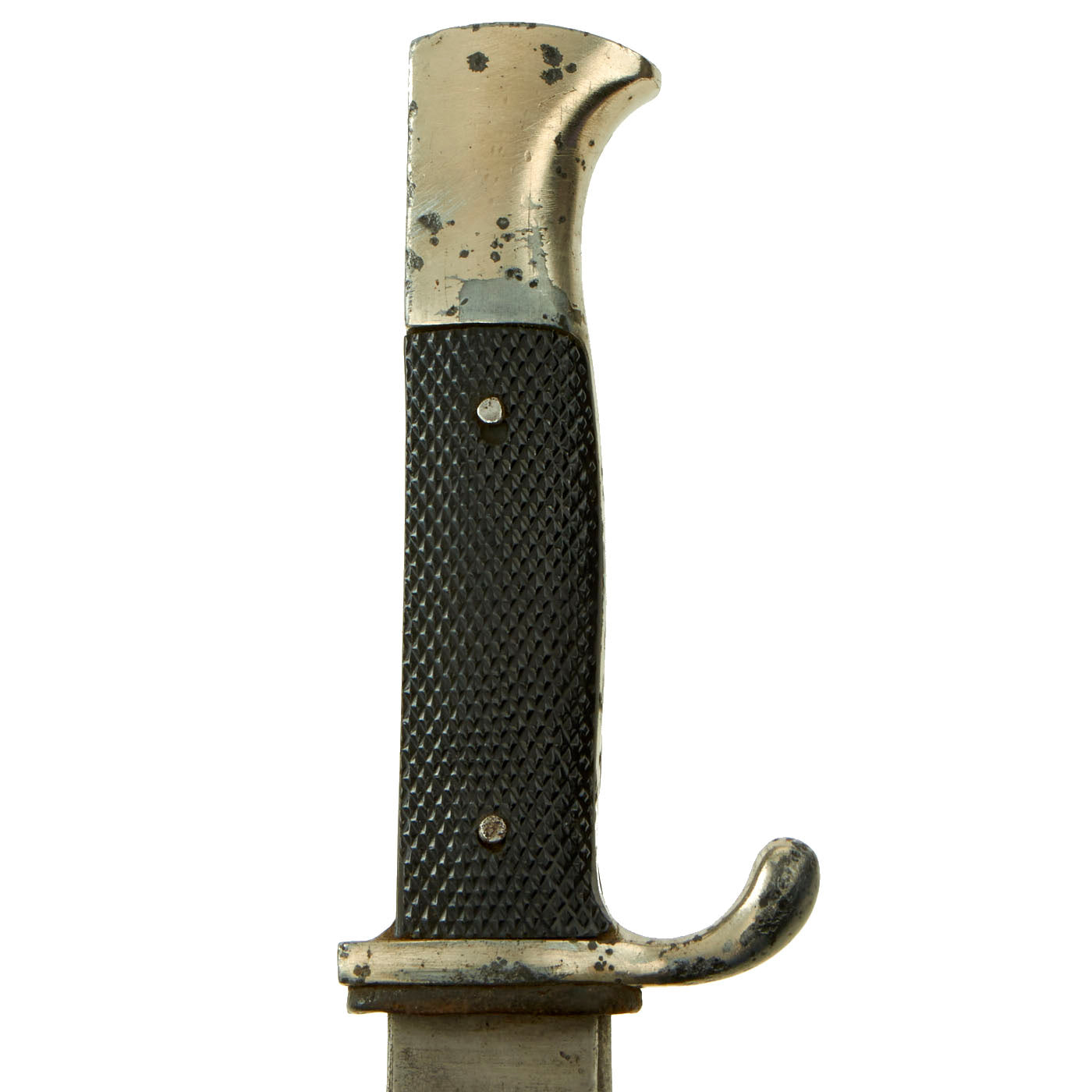 Original Item: Only One Available. This is a good condition Mid-war production HJ Fahrtenmesser (HJ Trip Knife), marked on the blade with both the logo and RZM code of a rare maker C. Lütters & Co., Löwenwerk, of Solingen. This HJ Knife is a solid example of the type, with a handle that is nickel-plated over an alloy base. The plating still remains in nice condition, with over 80% still, with a bit of peppering.