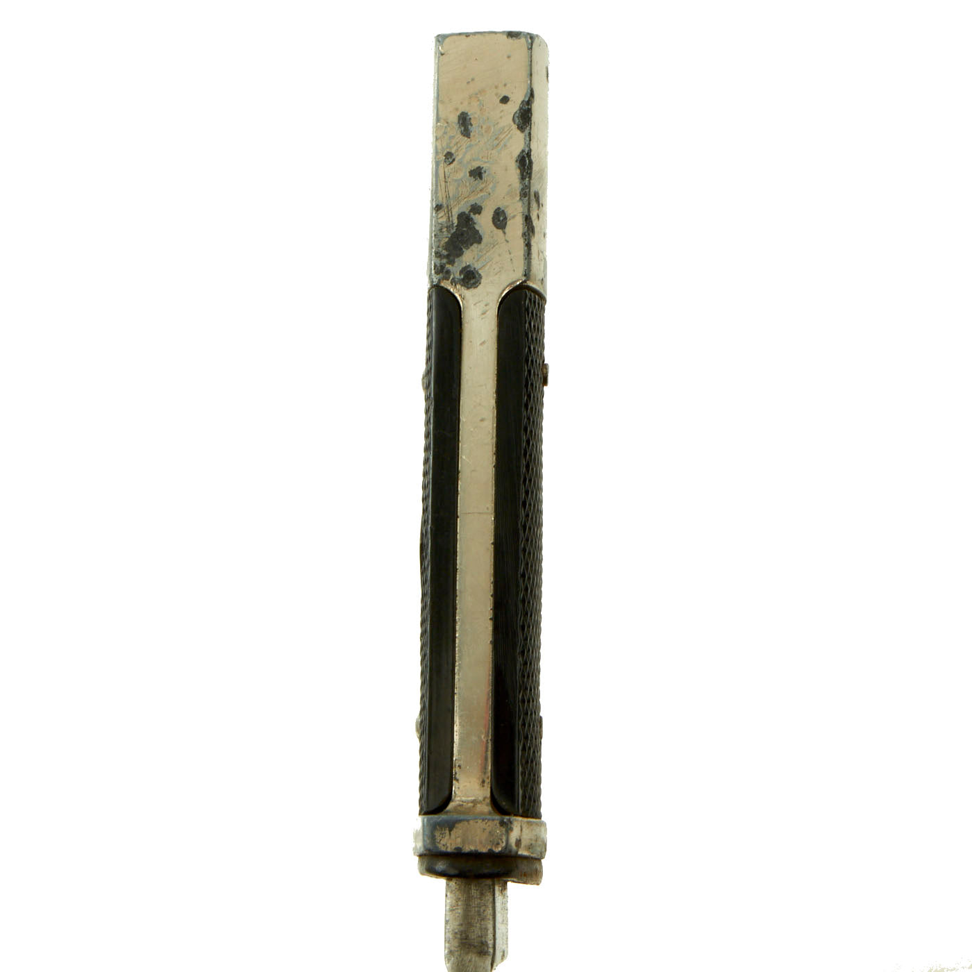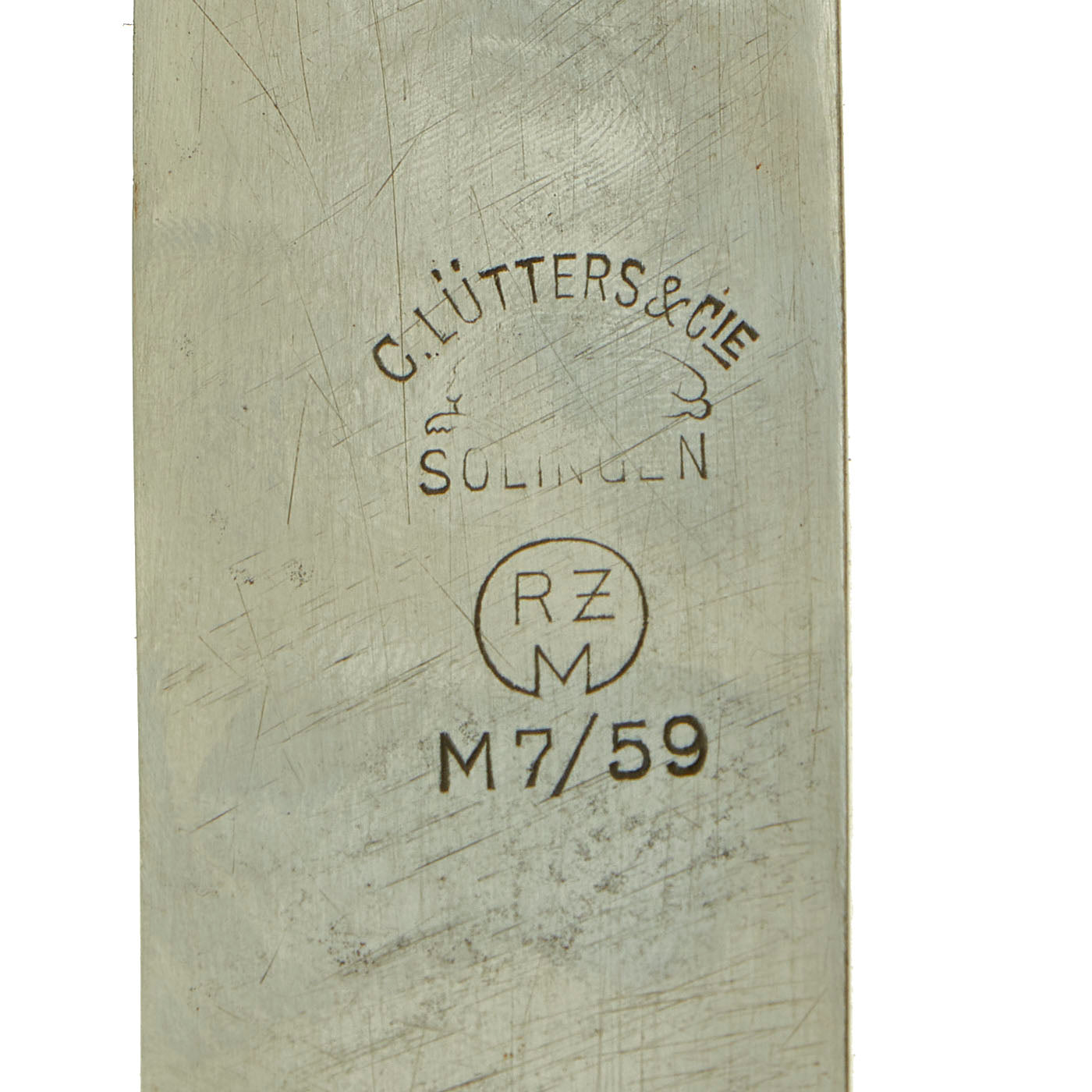 The Reichszeugmeisterei (National Quartermaster Office), or RZM, was was based at the Brown house in Munich and NSDAP party headquarters in Berlin. The RZM ensured that the manufacturers of military items were consistent in design, quality of materials and other characteristics of the items. It also defined standards of design, manufacturing and quality and published an authoritative color chart for textiles. The M7 in the code stands for knives/daggers, contractor 59 stands for firm C. Lütters & Co a small maker from Solingen, the famous "City of Blades" in Western Germany, which marketed many fine edged weapons. The original leather blade buffer is in place, showing just a bit of wear on the edge