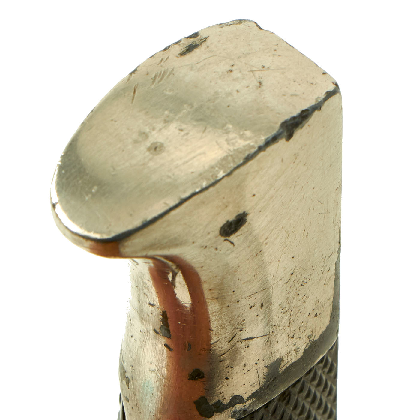 The Bakelite grip plates are closely checkered and in very nice condition, retained by nickel-plated steel rivets with dressed obverse heads. The HJ insignia is in excellent condition, with the original enamel almost 100% retained, and the original silver plating now bearing a lovely tarnished patina. The bakelite shrinks slightly over the years, which is why the logo is a bit sunken in, confirming the authenticity.