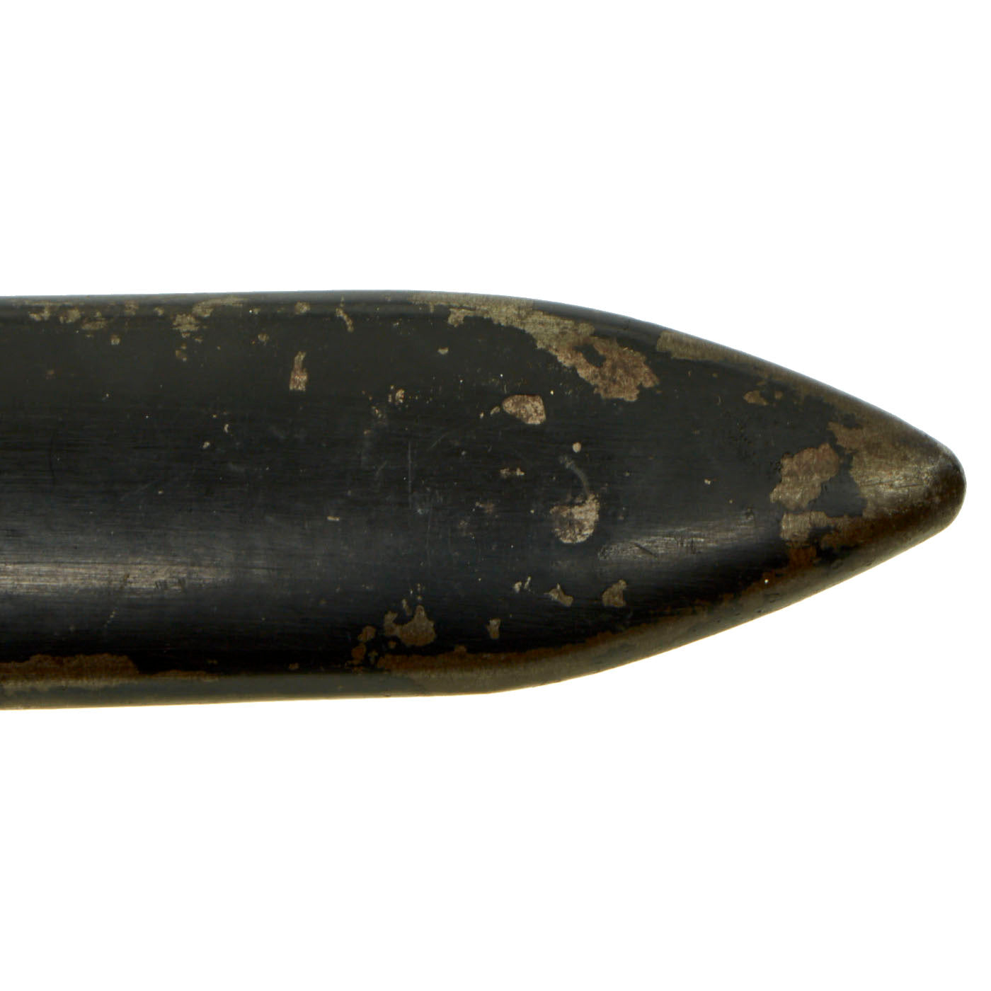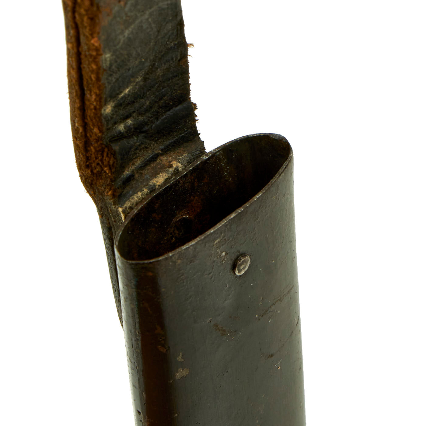 The scabbard shell the typical tapered example with a the standard black enamel finish, which is retained at over 90%. There is crazing and checking, as expected, however only some small areas of missing finish, and no dents that we can see. The leather hanger and belt loop are still in good supple condition, though the black finish is somewhat worn, showing the original brown finish. The retainer loop is intact and has a good working snap, with an intact belt loop.
