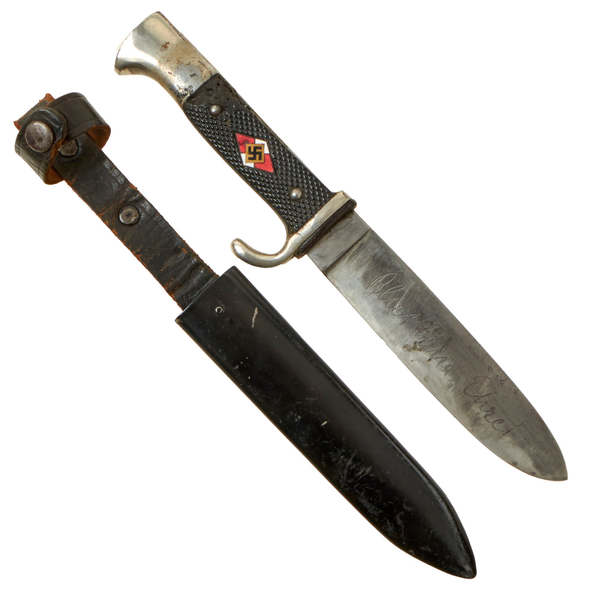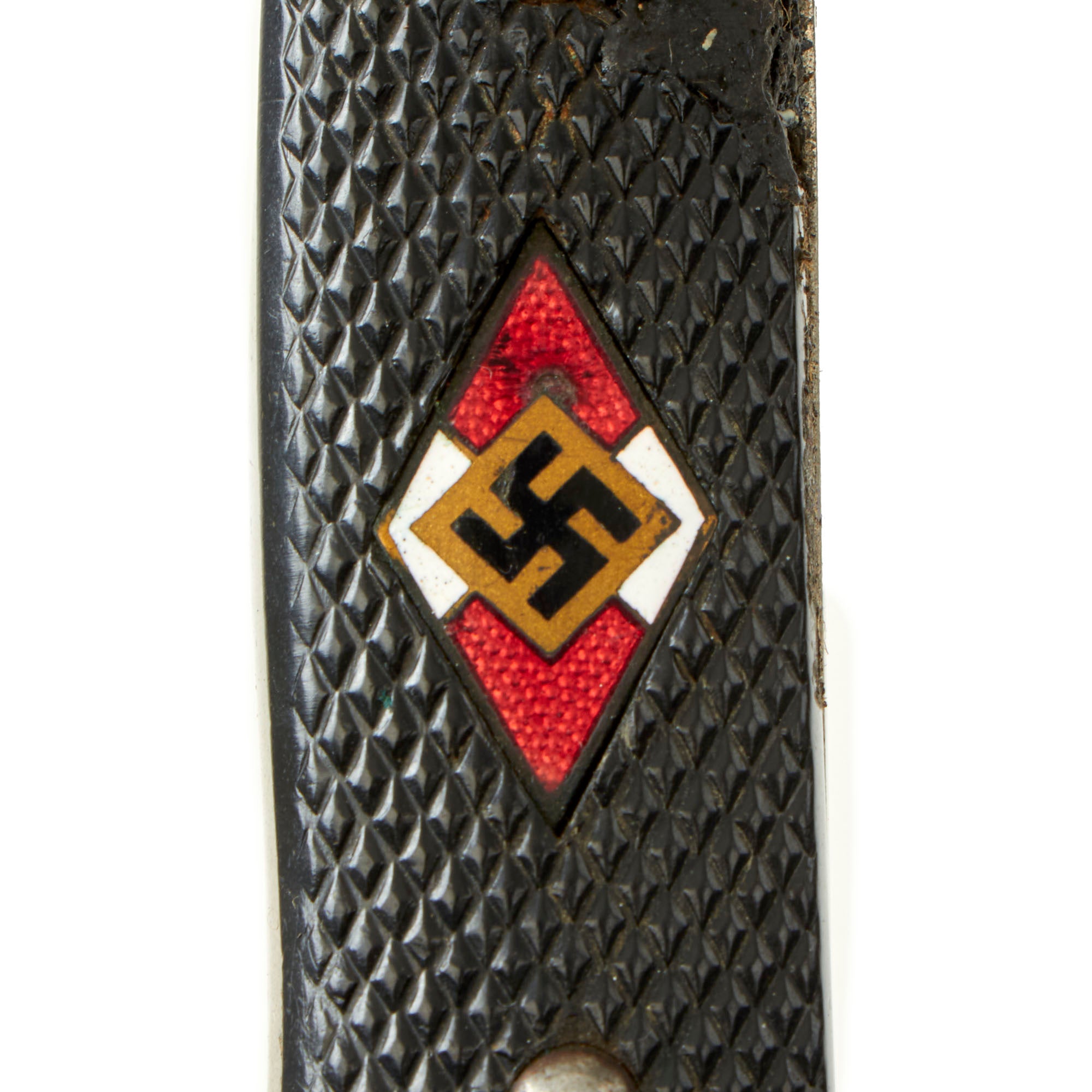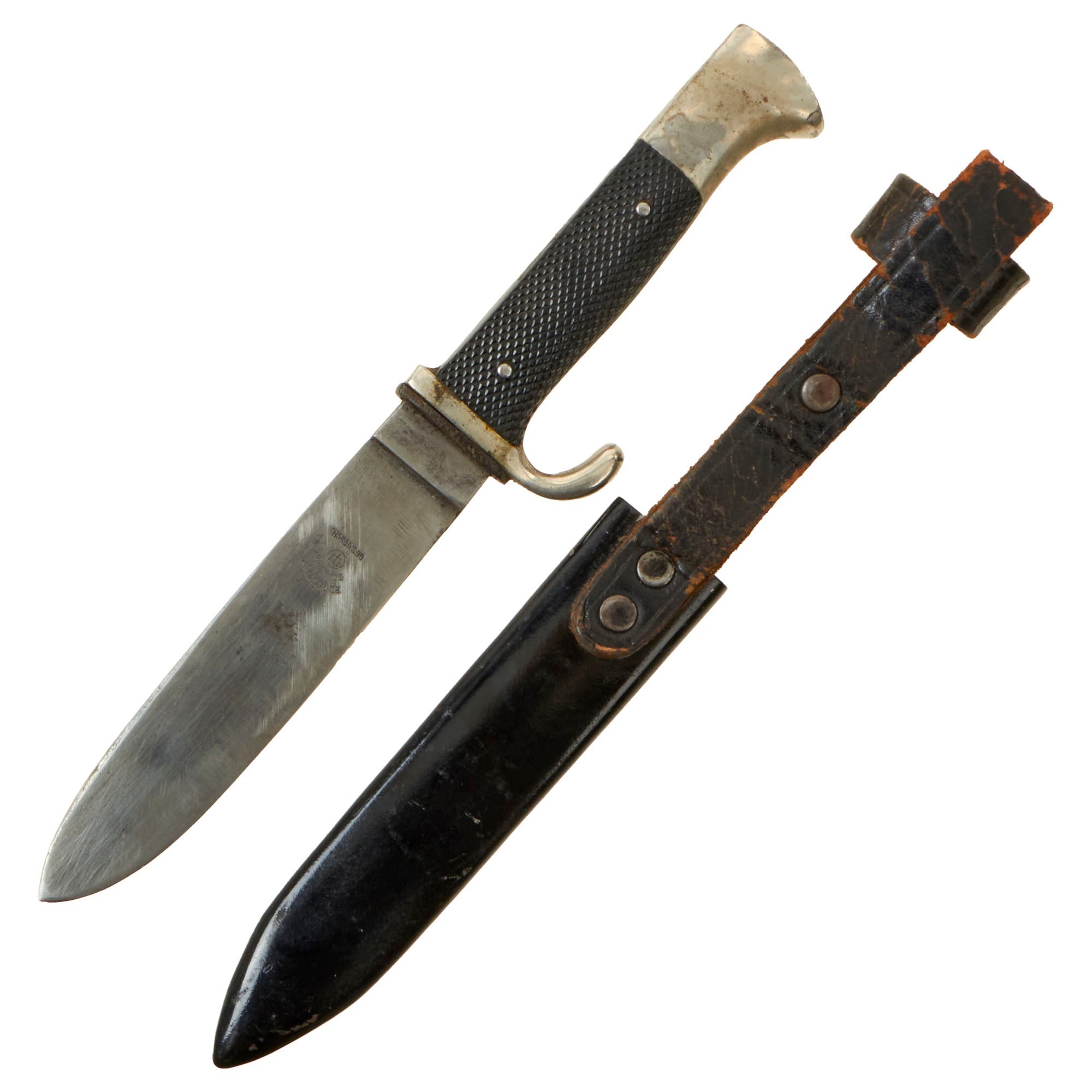 AH believed German youth to be the future of his 3rd Reich. The HJ (AH Jugend) was formed officially in 1935, and with the exception of NSDAP ideology indoctrination was very similar to the Boy Scouts. Beginning at about the age of ten years, both boys (AH Jugend) and girls (Bund Deutscher Mädel) were enlisted in the Party-run organization. The boys only were given HJ Knives after having passed minor exams. The knives had nickeled hilts with black checkered grip plates. The obverse plate was fitted with an enameled HJ swas insignia. Through 1937, these knives were etched with the motto of the organization, Blut und Ehre! (Blood and Honor!). Examples produced after this date were made with plain blades usually bearing an RZM marking.
