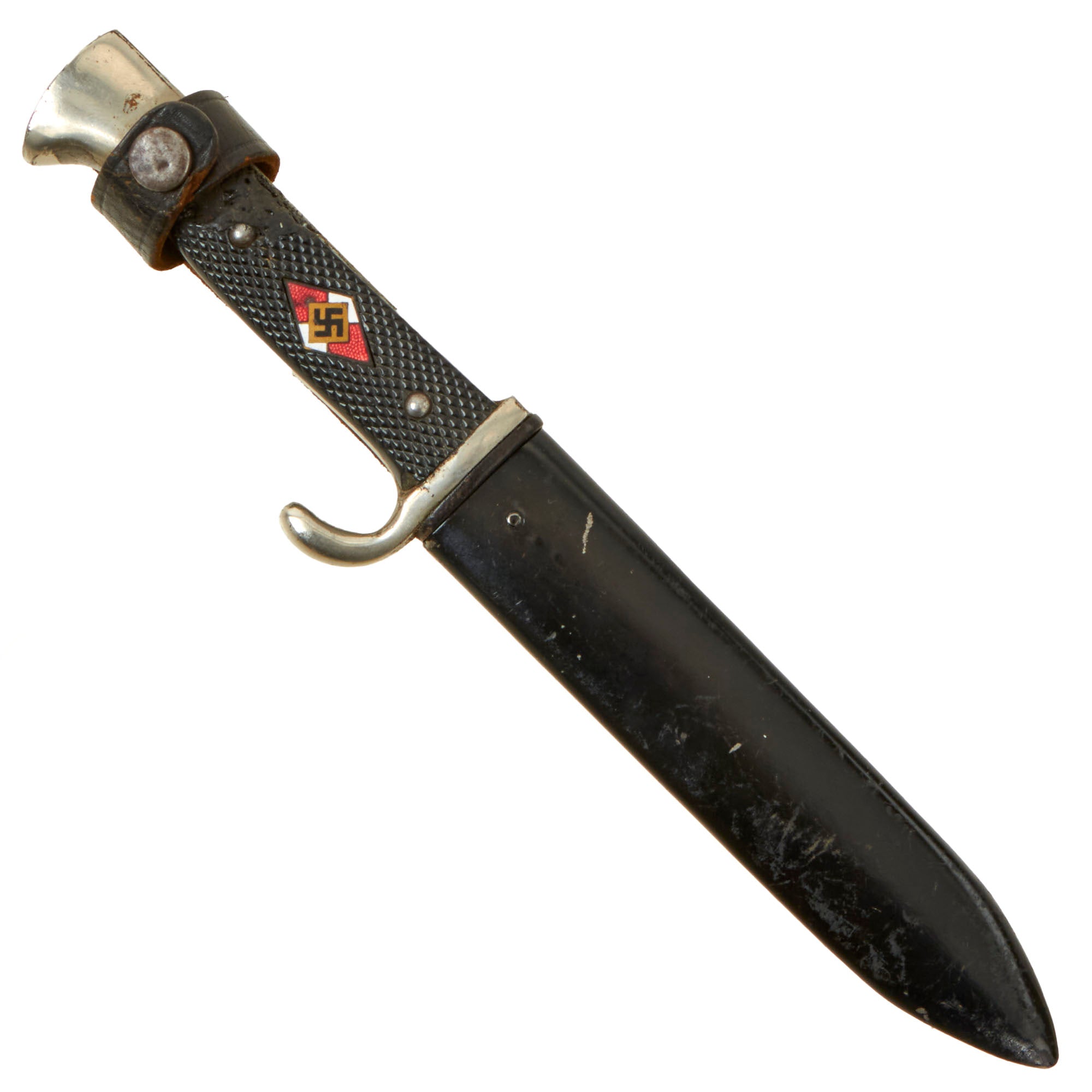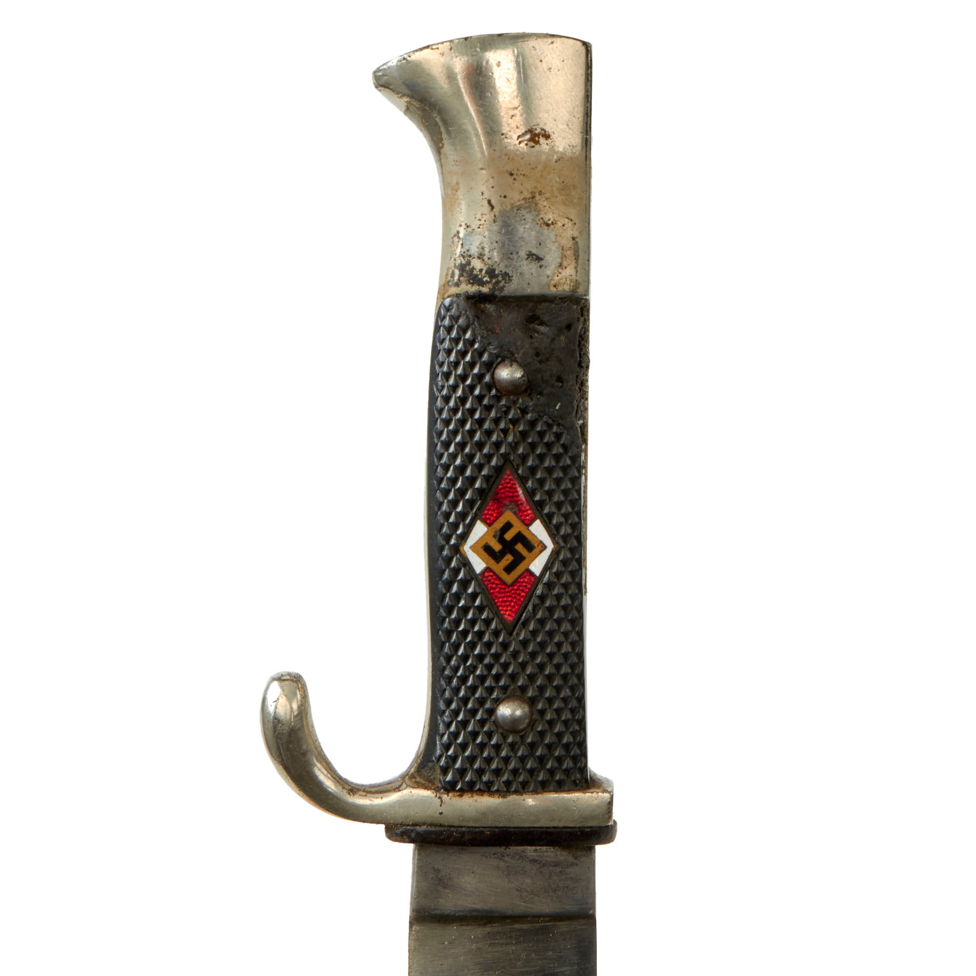 The HJ Leaders were professionals in charge of the training and NSDAP education of the German Youth. They wore a special dagger consisting of silvered hilt fittings with blue-black leather-covered scabbard. The grip was composed of tightly wrapped silver wire, over a wood base. The pommel cap featured an HJ diamond on top, complete with swas. The upper scabbard fitting portrayed an open-winged HJ eagle with swas cut into the bird's chest. The blade was etched with the HJ motto, Blut und Ehre!